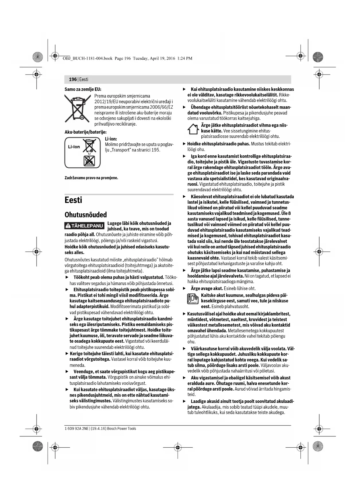 - piiratud jõudlus temperatuuril <0 °C** (audioallika puhul SD-/MMC-kaart või USB)Tehnilised andmed tehtud kindlaks tarnekomplekti kuuluvat akut kasutades. OBJ_BUCH-1181-004.book Page 197 Tuesday, April 19, 2016 1:24 PM198 | Eesti 1 609 92A 2NE | (19.4.16) Bosch Power Tools Montaaž Ehitusplatsiraadio toide Ehitusplatsiraadio saab toite elektrivõrgust või akupessa 11 paigaldatud Li-ioon-akult. Kui toiteallikaks on aku, on kasuta- tavad üksnes audiorežiim ja väliste seadmete varustamine vooluga integreeritud USB-liidese kaudu. Pöörake tähelepanu võrgupingele! Võrgupinge peab vastama ehitusplatsiraadio andmesildil märgitud pingele. 230 V ehitusplatsiraadiot võib kasutada ka 220 V võrgu- pinge korral. Aku paigaldamine ja eemaldamine (vt joonist A) Märkus: Ehitusplatsiraadioga mittesobivate akude kasutami- ne võib põhjustada häireid raadio töös või raadiot kahjustada. Avage lukustushoob 12 akukorpuses („Battery Bay“) ja tõm- make akukorpuse kaas 13 lahti. Asetage aku akupessa 11 nii, et aku ühendused on akupesas 11 olevate ühendustega kohakuti ja laske akul kohale fikseeruda. Kui aku on paigaldatud, süttib ekraanil näit l. Aku tühjenemisel hakkab näit vilkuma. Kui aku temperatuur on töötamiseks lubatust kõrgem või ma- dalam, süttib ekraanil temperatuuri hoiatustuli k. Enne ehi- tusplatsiraadio sisselülitamist oodake, kuni aku temperatuur on lubatud vahemikus. Aku 14 mahavõtmiseks vajutage aku vabastusklahvile ja tõm- make aku akupesast 11 välja. Pange akukorpuse kaas 13 pärast aku paigaldamist või maha- võtmist kinni. Akukorpuse kaane lukustamiseks kinnitage lu- kustushoob 12 korpuse külge ja suruge alla. Aku laadimine Kasutage üksnes tehnilistes andmetes loetletud laadi- misseadmeid. Vaid need laadimisseadmed sobivad ehi- tusplatsiraadios kasutada lubatud liitium-ioonakude laadi- miseks. Märkus: Aku on tarnimisel osaliselt laetud. Et tagada aku täit mahtuvust, laadige aku enne esmakordset kasutamist akulaa- dimisseadmes täiesti täis. Li-ioon-akut võib laadida igal ajal, ilma et see lühendaks aku kasutusiga. Laadimise katkestamine ei kahjusta akut. Puhverpatareide paigaldamine/vahetamine (vt joonist A) Selleks et ehitusplatsiraadios oleks võimalik salvestada kella- aega, tuleb paigaldada puhverpatareid. Soovitav on leelis- mangaan-patareide kasutamine. Avage lukustushoob 12 akukorpuses („Battery Bay“) ja tõm- make akukorpuse kaas 13 lahti. Vajaduse korral võtke aku 14 välja. Patareikorpuse kaane 7 avamiseks vajutage lukustusele 6 ja tõmmake patareikorpuse kaas lahti. Paigaldage puhverpata- reid. Jälgige seejuures patareide õiget polaarsust vastavalt patareikorpuse siseküljel toodud sümbolitele. Pange puhverpatareikorpuse kaas 7 uuesti kinni. „REPLACE AA BATTERY WHEN UNIT NO LONGER KEEPS CORRECT TIME“: Kui ehitusplatsiraadio ei salvesta enam kel- laaega, vahetage puhverpatareid välja. Vahetage alati välja kõik patareid ühekorraga. Kasutage üks- nes ühe tootja ja ühesuguse mahtuvusega patareisid. Võtke puhverpatareid ehitusplatsiraadiost välja, kui Te ei kasuta raadiot pikemat aega. Puhverpatareid võivad pikemal seismisel korrodeeruda ja iseeneslikult tühjeneda. Kasutus Ärge jätke ehitusplatsiraadiot niiskuse ja otsese päike- sepaiste kätte. Audiorežiim (vt jooniseid B ja C) Audiorežiimi sisse-/väljalülitamine Audiorežiimi (raadio ja välised muusika mahamängimise seadmed) sisselülitamiseks vajutage sisse-/väljalülitusnu- pule 26. Ekraan 27 aktiveerub ja kõlama hakkab ehitusplatsi- raadio viimase väljalülitamise ajal seadistatud heliallikas. Kui ehitusplatsiraadio on energiasäästurežiimil (vt „Ener- giasäästurežiim“, lk 201), vajutage audiorežiimi sisselülitami- seks sisse-/väljalülitusnupule 26 kaks korda. Audiorežiimi väljalülitamiseks vajutage uuesti sisse-/väljalüli- tusnupule 26. Seadistatud heliallikas salvestatakse. Energia säästmiseks lülitage ehitusplatsiraadio sisse vaid siis, kui seda kasutate. Helitugevuse reguleerimine Helitugevuse suurendamiseks keerake nuppu „Volume“ 25 päripäeva, helitugevuse vähendamiseks keerake nuppu vas- tupäeva. Reguleeritud helitugevust (vahemikus 0 kuni 20) ku- vatakse mõne sekundi jooksul ekraani näidikul d. Ümbritseva keskkonna lubatud temperatuur –laadimisel – töötamisel* – säilitamisel
