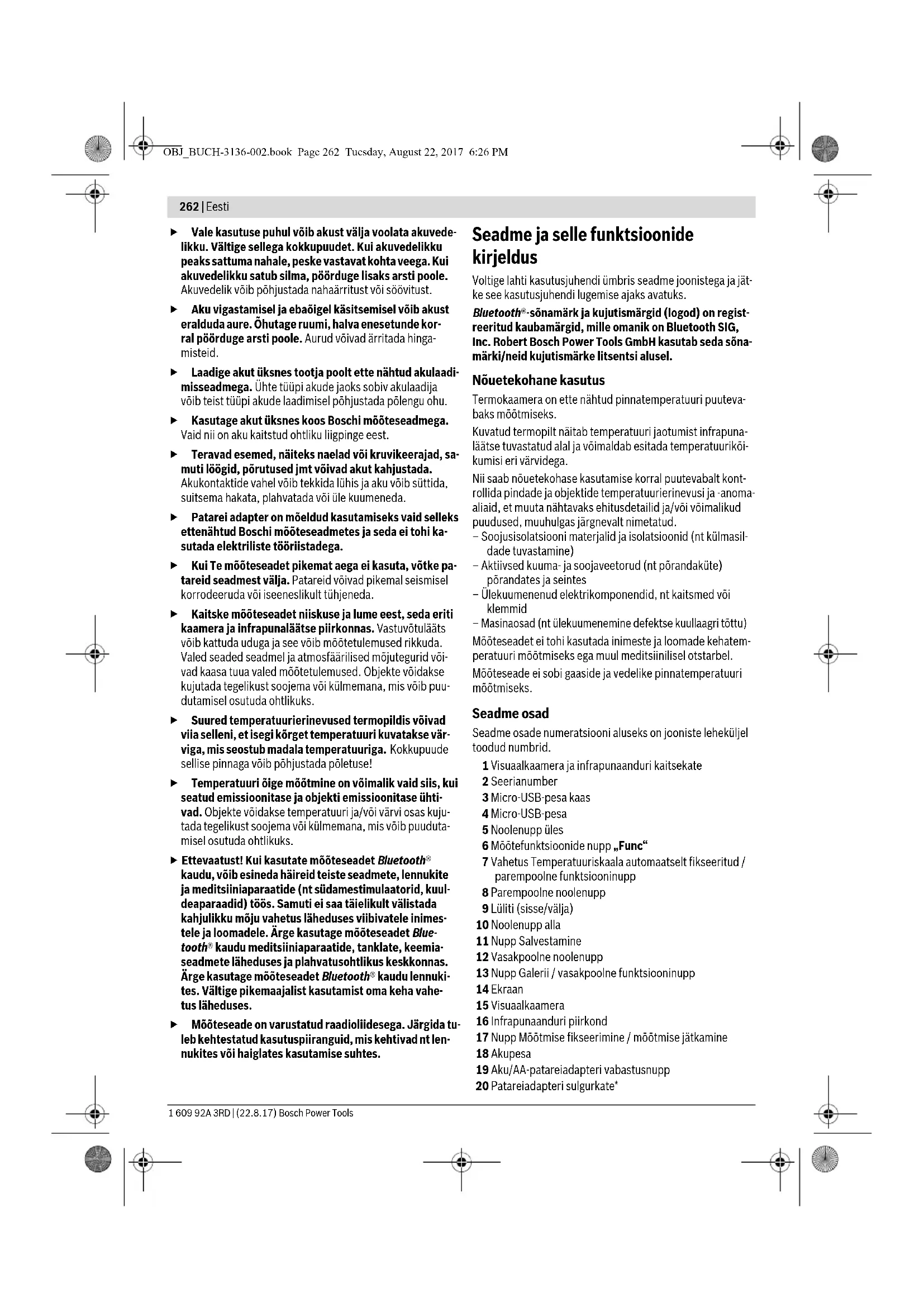 30 5,1 x 3,8 OBJ_BUCH-3136-002.book Page 260 Tuesday, August 22, 2017 6:26 PMEesti | 261 Bosch Power Tools 1 609 92A 3RD | (22.8.17) Održavanje i servisiranje Održavanje i čišćenje Mjerni alat skladištite i transportirajte samo u odgovarajućoj kutiji kao što je originalna ambalaža odn. zaštitna torba (pri- bor). Nemojte lijepiti naljepnice u blizini infracrvenog senzora na mjernom alatu. Mjerni alat održavajte uvijek čistim. Pri čišćenju niti najmanje tekućine ne smije ući u mjerni alat. Nemojte pokušavati ukloniti prljavštinu sa senzora, s kamere ili s prijemne leće pomoću šiljastih predmeta i nemojte brisati kameru i prijemnu leću (opasnost od ogrebotina). Ako želite ponovno kalibrirati mjerni alat, obratite se Bosch servisnom centru (za adrese vidjeti odlomak »Servisiranje i savjetovanje o primjeni«). U slučaju popravke, mjerni alat pošaljite u originalnom pako- vanju ili zaštitnoj torbi (pribor). Integriranu dugmastu bateriju smije vaditi samo stručno oso- blje u svrhu zbrinjavanja. Otvaranjem obloge kućišta možete uništiti mjerni alat. Odvrnite vijke na kućištu i skinite oblogu kućišta kako biste izvadili dugmastu bateriju. Servisiranje i savjetovanje o primjeni Ovlašteni servis će odgovoriti na vaša pitanja o popravcima i održavanju vašeg proizvoda te o rezervnim dijelovima. Pove- ćane crteže i informacije o rezervnim dijelovima možete naći na adresi: www.bosch-pt.com Bosch tim za savjetovanje o primjeni rado će vam pomoći odgovorom na pitanja o našim proizvodima i priboru. Za slučaj povratnih upita ili naručivanja rezervnih dijelova, molimo vas neizostavno navedite 10-znamenkasti kataloški broj sa tipske pločice proizvoda. Hrvatski Robert Bosch d.o.o PT/SHR-BSC Kneza Branimira 22 10040 Zagreb Tel.: +385 12 958 051 Fax: +385 12 958 050 E-Mail: RBKN-bsc@hr.bosch.com www.bosch.hr Bosnia Elektro-Servis Vl. Mehmed Nalić Dzemala Bijedića bb 71000 Sarajevo Tel./Fax: +387 33454089 E-Mail: bosch@bih.net.ba Transport Li-ionske aku-baterije koje se koriste, podliježu zahtjevima pro- pisa za transport opasnih tvari. Aku-baterije korisnik može bez posebnih mjera zaštite transportirati cestovnim transportom. Ako transport obavlja treća strana (npr. zračni transport ili špedicija), treba se pridržavati posebnih zahtjeva na ambala- žu i označavanje. Kod pripreme pošiljke za transport treba za- tražiti savjet stručnjaka za transport opasnih tvari. Aku-baterije transportirajte ako njihovo kućište nije ošteće- no. Oblijepite izložene kontakte i zapakirajte aku-bateriju tako da se ne može pomicati u ambalaži. Molimo pridržavajte se eventualno važećih propisa zemlje korisnika. Zbrinjavanje Mjerne alate, aku-baterije/baterije, pribor i pakovanja treba predati na reciklažu koja je u sukladu sa zašti- tom životne sredine. Mjerni alat, aku-bateriju/baterije ne bacajte u kućni otpad! Samo za zemlje EU: Prema Europskim smjernicama 2012/19/EU, neuporabivi mjerni alati i prema Smjernicama 2006/66/EZ neispravne ili istrošene aku-baterije/baterije moraju se odvojeno sakupljati i dovesti na ekološki prihvatljivo recikliranje. Aku-baterije/baterije: Li-ion: Molimo pridržavajte se uputa u poglavlju »Transport« na stranici 261. Zadržavamo pravo na promjene. Eesti Ohutusnõuded Lugege läbi kõik juhised ja järgige neid. Kui mõõteseadme kasutamisel käesolevaid juhi- seid ei järgita, võivad mõõteseadmesse integ- reeritud kaitseseadised kahjustada saada. HOIDKE JUHISED HOOLIKALT ALLES. Laske mõõteseadet parandada üksnes vastava ala asjatundjatel, kes kasutavad originaalvaruosi. Nii taga- te mõõteseadme ohutu töö. Ärge kasutage mõõteseadet plahvatusohtlikus kesk- konnas, kus leidub süttivaid vedelikke, gaase või tol- mu. Mõõteseadmes võivad tekkida sädemed, mille toimel võib tolm või aur süttida. Eemaldage seadmest aku või patareid enne mis tahes tööd seadme kallal (nt hooldus, tarvikute vahetus jmt), samuti enne seadme transportimist ja hoiulepanekut. Ärge avage akut. Esineb lühise oht. Kaitske akut kuumuse, sealhulgas pideva päi- kesekiirguse, tule, vee ja niiskuse eest. Esineb plahvatusoht. Kasutusvälisel ajal hoidke akut eemal kirjaklambritest, müntidest, võtmetest, naeltest, kruvidest ja teistest väikestest metallesemetest, mis võivad aku kontaktid omavahel ühendada. Lühis aku kontaktide vahel tekitab põlengu ohu. OBJ_BUCH-3136-002.book Page 261 Tuesday, August 22, 2017 6:26 PM262 | Eesti 1 609 92A 3RD | (22.8.17) Bosch Power Tools Vale kasutuse puhul võib akust välja voolata akuvede- likku. Vältige sellega kokkupuudet. Kui akuvedelikku peaks sattuma nahale, peske vastavat kohta veega. Kui akuvedelikku satub silma, pöörduge lisaks arsti poole. Akuvedelik võib põhjustada nahaärritust või söövitust. Aku vigastamisel ja ebaõigel käsitsemisel võib akust eralduda aure. Õhutage ruumi, halva enesetunde kor- ral pöörduge arsti poole. Aurud võivad ärritada hinga- misteid. Laadige akut üksnes tootja poolt ette nähtud akulaadi- misseadmega. Ühte tüüpi akude jaoks sobiv akulaadija võib teist tüüpi akude laadimisel põhjustada põlengu ohu. Kasutage akut üksnes koos Boschi mõõteseadmega. Vaid nii on aku kaitstud ohtliku liigpinge eest. Teravad esemed, näiteks naelad või kruvikeerajad, sa- muti löögid, põrutused jmt võivad akut kahjustada. Akukontaktide vahel võib tekkida lühis ja aku võib süttida, suitsema hakata, plahvatada või üle kuumeneda. Patarei adapter on mõeldud kasutamiseks vaid selleks ettenähtud Boschi mõõteseadmetes ja seda ei tohi ka- sutada elektriliste tööriistadega. Kui Te mõõteseadet pikemat aega ei kasuta, võtke pa- tareid seadmest välja. Patareid võivad pikemal seismisel korrodeeruda või iseeneslikult tühjeneda. Kaitske mõõteseadet niiskuse ja lume eest, seda eriti kaamera ja infrapunaläätse piirkonnas. Vastuvõtulääts võib kattuda uduga ja see võib mõõtetulemused rikkuda. Valed seaded seadmel ja atmosfäärilised mõ
