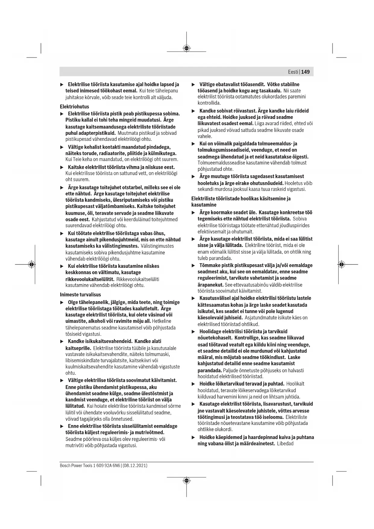 Razmak noževa a trebao bi iznositi 10% maksimalne debljine lima (npr. 0,1mm razmak noževa na 1mm debljine lima). Za rezanje mekših ili žilavijih materijala razmak noževa a se mora smanjiti, a za rezanje tvrdih ili krhkih materijala mora se povećati. Otpustite vijak za pričvršćivanje(10) donjeg noža. Vijkom za namještanje(9) namjestite potreban razmak noževa a. Gornji nož(7) i donji nož(8) ne smiju se dodirivati. Razmak provjerite standardnom šablonom za namještanje. Ponovno stegnite vijak za pričvršćivanje(10) donjeg noža zateznim momentom od 3–4Nm. Zaštita od preopterećenja ovisna o temperaturi Kod namjenske uporabe se električni alat ne može preopteretiti. Kod prevelikog opterećenja ili napuštanja područja dopuštene temperature aku-baterije broj hodova će se smanjiti ili će se električni alat isključiti. Kod smanjenog broja hodova električni alat radi tek nakon postizanja dopuštene temperature aku-baterije s punim brojem hodova. Kod automatskog isključivanja isključite električni alat, ostavite aku-bateriju da se ohladi i ponovno uključite električni alat. Napomene za optimalno rukovanje aku-baterijom Zaštitite aku-bateriju od vlage i vode. Aku-bateriju čuvajte samo u prostoriji u kojoj je raspon temperature od –20 °C do 50 °C. Npr. aku-bateriju ljeti na ostavljajte u automobilu. Otvore za hlađenje aku-baterije redovito čistite mekim, čistim i suhim kistom. Bitno skraćenje vremena rada nakon punjenja pokazuje da je aku-baterija istrošena i da je treba zamijeniti. Pridržavajte se uputa za zbrinjavanje u otpad. Održavanje i servisiranje Održavanje i čišćenje u Prije svih radova na električnom alatu (npr. održavanje, zamjena alata, itd.), kao i kod njegovog transporta i spremanja, aku-bateriju treba izvaditi iz Bosch Power Tools 1 609 92A 6N6 | (08.12.2021)148 | Eesti električnog alata. Kod nehotičnog aktiviranja prekidača za uključivanje/isključivanje postoji opasnost od ozljeda. u Električni alat i otvore za hlađenje održavajte čistima kako bi se moglo dobro i sigurno raditi. Zamjena noževa (vidjetislikuA) Gornji nož(7) i donji nož(8) su jednaki, imaju po četiri ruba reza i mogu se međusobno zamijeniti. Pravovremeno okrenite odnosno zamijenite noževe jer samo oštri radni alati daju dobar učinak rezanja i čuvaju električni alat. Za zamjenu gornjeg noža(7) otpustite vijak za pričvršćivanje(6), a za zamjenu donjeg noža(8) vijak za pričvršćivanje(10). Okrenite nož za 90° ili umetnite novi nož. Pri umetanju donjeg noža(8) pazite da nalegne na vijak za namještanje (9). Napomena: Okrenite nož samo u smjeru prikazanom na sliciA odnosno umetnite novi nož u položaj prikazan na slici. S pogrešno umetnutim nožem ne može se rezati. Ponovno stegnite vijak za pričvršćivanje(6) gornjeg noža odn. vijak za pričvršćivanje(10) donjeg noža zateznim momentom od 3–4Nm. Provjerite razmak noževa a kako je gore opisano. Gornji nož(7) i donji nož(8) ne smiju se naknadno naoštriti. Servisna služba i savjeti o uporabi Naša servisna služba će odgovoriti na vaša pitanja o popravku i održavanju vašeg proizvoda, kao i o rezervnim dijelovima. Crteže u rastavljenom obliku i informacije o rezervnim dijelovima možete naći i na našoj adresi: www.bosch-pt.com Tim Bosch savjetnika o uporabi rado će odgovoriti na vaša pitanja o našim proizvodima i njihovom priboru. U slučaju upita ili naručivanja rezervnih dijelova, molimo vas obavezno navedite 10‑znamenkasti kataloški broj s tipske pločice proizvoda. Hrvatski Robert Bosch d.o.o PT/SHR-BSC Kneza Branimira 22 10040 Zagreb Tel.: +385 12 958 051 Fax: +385 12 958 050 E-Mail: RBKN-bsc@hr.bosch.com www.bosch.hr Ostale adrese servisa možete pronaći na: www.bosch-pt.com/serviceaddresses Transport Preporučene litij-ionske aku-baterije podliježu zakonu o transportu opasnih tvari. Korisnik bez ikakvih preduvjeta može transportirati aku-baterije cestovnim transportom. Ako transport obavlja treća strana (npr. transport zrakoplovom ili špedicija), treba se pridržavati posebnih zahtjeva za ambalažu i označavanje. Kod pripreme ovakvih pošiljki za transport prethodno se treba savjetovati sa stručnjakom za transport opasnih tvari. Aku-bateriju šaljite nekim transportnim sredstvom samo ako je njezino kućište neoštećeno. Oblijepite otvorene kontakte i zapakirajte aku-bateriju tako da se ne može pomicati u ambalaži. Pridržavajte se i eventualnih dodatnih nacionalnih propisa. Zbrinjavanje Električne alate, aku-baterije, pribor i ambalažu treba dovesti na ekološki prihvatljivo recikliranje. Električni alat i aku-baterije/baterije ne bacajte u kućni otpad! Samo za zemljeEU: Sukladno europskoj Direktivi 2012/19/EU električni alati koji više nisu uporabivi i sukladno europskoj Direktivi 2006/66/EZ neispravne ili istrošene aku-baterije moraju se odvojeno sakupljati i dovesti na ekološki prihvatljivo recikliranje. Aku-baterije/baterije: Litij-ionske: Pridržavajte se uputa u poglavlju Transport (vidi „Transport“, Stranica148). Eesti Ohutusnõuded Üldised ohutusnõuded elektriliste tööriistade kasutamisel HOIATUS Lugege läbi kõik tööriistaga kaasas olevad ohutusnõuded ja juhised ning tutvuge kõigi jooniste ja spetsifikatsioonidega. Ohutusnõuete ja juhiste eiramise tagajärjeks võib olla elektrilöök, tulekahju ja/või rasked vigastused. Hoidke kõik ohutusnõuded ja juhised edasiseks kasutamiseks hoolikalt alles. Ohutusnõuetes sisalduv mõiste "elektriline tööriist" käib nii vooluvõrku ühendatud (juhtmega) elektriliste tööriistade kui ka akutoitega (juhtmeta) elektriliste tööriistade kohta. Ohutusnõuded tööpiirkonnas u Hoidke tööpiirkond puhas ja hästi valgustatud. Korrastamata või valgustamata töökoht võib põhjustada õnnetusi. u Ärge kasutage elektrilist tööriista plahvatusohtlikus keskkonnas, kus leidub tuleohtlikke vedelikke, gaase või tolmu. Elektrilistest tööriistadest lööb sädemeid, mis võivad 