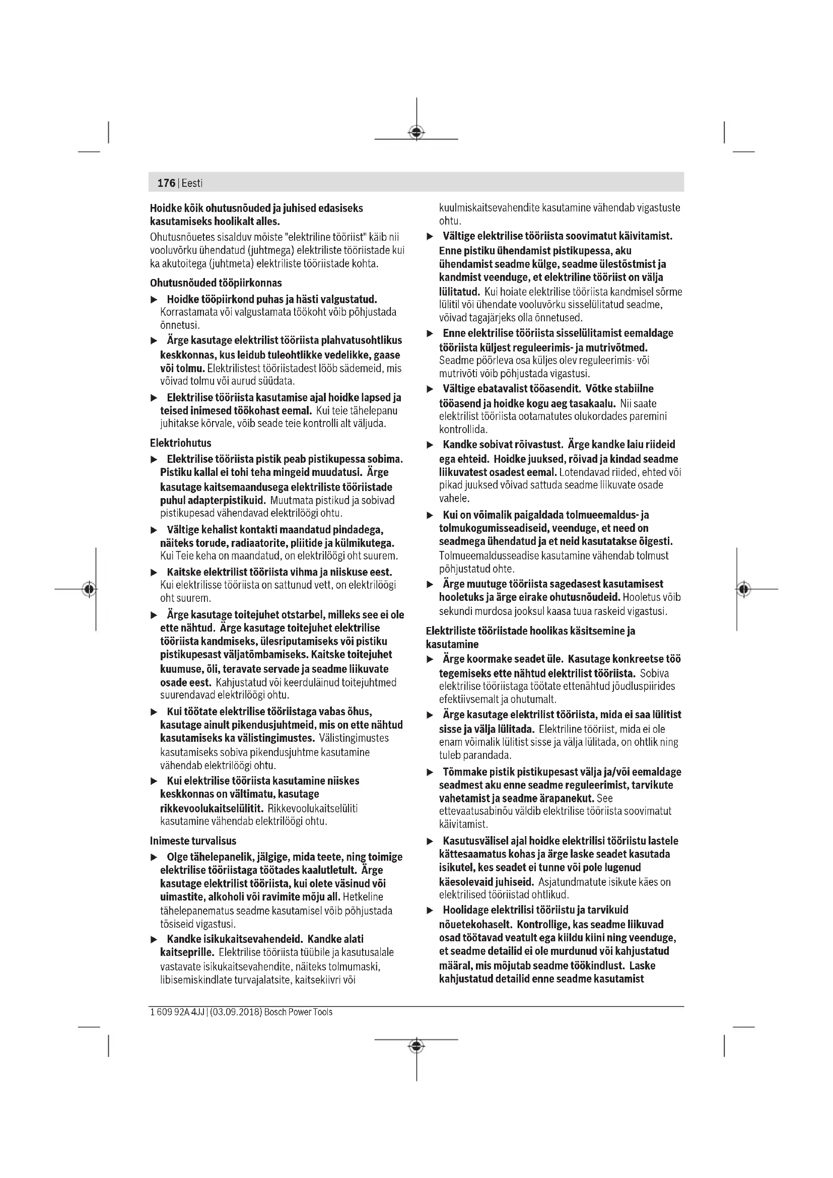 M14 36 48 60 65 72 79 95 107 130 180 215 M16 55 73 92 98 110 122 147 165 196 275 330 Nõuanded Enne suurte pikemate kruvide sissekeeramist kõvadesse materjalidesse tuleks 2/3 kruvipikkuse ulatuses keerme siseläbimõõduga auk ette puurida. Suunis: Jälgige, et elektrilisse tööriista ei tungiks metallist pisidetaile. Vööklamber (vt jn E) Vööklambriga (17) saate elektrilise tööriista nt vööle riputada. Nii jäävad teil mõlemad käed vabaks ja elektriline tööriist on pidevalt haardeulatuses. Värviline märgistusklamber (vt jn F) Värvilise märgistusklambriga (18) saate elektrilise tööriista individuaalselt tähistada. Juhised aku käsitsemiseks Kaitske akut niiskuse ja vee eest. Hoidke aku temperatuuril –20 °C kuni 50 °C. Ärge jätke akut suvel autosse. Puhastage aku ventilatsiooniavasid pehme, puhta ja kuiva pintsliga. Oluliselt lühenenud kasutusaeg pärast laadimist näitab, et aku on muutunud kasutuskõlbmatuks ja tuleb välja vahetada. Järgige kasutusressursi ammendanud seadmete käitlemise juhiseid. Hooldus ja korrashoid Hooldus ja puhastamine u Eemaldage aku seadmest enne mis tahes töid seadme kallal (nt hooldus, tarvikute vahetus jmt), samuti enne seadme transportimist ja hoiulepanekut. Lüliti (sisse/ välja) juhuslik käsitsemine toob kaasa vigastuste ohu. u Seadme laitmatu ja ohutu töö tagamiseks hoidke seade ja selle ventilatsiooniavad puhtad. Klienditeenindus ja kasutusalane nõustamine Müügiesindajad annavad vastused toodete paranduse ja hoolduse ning varuosadega seotud küsimustele. Joonised ja info varuosade kohta leiate ka veebisaidilt: www.bosch- pt.com Boschi nõustajad on meeleldi abiks, kui teil on küsimusi toodete ja lisatarvikute kohta. Päringute esitamisel ja varuosade tellimisel näidake kindlasti ära seadme andmesildil olev 10‑kohaline tootenumber. Eesti Vabariik Mercantile Group AS Boschi elektriliste käsitööriistade remont ja hooldus Pärnu mnt. 549 76401 Saue vald, Laagri Tel.: 6549 568 Faks: 679 1129 Transport Komplektis sisalduvate liitium-ioonakude suhtes kohaldatakse ohtlike ainete vedu reguleerivaid nõudeid. Akude puhul on lubatud kasutajapoolne piiranguteta maanteevedu. Kolmandate isikute teostatava veo korral (nt õhuvedu või ekspedeerimine) tuleb järgida pakendi ja tähistuse osas kehtivaid erinõudeid. Sellisel juhul peab veose ettevalmistamisel alati osalema ohtlike ainete veo ekspert. Aku vedu on lubatud vaid siis, kui aku korpus on vigastusteta. Katke lahtised kontaktid teibiga ja pakkige aku nii, et see pakendis ei liiguks. Järgige ka võimalikke täiendavaid siseriiklikke nõudeid. Kasutuskõlbmatuks muutunud seadmete käitlus Elektrilised tööriistad, akud, lisatarvikud ja pakendid tuleb keskkonnasäästlikult ringlusse võtta. Ärge käidelge elektrilisi tööriistu ja akusid/ patareisid koos olmejäätmetega! Üksnes ELliikmesriikidele: Vastavalt Euroopa Liidu direktiividele 2012/19/EL ja 2006/66/EÜ tuleb kasutusressursi ammendanud elektrilised tööriistad ning defektsed või kasutusressursi ammendanud akud/patareid eraldi kokku koguda ja keskkonnasäästlikult korduskasutada. Akud/patareid: Li-ioon: Järgige lõigus Transport toodud juhiseid (vaadake „Transport“, Lehekülg181). Eesti | 181 Bosch Power Tools 1 609 92A 4JJ | (03.09.2018)182 | Latviešu 1 609 92A 4JJ | (03.09.2018) Bosch Power Tools Latviešu Drošības noteikumi Vispārēji drošības noteikumi elektroinstrumentiem