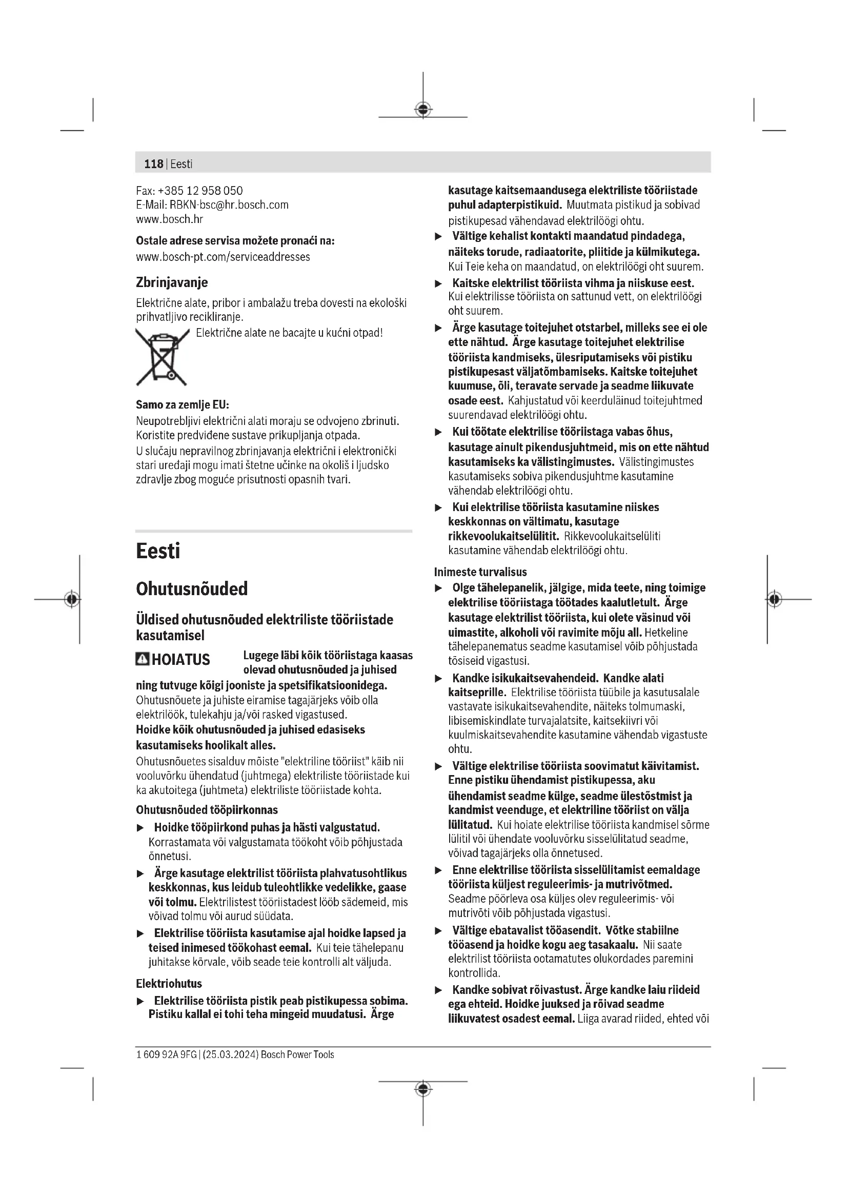 kg 5,8 Kaitseklass /II A) Kaal ilma võrgujuhtme ja võrgupistikuta Andmed kehtivad nimipingel [U] 230V. Teistsuguste pingete ja kasutusriigis spetsiifiliste mudelite puhul võivad toodud andmed varieeruda. Väärtused võivad olenevalt tootest varieeruda ja oleneda kasutus- ning keskkonnatingimustest.Täiendav teave veebisaidil www.bosch-professional.com/wac. Andmed müra/vibratsiooni kohta Mürapäästuväärtused, määratud vastavalt ENIEC62841-2-6. Elektrilise tööriista ekvivalentne müratase on tavaliselt: helirõhutase 92dB(A); helivõimsustase 100dB(A). Mõõtemääramatus K = 3dB. Kasutage kuulmiskaitsevahendeid! Vibratsiooni koguväärtused a