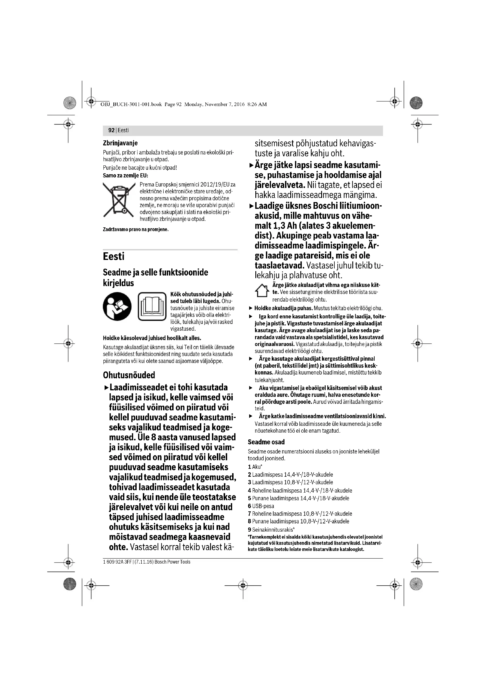 - Neki vanjski USB uređaji se unatoč sukladnosti tehničkih podataka ne mogu puniti s ovim punjačem. Uzrok Otklanjanje OBJ_BUCH-3011-001.book Page 91 Monday, November 7, 2016 8:26 AM92 | Eesti 1 609 92A 3FF | (7.11.16) Bosch Power Tools Zbrinjavanje Punjači, pribor i ambalaža trebaju se poslati na ekološki pri- hvatljivo zbrinjavanje u otpad. Punjače ne bacajte u kućni otpad! Samo za zemlje EU: Prema Europskoj smjernici 2012/19/EU za električne i elektroničke stare uređaje, od- nosno prema važećim propisima dotične zemlje, ne moraju se više uporabivi punjači odvojeno sakupljati i slati na ekološki pri- hvatljivo zbrinjavanje u otpad. Zadržavamo pravo na promjene. Eesti Seadme ja selle funktsioonide kirjeldus Kõik ohutusnõuded ja juhi- sed tuleb läbi lugeda. Ohu- tusnõuete ja juhiste eiramise tagajärjeks võib olla elektri- löök, tulekahju ja/või rasked vigastused. Hoidke käesolevad juhised hoolikalt alles. Kasutage akulaadijat üksnes siis, kui Teil on täielik ülevaade selle kõikidest funktsioonidest ning suudate seda kasutada piiranguteta või kui olete saanud asjaomase väljaõppe. Ohutusnõuded Laadimisseadet ei tohi kasutada lapsed ja isikud, kelle vaimsed või füüsilised võimed on piiratud või kellel puuduvad seadme kasutami- seks vajalikud teadmised ja koge- mused. Üle 8 aasta vanused lapsed ja isikud, kelle füüsilised või vaim- sed võimed on piiratud või kellel puuduvad seadme kasutamiseks vajalikud teadmised ja kogemused, tohivad laadimisseadet kasutada vaid siis, kui nende üle teostatakse järelevalvet või kui neile on antud täpsed juhised laadimisseadme ohutuks käsitsemiseks ja kui nad mõistavad seadmega kaasnevaid ohte. Vastasel korral tekib valest kä- sitsemisest põhjustatud kehavigas- tuste ja varalise kahju oht. Ärge jätke lapsi seadme kasutami- se, puhastamise ja hooldamise ajal järelevalveta. Nii tagate, et lapsed ei hakka laadimisseadmega mängima. Laadige üksnes Boschi liitiumioon- akusid, mille mahtuvus on vähe- malt 1,3 Ah (alates 3 akuelemen- dist). Akupinge peab vastama laa- dimisseadme laadimispingele. Är- ge laadige patareisid, mis ei ole taaslaetavad. Vastasel juhul tekib tu- lekahju ja plahvatuse oht. Ärge jätke akulaadijat vihma ega niiskuse kät- te. Vee sissetungimine elektrilisse tööriista suu- rendab elektrilöögi ohtu. Hoidke akulaadija puhas. Mustus tekitab elektrilöögi ohu. Iga kord enne kasutamist kontrollige üle laadija, toite- juhe ja pistik. Vigastuste tuvastamisel ärge akulaadijat kasutage. Ärge avage akulaadijat ise ja laske seda pa- randada vaid vastava ala spetsialistidel, kes kasutavad originaalvaruosi. Vigastatud akulaadija, toitejuhe ja pistik suurendavad elektrilöögi ohtu. Ärge kasutage akulaadijat kergestisüttival pinnal (nt paberil, tekstiilidel jmt) ja süttimisohtlikus kesk- konnas. Akulaadija kuumeneb laadimisel, mistõttu tekkib tulekahjuoht. Aku vigastamisel ja ebaõigel käsitsemisel võib akust eralduda aure. Õhutage ruumi, halva enesetunde kor- ral pöörduge arsti poole. Aurud võivad ärritada hingamis- teid. Ärge katke laadimisseadme ventilatsiooniavasid kinni. Vastasel korral võib laadimisseade üle kuumeneda ja selle nõuetekohane töö ei ole enam tagatud. Seadme osad Seadme osade numeratsiooni aluseks on jooniste leheküljel toodud joonised. 1 Aku* 2 Laadimispesa 14,4-V-/18-V-akudele 3 Laadimispesa 10,8-V-/12-V-akudele 4 Roheline laadimispesa 14,4-V-/18-V-akudele 5 Punane laadimispesa 14,4-V-/18-V-akudele 6 USB-pesa 7 Roheline laadimispesa 10,8-V-/12-V-akudele 8 Punane laadimispesa 10,8-V-/12-V-akudele 9 Seinakinnitusrakis* *Tarnekomplekt ei sisalda kõiki kasutusjuhendis olevatel joonistel kujutatud või kasutusjuhendis nimetatud lisatarvikuid. Lisatarvi-kute täieliku loetelu leiate meie lisatarvikute kataloogist.OBJ_BUCH-3011-001.book Page 92 Monday, November 7, 2016 8:26 AMEesti | 93 Bosch Power Tools 1 609 92A 3FF | (7.11.16) Tehnilised andmed Kasutus Seadme kasutuselevõtt Pöörake tähelepanu võrgupingele! Võrgupinge peab üh- tima tööriista andmesildil märgitud pingega. Andmesildil toodud 230 V seadmeid võib kasutada ka 220 V võrgupin- ge korral. Laadimine Laadimine algab kohe, kui laadimisseadme võrgupistik ühen- datakse pistikupessa ja aku 1 asetatakse laadimispessa 2/3 ja/või laadimiskaabel ühendatakse USB-pessa 6. Laadimispessa 2/3 esimesena asetatud akut 1 ka laetakse esimesena. Seejärel laetakse automaatselt viimasena sisse pandud akut 1. Külge ühendatud välist USB-seadet laetakse alati, olenemata sellest, kas akut 1 juba laetakse. Intelligentne laadimine tuvastab aku laetuse astme automaat- selt ja akut laetakse sõltuvalt aku temperatuurist ja pingest optimaalse laadimisvooluga. See säästab akut ja aku jääb akulaadijas alati täielikult laetuks. Näitude tähendus Aku roheline vilkuv laadimisnäit 4/7 Kiirlaadimist signaliseerib aku vilkuv roheline laadimisnäit 4/7. Akut saab mis tahes ajal välja võtta ja kasutada. Märkus: Laadimine on võimalik ainult siis, kui aku tempera- tuur on lubatud vahemikus, vt punkti „Tehnilised andmed“. Niipea kui aku mahtuvus on jõudnud ca 80 %-ni, hakkab roheline tuli aku laetuse astme näidikul aeglasemalt vilkuma. Kiirlaadimine on nüüd lõppenud. Kui aku jääb laadimisseadmes- se, jätkub laadimine Long Life-laadimisrežiimil. Pidevalt põlev roheline laadimisnäit 4/7 Pidevalt põlev roheline laadimisnäit 4/7 sig- naliseerib, et aku on täielikult laetud. Seejärel võib aku akulaadijast välja võtta ja seadmega ühen- dada. Kui akut ei ole paigaldatud, annab pideva tulega põlev laadi- misnäit 4/7 märku sellest, et pistik on ühendatud pistikupes- sa ja akulaadija on töövalmis. Akulaadija GAX 18V-30 GAX 18V-30 Tootenumber