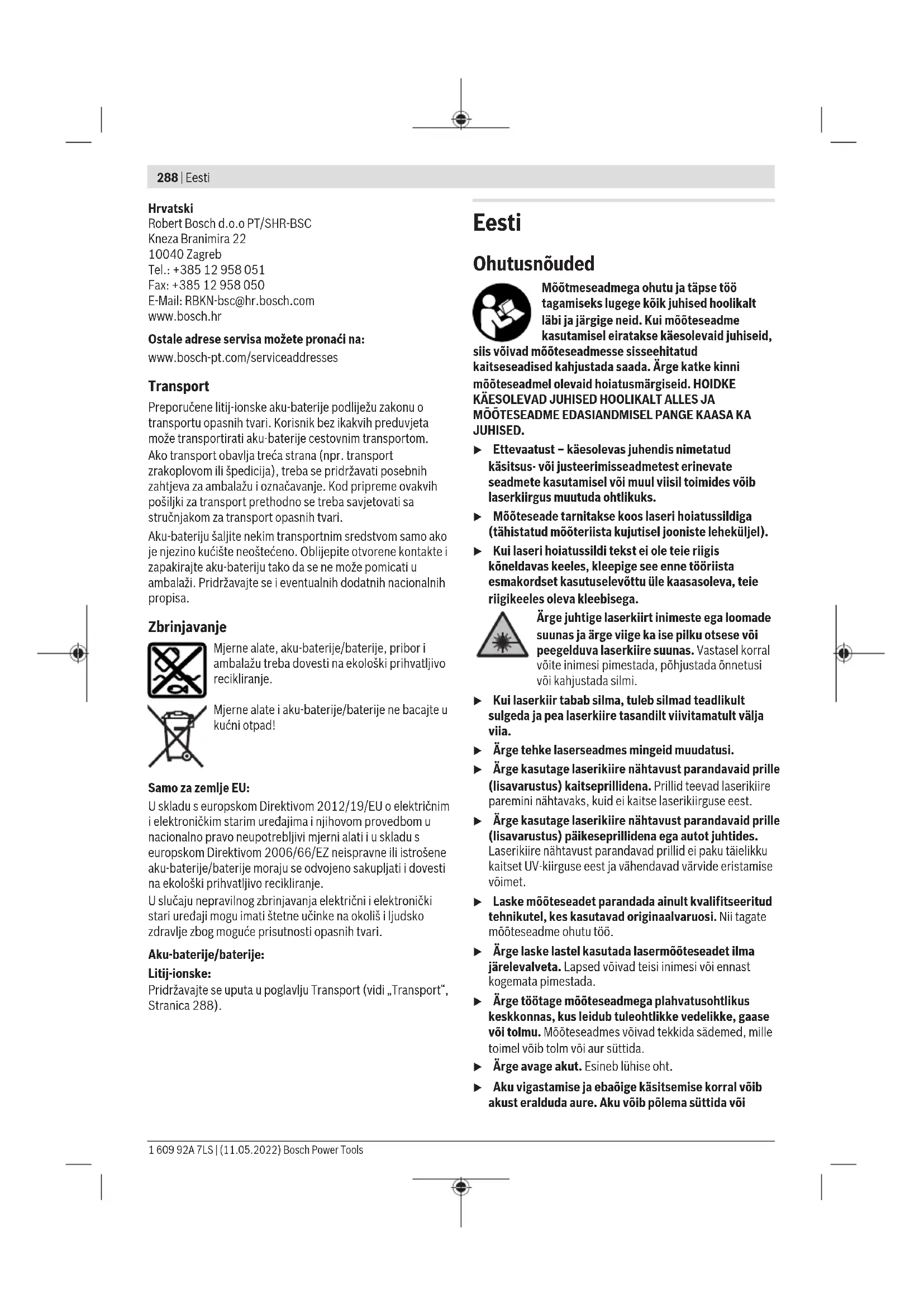 JUHISED. u Ettevaatust – käesolevas juhendis nimetatud käsitsus- või justeerimisseadmetest erinevate seadmete kasutamisel või muul viisil toimides võib laserkiirgus muutuda ohtlikuks. u Mõõteseade tarnitakse koos laseri hoiatussildiga (tähistatud mõõteriista kujutisel jooniste leheküljel). u Kui laseri hoiatussildi tekst ei ole teie riigis kõneldavas keeles, kleepige see enne tööriista esmakordset kasutuselevõttu üle kaasasoleva, teie riigikeeles oleva kleebisega. Ärge juhtige laserkiirt inimeste ega loomade suunas ja ärge viige ka ise pilku otsese või peegelduva laserkiire suunas. Vastasel korral võite inimesi pimestada, põhjustada õnnetusi või kahjustada silmi. u Kui laserkiir tabab silma, tuleb silmad teadlikult sulgeda ja pea laserkiire tasandilt viivitamatult välja viia. u Ärge tehke laserseadmes mingeid muudatusi.u Ärge kasutage laserikiire nähtavust parandavaid prille (lisavarustus) kaitseprillidena. Prillid teevad laserikiire paremini nähtavaks, kuid ei kaitse laserikiirguse eest. u Ärge kasutage laserikiire nähtavust parandavaid prille (lisavarustus) päikeseprillidena ega autot juhtides. Laserikiire nähtavust parandavad prillid ei paku täielikku kaitset UV-kiirguse eest ja vähendavad värvide eristamise võimet. u Laske mõõteseadet parandada ainult kvalifitseeritud tehnikutel, kes kasutavad originaalvaruosi. Nii tagate mõõteseadme ohutu töö. u Ärge laske lastel kasutada lasermõõteseadet ilma järelevalveta. Lapsed võivad teisi inimesi või ennast kogemata pimestada. u Ärge töötage mõõteseadmega plahvatusohtlikus keskkonnas, kus leidub tuleohtlikke vedelikke, gaase või tolmu. Mõõteseadmes võivad tekkida sädemed, mille toimel võib tolm või aur süttida. u Ärge avage akut. Esineb lühise oht.u Aku vigastamise ja ebaõige käsitsemise korral võib akust eralduda aure. Aku võib põlema süttida või 1 609 92A 7LS | (11.05.2022) Bosch Power ToolsEesti | 289 plahvatada. Õhutage ruumi, halva enesetunde korral pöörduge arsti poole. Aurud võivad ärritada hingamisteid. u Väärkasutuse või kahjustatud aku korral võib süttiv vedelik välja voolata. Vältige sellega kokkupuudet. Juhusliku kokkupuute korral loputage veega. Kui vedelik satub silma, pöörduge ka arsti poole. Väljavoolav akuvedelik võib põhjustada nahaärritusi või põletusi. u Teravad esemed, näiteks naelad või kruvikeerajad, samuti löögid, põrutused jmt võivad akut kahjustada. Akukontaktide vahel võib tekkida lühis ja aku võib süttida, suitsema hakata, plahvatada või üle kuumeneda. u Kasutusvälisel ajal hoidke akud eemal kirjaklambritest, müntidest, võtmetest, naeltest, kruvidest või teistest väikestest metallesemetest, mis võivad kontaktid omavahel ühendada. Akukontaktide vahel tekkiva lühise tagajärjeks võivad olla põletused või tulekahju. u Kasutage akut ainult valmistaja toodetes. Ainult sellisel juhul on aku kaitstud ohtliku ülekoormuse eest. u Laadige akusid ainult tootja soovitatud laadimisseadmetega. Laadimisseade, mis sobib teatud tüüpi akudele, muutub tuleohtlikuks, kui seda kasutatakse teiste akudega. Kaitske akut kuumuse, sealhulgas pideva päikesekiirguse eest, samuti tule, mustuse, vee ja niiskuse eest. Plahvatus- ja lühiseoht. Hoidke mõõteriist ja magnetiline lisavarustus eemal implantaatidest ja muudest meditsiinilistest seadmetest, nagu nt südamestimulaator või insuliinipump. Mõõteriista ja lisavarustuse magnetid tekitavad välja, mis võib implantaatide ja meditsiiniliste seadmete talitlust mõjutada. u Hoidke mõõteseade ja magnettarvikud eemal magnetilistest andmekandjatest ja magnetiliselt tundlikest seadmetest. Mõõteseadme ja tarvikute magnetite toime võib põhjustada andmete pöördumatu hävimise. u Eemaldage enne kõiki mõõteseadme juures tehtavaid töid (nt monteerimine, hooldus), samuti transportimise või hoiustamise ajal mõõteseadmest aku või patareid. Sisse-/väljalüliti juhusliku käsitsemisega kaasneb vigastuste oht. u Ettevaatust! Mõõteseadme Bluetooth® abil kasutamisel võidakse segada teisi seadmeid ja süsteeme, lennukeid ja meditsiinilisi seadmeid (nt südamestimulaatorid, kuuldeaparaadid). Samuti ei saa täielikult välistada kahjulikku mõju vahetus läheduses viibivatele inimestele ja loomadele. Ärge kasutage mõõteseadet Bluetooth® abil meditsiiniliste seadmete, tanklate ja keemiliste süsteemide läheduses, plahvatusohtlikes ja lõhketööde tegemise piirkondades. Ärge kasutage mõõteseadet Bluetooth® abil lennukites. Vältige seadme pikemaajalist kasutamist oma keha vahetus läheduses. Sõnamärk Bluetooth® ja kujutismärgid (logod) on registreeritud kaubamärgid, mille omanik on Bluetooth SIG, Inc. Robert Bosch Power Tools GmbH kasutab seda sõnamärki/neid kujutismärke litsentsi alusel. Toote kirjeldus ja kasutusjuhend Pange tähele kasutusjuhendi esiosas olevaid jooniseid. Nõuetekohane kasutamine Mõõteseade on ette nähtud horisontaalsete ja vertikaalsete joonte ning loodimispunktide määramiseks ja kontrollimiseks. Mõõteriist sobib kasutamiseks sise- ja välistingimustes. PöördhoidikRM2 võimaldab mõõteseadet keskse, alati nähtava loodimispunkti ümber 360° pöörata. Nii saab laserijooni täpselt suunata, ilma et mõõteseadme asendit tuleks muuta. Kujutatud komponendid Kujutatud komponentide numeratsiooni aluseks on jooniseleheküljel toodud numbrid. (1) Juhtsoon (2) Sisse-/väljalüliti (3) Laserikiire väljumisava (4) Aku/patareide laetuse tase (5) Pendlifiksaatori näit (6) Vastuvõtjarežiimi nupp (7) Vastuvõtjarežiimi näit (8) Laseri töörežiimi nupp (9) Bluetooth®-ühenduse näit (10) Bluetooth®-i nupp (11) Akupesa (12) Aku