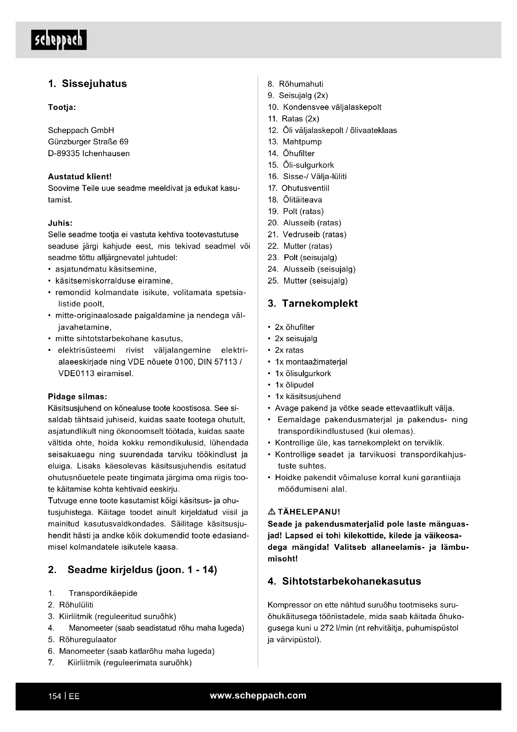 Tootja: Scheppach GmbH Günzburger Straße 69 D-89335 Ichenhausen Austatud klient! Soovime Teile uue seadme meeldivat ja edukat kasu- tamist. Juhis: Selle seadme tootja ei vastuta kehtiva tootevastutuse seaduse järgi kahjude eest, mis tekivad seadmel või seadme tõttu alljärgnevatel juhtudel:
