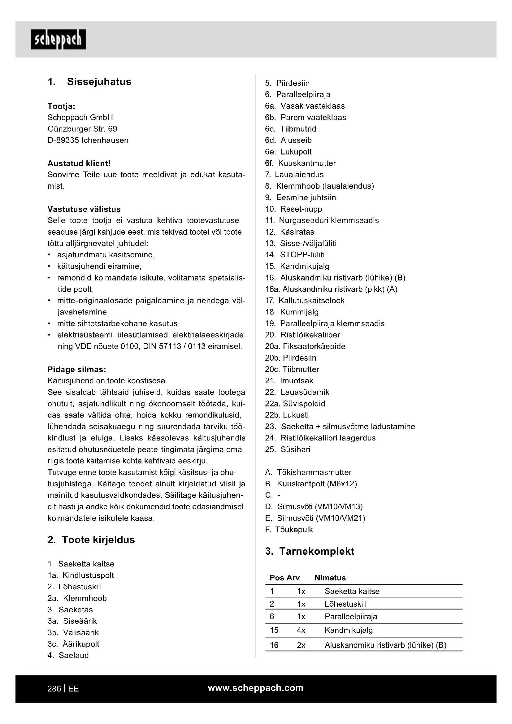 Tootja: Scheppach GmbH Günzburger Str. 69 D-89335 Ichenhausen Austatud klient! Soovime Teile uue toote meeldivat ja edukat kasuta- mist. Vastutuse välistus Selle toote tootja ei vastuta kehtiva tootevastutuse seaduse järgi kahjude eest, mis tekivad tootel või toote tõttu alljärgnevatel juhtudel: