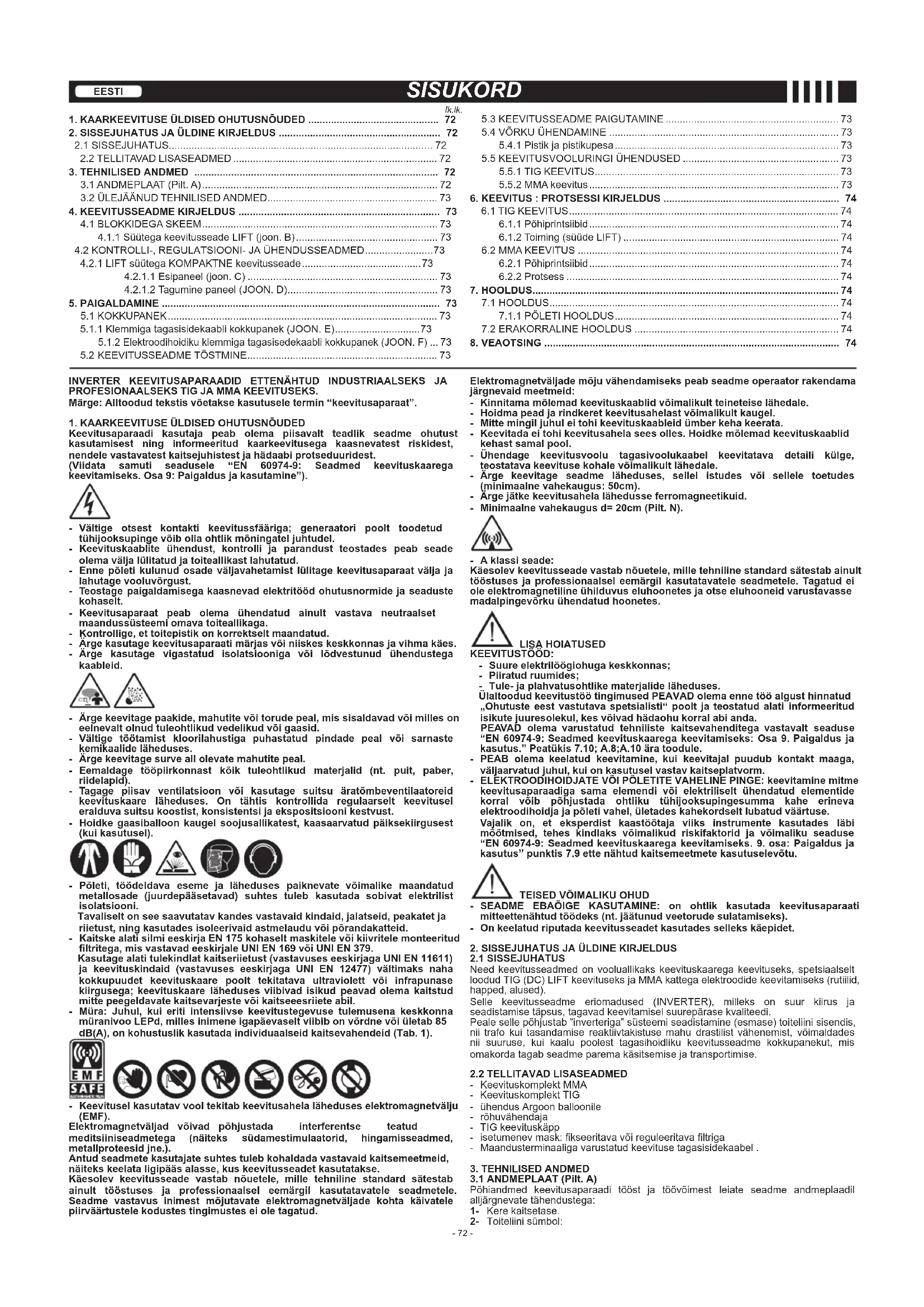 Keevitusaparaadi kasutaja peab olema piisavalt teadlik seadme ohutust kasutamisest ning informeeritud kaarkeevitusega kaasnevatest riskidest, nendelevastavatestkaitsejuhistestjahädaabiprotseduuridest. (Viidata samuti seadusele “EN 60974-9: Seadmed keevituskaarega keevitamiseks.Osa9:Paigaldusjakasutamine”). - Vältige otsest kontakti keevitussfääriga; generaatori poolt toodetud tühijooksupingevõibollaohtlikmõningateljuhtudel. - Keevituskaablite ühendust, kontrolli ja parandust teostades peab seade olemaväljalülitatudjatoiteallikastlahutatud. -Ennepõletikulunudosadeväljavahetamistlülitagekeevitusaparaatvälja ja lahutagevooluvõrgust. - Teostagepaigaldamisegakaasnevadelektritöödohutusnormidejaseaduste kohaselt. - Keevitusaparaat peab olema ühendatud ainult vastava neutraalset maandussüsteemiomavatoiteallikaga. - Kontrollige,ettoitepistikonkorrektseltmaandatud. - Ärgekasutagekeevitusaparaatimärjasvõiniiskeskeskkonnasjavihmakäes. - Ärge kasutage vigastatud isolatsiooniga või lõdvestunud ühendustega kaableid. - Ärgekeevitagepaakide,mahutitevõitorudepeal,missisaldavadvõimilleson eelnevaltolnudtuleohtlikudvedelikudvõigaasid. - Vältige töötamist kloorilahustiga puhastatud pindade peal või sarnaste kemikaalideläheduses. - Ärgekeevitagesurveallolevatemahutitepeal. - Eemaldage tööpiirkonnast kõik tuleohtlikud materjalid (nt. puit, paber, riidelapid). - Tagage piisav ventilatsioon või kasutage suitsu äratõmbeventilaatoreid keevituskaare läheduses. On tähtis kontrollida regulaarselt keevitusel eralduvasuitsukoostist,konsistentsijaekspositsioonikestvust. - Hoidkegaasiballoonkaugelsoojusallikatest,kaasaarvatudpäiksekiirgusest (kuikasutusel). - Põleti, töödeldava eseme ja läheduses paiknevate võimalike maandatud metallosade (juurdepääsetavad) suhtes tuleb kasutada sobivat elektrilist isolatsiooni. Tavaliseltonseesaavutatavkandesvastavaidkindaid,jalatseid,peakatetja riietust,ningkasutadesisoleerivaidastmelauduvõipõrandakatteid. - KaitskealatisilmieeskirjaEN175kohaseltmaskitelevõikiivritelemonteeritud ltritega,misvastavadeeskirjaleUNIEN169võiUNIEN379. Kasutagealatitulekindlatkaitseriietust(vastavuseseeskirjagaUNIEN11611) ja keevituskindaid (vastavuses eeskirjaga UNI EN 12477) vältimaks naha kokkupuudet keevituskaare poolt tekitatava ultraviolett või infrapunase kiirgusega; keevituskaare lähedusesviibivad isikud peavad olema kaitstud mittepeegeldavatekaitsevarjestevõikaitseeesriieteabil. - Müra: Juhul, kui eriti intensiivse keevitustegevuse tulemusena keskkonna müranivooLEPd,millesinimeneigapäevaseltviibibonvõrdnevõiületab85 dB(A),onkohustuslikkasutadaindividuaalseidkaitsevahendeid(Tab.1). - Keevituselkasutatavvooltekitabkeevitusahelaläheduseselektromagnetvälju (EMF). Elektromagnetväljad võivad põhjustada interferentse teatud meditsiiniseadmetega (näiteks südamestimulaatorid, hingamisseadmed, metallproteesidjne.). Antudseadmetekasutajatesuhtestulebkohaldadavastavaidkaitsemeetmeid, näitekskeelataligipääsalasse,kuskeevitusseadetkasutatakse. Käesolev keevitusseade vastab nõuetele, mille tehniline standard sätestab ainult tööstuses ja professionaalsel eemärgil kasutatavatele seadmetele. Seadme vastavus inimest mõjutavate elektromagnetväljade kohta käivatele piirväärtustelekodustestingimusteseioletagatud. Elektromagnetväljademõjuvähendamisekspeabseadmeoperaatorrakendama järgnevaidmeetmeid: - Kinnitamamõlemadkeevituskaablidvõimalikultteineteiselähedale. - Hoidmapeadjarindkeretkeevitusahelastvõimalikultkaugel. - Mittemingiljuhuleitohikeevituskaableidümberkehakeerata. - Keevitadaeitohikeevitusahelaseesolles.Hoidkemõlemadkeevituskaablid kehastsamalpool. - Ühendage keevitusvoolu tagasivoolukaabel keevitatava detaili külge, teostatavakeevitusekohalevõimalikultlähedale. - Ärge keevitage seadme läheduses, sellel istudes või sellele toetudes (minimaalnevahekaugus:50cm). - Ärgejätkekeevitusahelalähedusseferromagneetikuid. - Minimaalnevahekaugusd=20cm(Pilt.N). - Aklassiseade: Käesolevkeevitusseadevastabnõuetele,milletehnilinestandardsätestabainult tööstusesjaprofessionaalseleemärgilkasutatavateleseadmetele. Tagatudei oleelektromagnetilineühilduvuseluhoonetesjaotseeluhooneidvarustavasse madalpingevõrkuühendatudhoonetes. LISA HOIATUSED KEEVITUSTÖÖD: - Suureelektrilöögiohugakeskkonnas; - Piiratudruumides; - Tule-japlahvatusohtlikematerjalideläheduses. ÜlaltoodudkeevitustöötingimusedPEAVADolemaennetööalgusthinnatud „Ohutusteeestvastutavaspetsialisti“ poolt ja teostatud alati informeeritud isikutejuuresolekul,kesvõivadhädaohukorralabianda. PEAVAD olema varustatud tehniliste kaitsevahenditega vastavalt seaduse “EN60974-9:Seadmed keevituskaaregakeevitamiseks:Osa9.Paigaldus ja kasutus.”Peatükis7.10;A.8;A.10äratoodule. -PEAB olema keelatud keevitamine, kui keevitajal puudub kontakt maaga, väljaarvatudjuhul,kuionkasutuselvastavkaitseplatvorm. - ELEKTROODIHOIDJATEVÕIPÕLETITEVAHELINEPINGE:keevitaminemitme keevitusaparaadiga sama elemendi või elektriliselt ühendatud elementide korral võib põhjustada ohtliku tühijooksupingesumma kahe erineva elektroodihoidjajapõletivahel,ületadeskahekordseltlubatudväärtuse. Vajalik on, et eksperdist kaastöötaja viiks instrumente kasutades läbi mõõtmised, tehes kindlaks võimalikud riskifaktorid ja võimaliku seaduse “EN60974-9:Seadmedkeevituskaaregakeevitamiseks.9.osa:Paigaldusja kasutus”punktis7.9ettenähtudkaitsemeetmetekasutuselevõtu.