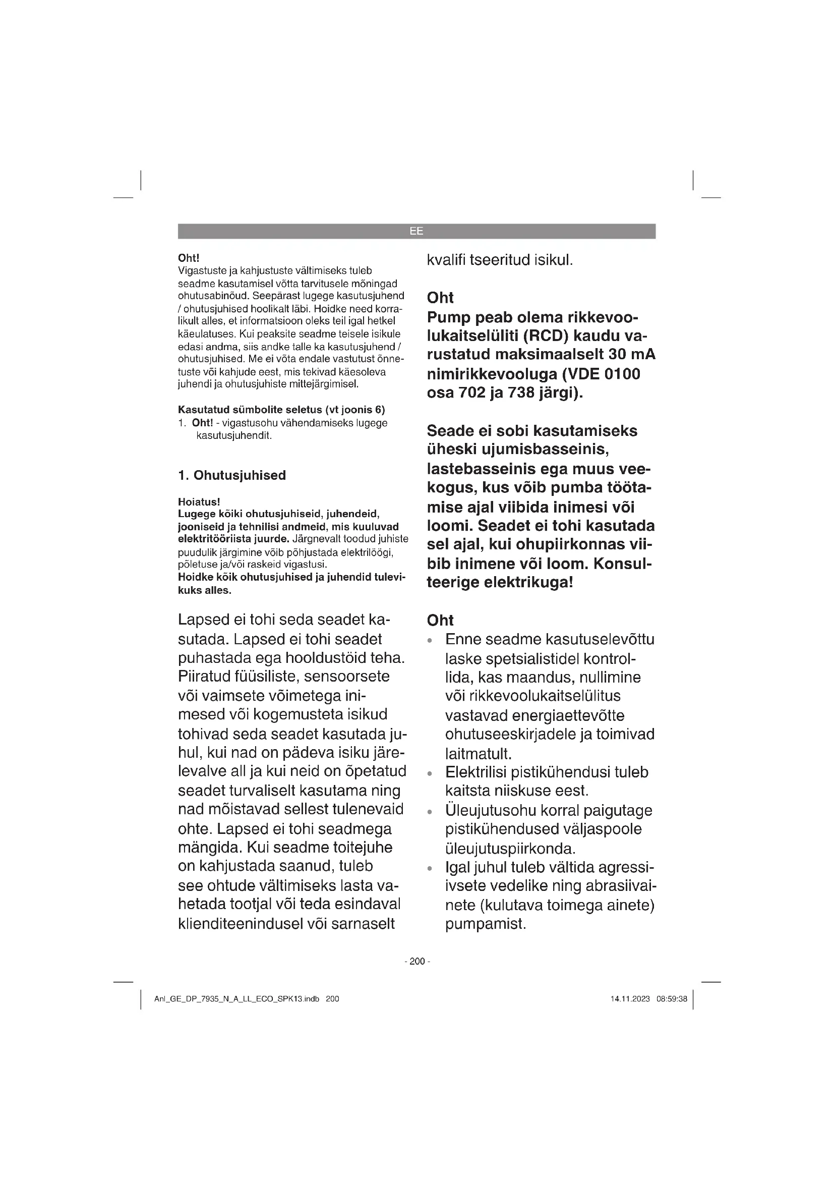 Hoiatus! Lugege kõiki ohutusjuhiseid, juhendeid, jooniseid ja tehnilisi andmeid, mis kuuluvad elektritööriista juurde. Järgnevalt toodud juhiste puudulik järgimine võib põhjustada elektrilöögi, põletuse ja/või raskeid vigastusi. Hoidke kõik ohutusjuhised ja juhendid tulevi- kuks alles. Lapsed ei tohi seda seadet ka- sutada. Lapsed ei tohi seadet puhastada ega hooldustöid teha. Piiratud füüsiliste, sensoorsete või vaimsete võimetega ini- mesed või kogemusteta isikud tohivad seda seadet kasutada ju- hul, kui nad on pädeva isiku järe- levalve all ja kui neid on õpetatud seadet turvaliselt kasutama ning nad mõistavad sellest tulenevaid ohte. Lapsed ei tohi seadmega mängida. Kui seadme toitejuhe on kahjustada saanud, tuleb see ohtude vältimiseks lasta va- hetada tootjal või teda esindaval klienditeenindusel või sarnaselt kvalifi tseeritud isikul. Oht Pump peab olema rikkevoo- lukaitselüliti (RCD) kaudu va- rustatud maksimaalselt 30 mA nimirikkevooluga (VDE 0100 osa 702 ja 738 järgi). Seade ei sobi kasutamiseks üheski ujumisbasseinis, lastebasseinis ega muus vee- kogus, kus võib pumba tööta- mise ajal viibida inimesi või loomi. Seadet ei tohi kasutada sel ajal, kui ohupiirkonnas vii- bib inimene või loom. Konsul- teerige elektrikuga! Oht