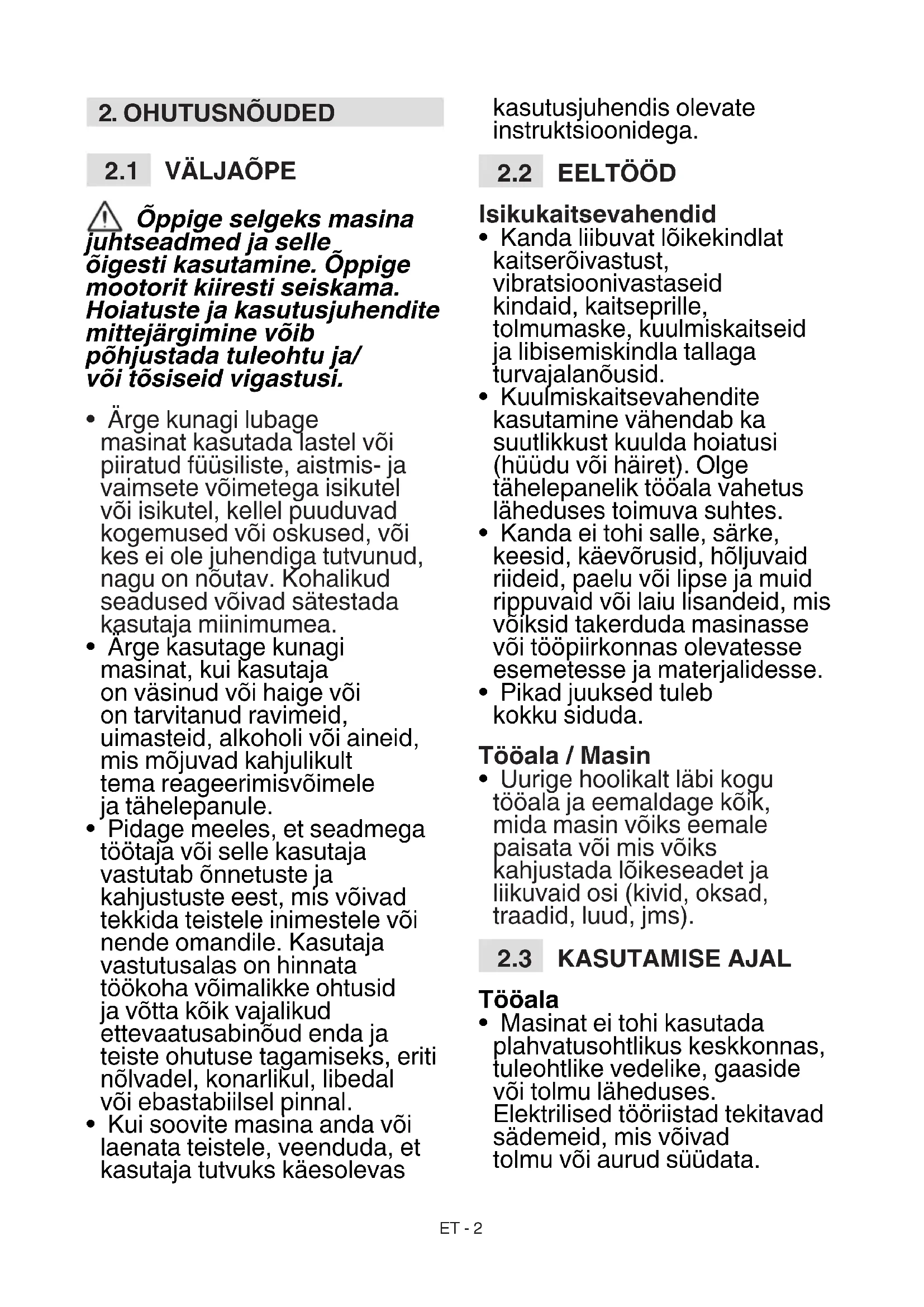 - Masinat ei tohi kasutada inimesed, kes ei suuda seda kindlalt kahe käega hoida ja/või hoida töö ajal jalgadel kindlalt tasakaalu.
