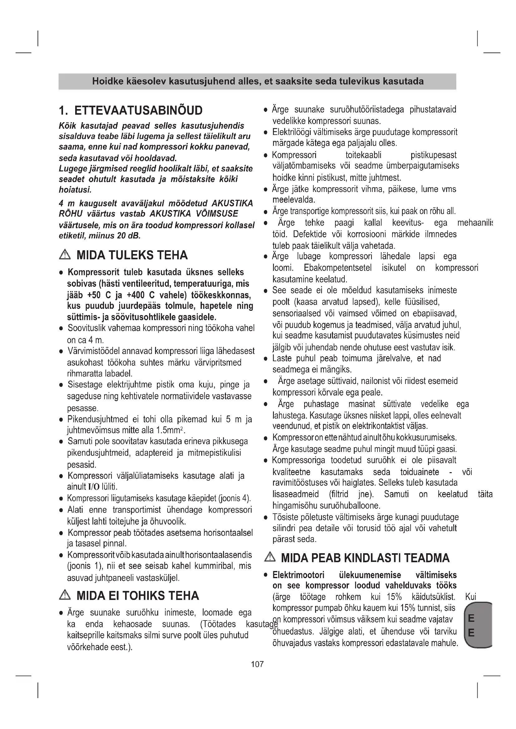 Tööriistade ühendamisel suruõhuvoolikuga kompressori külge peate meeles pidama, et voolikus võibollarõhk.Lisaseadeldistemonteerimiseajalon rangeltkohustuslikkatkestadaõhuvooväljumine. ● Suruõhu kasutamisel erinevatel ettenähtud kasutamisjuhtudel (puhumine, pneumaatilised tööriistad,värvimine, peseminevesilahustega jne.) tuleb tunda ja pidada kinni igat erijuhtu puudutavast normatiivist. ● Ärgekunagiületagekompressorigakasutatavamis tahes kinnituse või tarviku tootja soovitatud lubatud rõhku.109