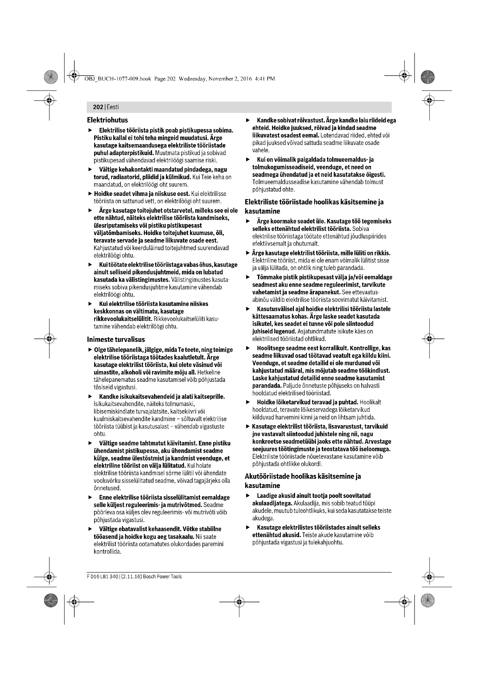 LED Kapacitet Stalno svijetli zeleno 35 – 100% Treperavo zeleno svjetlo 15 – 35% Treperavo crveno svjetlo 5 – 15% Stalno svijetli crveno 0 – 5% Simptomi Mogući uzroci Pomoć Suviše kratko trajanje rezanja po jednom punjenju aku-baterije Aku-baterija se približava završetku svojeg radnog vijeka trajanja Zatražiti pomoć ovlaštenog servisa Pokazivač punjenja aku-baterije stalno svijetli Nije moguć proces punjenja Neispravna aku-baterija Zatražiti pomoć ovlaštenog servisa OBJ_BUCH-1077-009.book Page 200 Wednesday, November 2, 2016 4:41 PMEesti | 201 Bosch Power Tools F 016 L81 340 | (2.11.16) Servisiranje i savjetovanje o primjeni www.bosch-garden.com Za slučaj povratnih upita ili naručivanja rezervnih dijelova, molimo vas neizostavno navedite 10-znamenkasti kataloški broj sa tipske pločice električnog alata. Hrvatski Robert Bosch d.o.o Kneza Branimira 22 10040 Zagreb Tel.: (01) 2958051 Fax: (01) 2958050 Transport Li-ionske aku-baterije ugrađene u električnom alatu podliježu zakonu o transportu opasnih tvari. Aku-baterije korisnik može bez ikakvih preduvjeta transportirati cestovnim transportom. Ako transport obavlja treća strana (npr. transport zrakoplovom ili špedicijom), treba se pridržavati posebnih zahtjeva obzirom na ambalažu i označavanje. Kod pripreme ovakvih pošiljki za transport prethodno se treba savjetovati sa stručnjakom za transport opasnih tvari. Zbrinjavanje Vrtne uređaje, pribor i ambalažu treba dostaviti na ekološki prihvatljivo recikliranje. Vrtne uređaje, punjače i aku-bateriju/baterije ne bacajte u kućni otpad! Samo za zemlje EU: Prema Europskim smjernicama 2012/19/EU, neuporabivi električni i elektronički uređaji i prema Smjernicama 2006/66/EC neispravne ili istrošene aku- baterije/baterije moraju se odvojeno sakupljati i dovesti na ekološki prihvatljivo recikliranje. Integrirane aku-baterije smiju se izvaditi samo u svrhu zbrinjavanja. Otvaranjem kućišta vrtni uređaj se može uništiti. Za vađenje aku-baterije iz električnog alata pritišćite na tipku za uključivanje/isključivanje sve dok aku-baterija u potpunosti ne bude ispražnjena. Odvrnite vijke na kućištu i skinite oblogu kućišta kako biste izvadili akumulatorski paket. U svrhu izbjegavanja kratkog spoja, pojedinačno uzastopno odvajajte priključke na aku-bateriji te zatim na njima izolirajte polove. I kod potpunog pražnjenja, u aku-bateriji ostaje sačuvan preostali kapacitet koji se može osloboditi u slučaju kratkog spoja. Aku-baterije/baterije: Li-Ion: Molimo pridržavajte se napomena u odjeljku „Transport“. Zadržavamo pravo na promjene. Eesti Ohutusnõuded Piltsümbolite selgitus Kõik ohutusnõuded ja juhised tuleb läbi lugeda. Ohutusnõuete ja juhiste eiramise tagajärjeks võib olla elektrilöök, tulekahju ja/või rasked vigastused. Aiatööriistaga töötades kandke alati kaitseprille ja turvalisi jalatseid. Veenduge, et eemalepaiskuvad võõrkehad ei vigasta läheduses viibivaid inimesi. Hoiatus: Viibige töötavast aiatööriistast ohutus kauguses. Ärge kasutage aiatööriista vihma käes ja ärge jätke seda vihma kätte. Tähelepanu: Lõiketera ei seisku kohe pärast tööriista väljalülitamist! Laadimisseadet kasutage üksnes kuivades ruumides. Üldised ohutusjuhised Kõik ohutusnõuded ja juhised tuleb läbi lugeda. Ohutusnõuete ja juhiste eiramise tagajärjeks võib olla elektrilöök, tulekahju ja/või rasked vigastused. Hoidke kõik ohutusnõuded ja juhised edasiseks kasutamiseks hoolikalt alles. Allpool kasutatud mõiste „Elektriline tööriist“ käib võrgutoi- tega (toitejuhtmega) elektriliste tööriistade ja akutoitega (ilma toitejuhtmeta) elektriliste tööriistade kohta. Ohutusnõuded tööpiirkonnas Töökoht peab olema puhas ja hästi valgustatud. Töökohas valitsev segadus ja hämarus võib põhjustada õnnetusi. Ärge kasutage elektrilist tööriista plahvatusohtlikus keskkonnas, kus leidub tuleohtlikke vedelikke, gaase või tolmu. Elektrilistest tööriistadest lööb sädemeid, mis võivad tolmu või aurud süüdata. Elektrilise tööriista kasutamise ajal hoidke lapsed ja teised isikud töökohast eema. Kui Teie tähelepanu kõrvale juhitakse, võib seade Teie kontrolli alt väljuda. TÄHELEPANU OBJ_BUCH-1077-009.book Page 201 Wednesday, November 2, 2016 4:41 PM202 | Eesti F 016 L81 340 | (2.11.16) Bosch Power Tools Elektriohutus Elektrilise tööriista pistik peab pistikupessa sobima. Pistiku kallal ei tohi teha mingeid muudatusi. Ärge kasutage kaitsemaandusega elektriliste tööriistade puhul adapterpistikuid. Muutmata pistikud ja sobivad pistikupesad vähendavad elektrilöögi saamise riski. Vältige kehakontakti maandatud pindadega, nagu torud, radiaatorid, pliidid ja külmikud. Kui Teie keha on maandatud, on elektrilöögi oht suurem. Hoidke seadet vihma ja niiskuse eest. Kui elektrilisse tööriista on sattunud vett, on elektrilöögi oht suurem. Ärge kasutage toitejuhet otstarvetel, milleks see ei ole ette nähtud, näiteks elektrilise tööriista kandmiseks, ülesriputamiseks või pistiku pistikupesast väljatõmbamiseks. Hoidke toitejuhet kuumuse, õli, teravate servade ja seadme liikuvate osade eest. Kahjustatud või keerduläinud toitejuhtmed suurendavad elektrilöögi ohtu. Kui töötate elektrilise tööriistaga vabas õhus, kasutage ainult selliseid pikendusjuhtmeid, mida on lubatud kasutada ka välistingimustes. Välistingimustes kasuta- miseks sobiva pikendusjuhtme kasutamine vähendab elektrilöögi ohtu. Kui elektrilise tööriista kasutamine niiskes keskkonnas on vältimatu, kasutage rikkevoolukaitselülitit. Rikkevoolukaitselüliti kasu- tamine vähendab elektrilöögi ohtu. Inimeste turvalisus Olge tähelepanelik, jälgige, mida Te teete, ning toimige elektrilise tööriistaga töötades kaalutletult. Ärge kasutage elektrilist tööriista, kui olete väsinud või uimastite, alkoholi või ravimite mõju all. Hetkeline tähelepanematus seadme kasutamisel võib põhjustada tõsiseid v