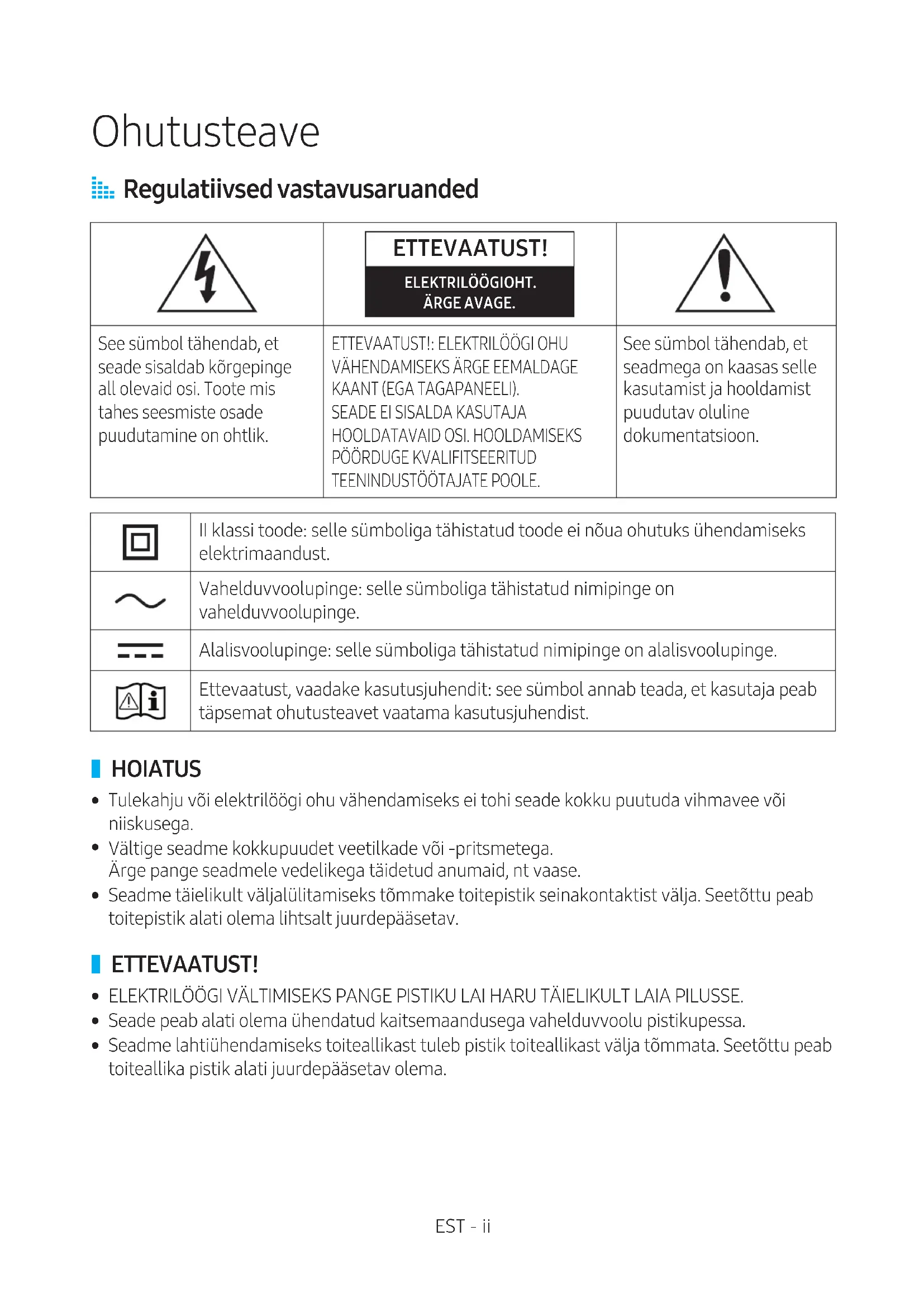 Aku eemaldamiseks võtke ühendust volitatud hoolduskeskusega. Aku eemaldamise suuniseid vt veebisaidilt samsung.com/global/ecodesign_energy Selle toote akut ei tohi (proovida) iseseisvalt eemaldada. TEIE OHUTUSE TAGAMISEKS ÄRGE PROOVIGE AKUT ISESEISVALT EEMALDADA VÕI SEDA PÕLETADES KASUTUSELT KÕRVALDADA. ÄRGE VÕTKE AKUT LAHTI EGA KAHJUSTAGE SEDA. Teavet Samsungi keskkonnaalaste kohustuste ja tootespetsiiliste sätestatud kohustuste kohta, nagu REACH, WEEE, akud, vt järgmiselt aadressilt: http://www.samsung.com/ee/aboutsamsung/samsungelectronics/corporatecitizenship/ environment.html