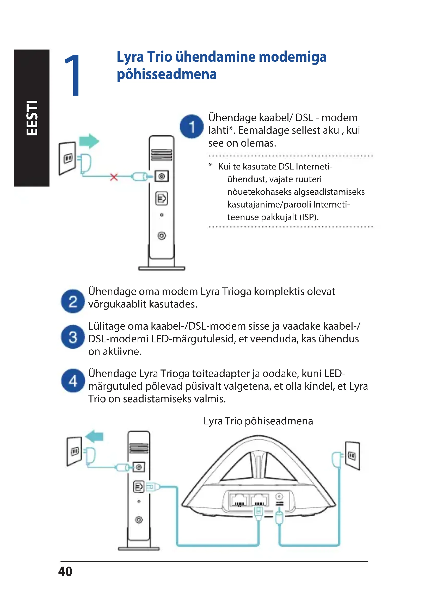 Ühendage Lyra Trioga toiteadapter ja oodake, kuni LED- märgutuled põlevad püsivalt valgetena, et olla kindel, et Lyra Trio on seadistamiseks valmis. LAN Lyra Trio põhiseadmena41 EESTI Lyra Trio WiFi-raadioühenduse algseadistamine Käivitage ASUS-e tasuta Lyra-rakendus ja järgige juhiseid järgmisi tingimusi arvestades.