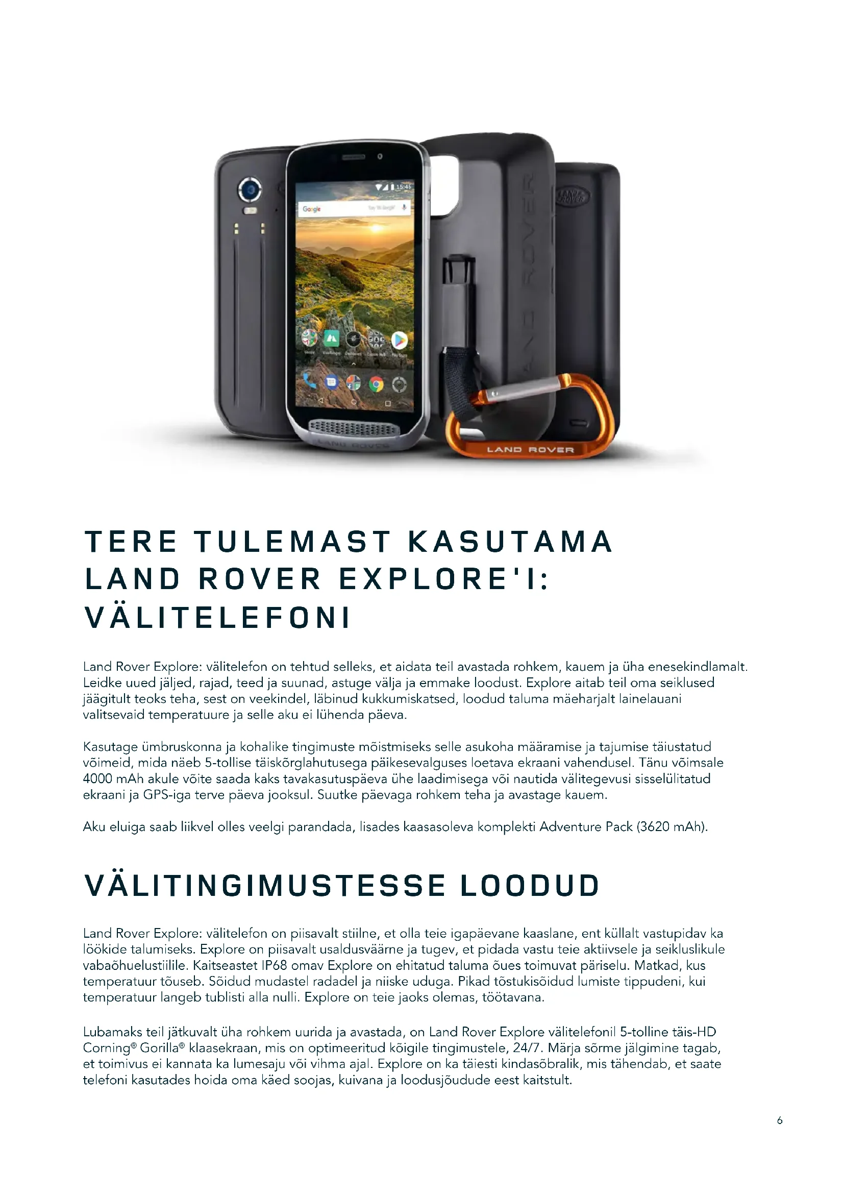 LAND ROVER EXPLORE'I: VÄLITELEFONI Land Rover Explore: välitelefon on tehtud selleks, et aidata teil avastada rohkem, kauem ja üha enesekindlamalt. Leidke uued jäljed, rajad, teed ja suunad, astuge välja ja emmake loodust. Explore aitab teil oma seiklused jäägitult teoks teha, sest on veekindel, läbinud kukkumiskatsed, loodud taluma mäeharjalt lainelauani valitsevaid temperatuure ja selle aku ei lühenda päeva. Kasutage ümbruskonna ja kohalike tingimuste mõistmiseks selle asukoha määramise ja tajumise täiustatud võimeid, mida näeb 5-tollise täiskõrglahutusega päikesevalguses loetava ekraani vahendusel. Tänu võimsale 4000 mAh akule võite saada kaks tavakasutuspäeva ühe laadimisega või nautida välitegevusi sisselülitatud ekraani ja GPS-iga terve päeva jooksul. Suutke päevaga rohkem teha ja avastage kauem. Aku eluiga saab liikvel olles veelgi parandada, lisades kaasasoleva komplekti Adventure Pack (3620 mAh).