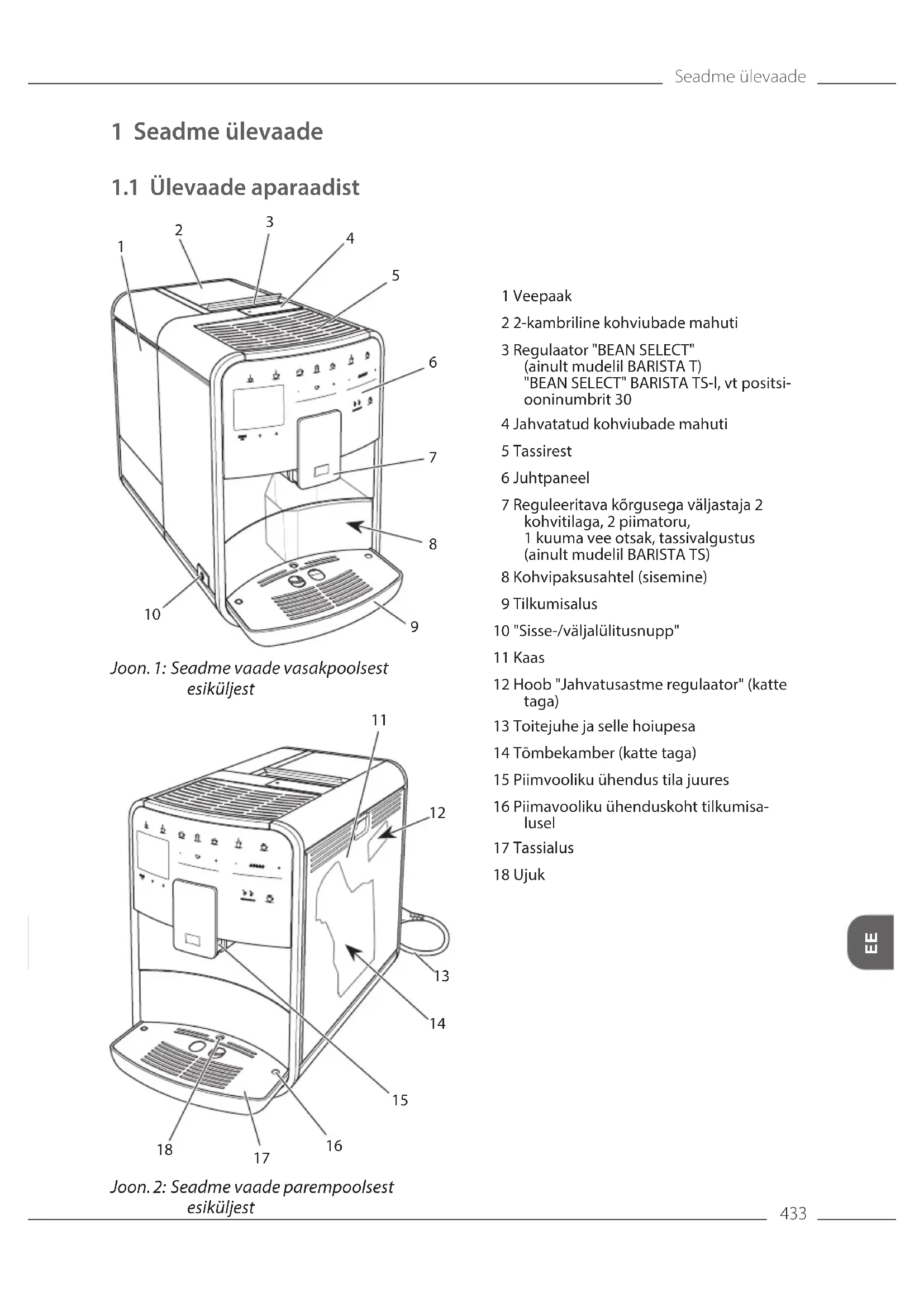 Joon. 2: Seadme vaade parempoolsest esiküljest 1 Veepaak 2 2-kambriline kohviubade mahuti 3 Regulaator "BEAN SELECT" (ainult mudelil BARISTAT) "BEAN SELECT" BARISTA TS-l, vt positsi- ooninumbrit 30 4 Jahvatatud kohviubade mahuti 5 Tassirest 6 Juhtpaneel 7 Reguleeritava kõrgusega väljastaja 2 kohvitilaga, 2 piimatoru, 1 kuuma vee otsak, tassivalgustus (ainult mudelil BARISTATS) 8 Kohvipaksusahtel (sisemine) 9 Tilkumisalus 10 "Sisse-/väljalülitusnupp" 11 Kaas 12 Hoob "Jahvatusastme regulaator" (katte taga) 13 Toitejuhe ja selle hoiupesa 14 Tõmbekamber (katte taga) 15 Piimvooliku ühendus tila juures 16 Piimavooliku ühenduskoht tilkumisa- lusel 17 Tassialus 18 UjukSeadme ülevaade