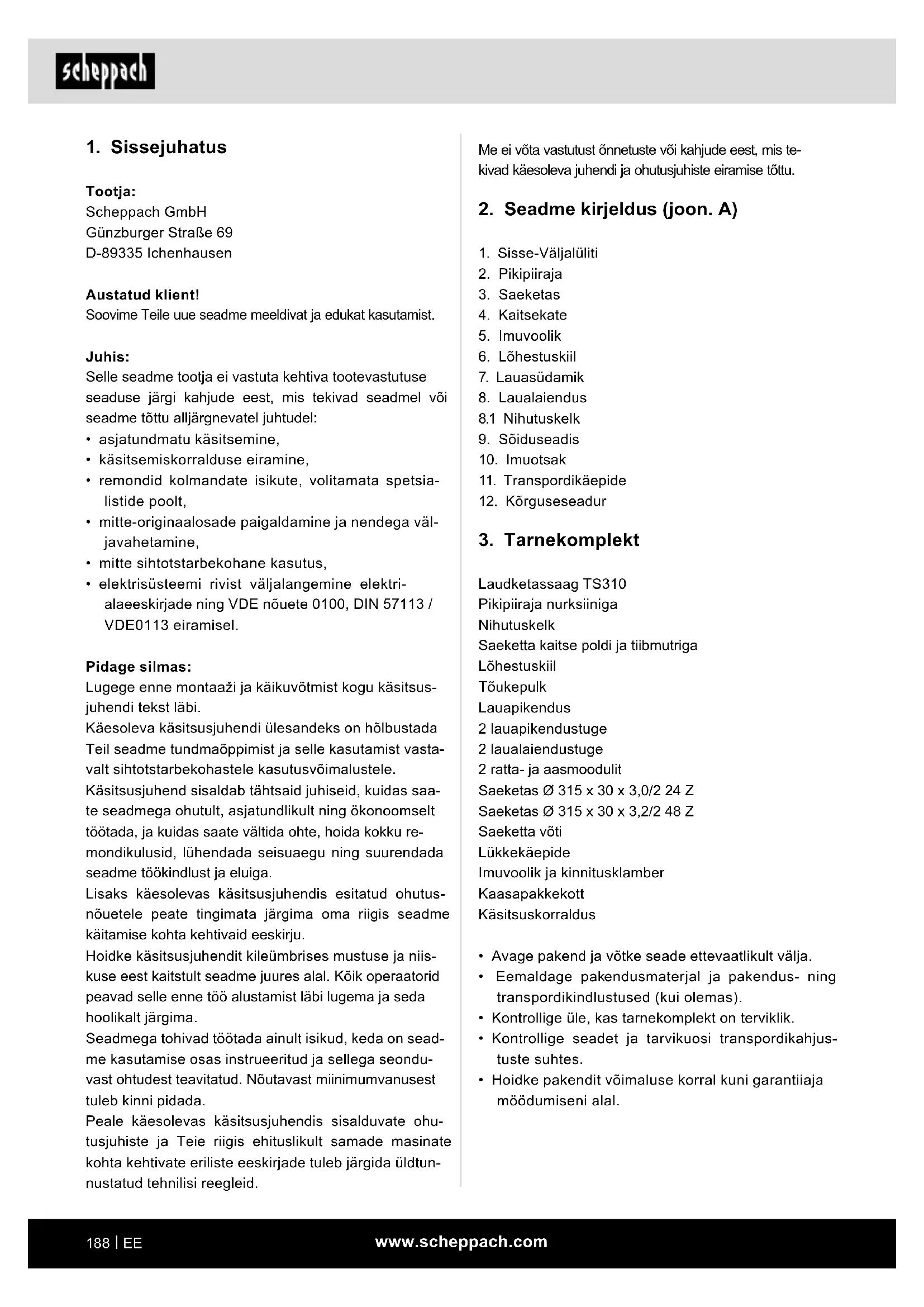 Leidke seadme juhend tasuta TS310 SCHEPPACH PDF-formaadis.