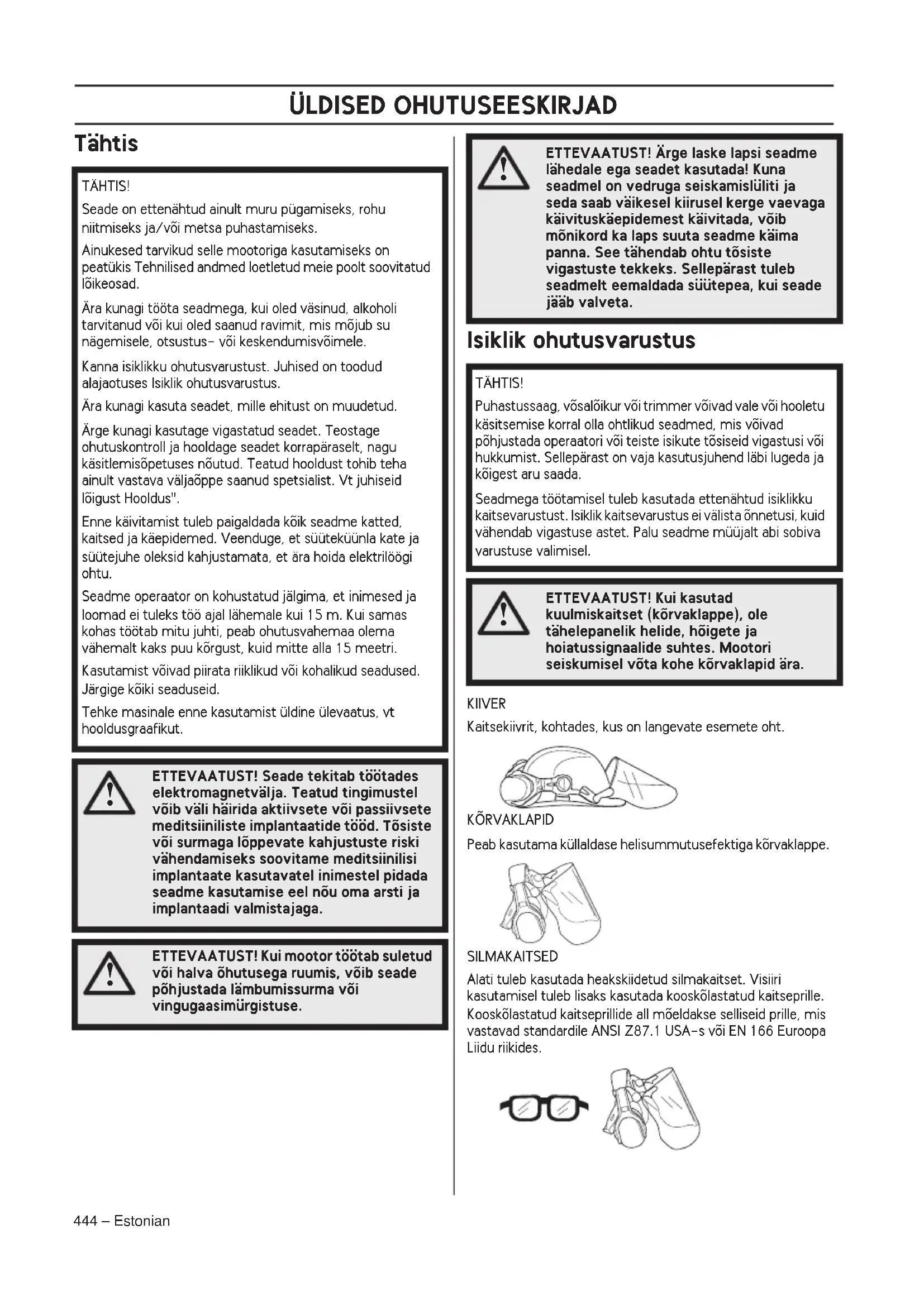 ETTEVAATUST! Ärge laske lapsi seadme lähedale ega seadet kasutada! Kuna seadmel on vedruga seiskamislüliti ja seda saab väikesel kiirusel kerge vaevaga käivituskäepidemest käivitada, võib mõnikord ka laps suuta seadme käima panna. See tähendab ohtu tõsiste vigastuste tekkeks. Sellepärast tuleb seadmelt eemaldada süütepea, kui seade jääb valveta. TÄHTIS! Puhastussaag, võsalõikur või trimmer võivad vale või hooletu käsitsemise korral olla ohtlikud seadmed, mis võivad põhjustada operaatori või teiste isikute tõsiseid vigastusi või hukkumist. Sellepärast on vaja kasutusjuhend läbi lugeda ja kõigest aru saada. Seadmega töötamisel tuleb kasutada ettenähtud isiklikku kaitsevarustust. Isiklik kaitsevarustus ei välista õnnetusi, kuid vähendab vigastuse astet. Palu seadme müüjalt abi sobiva varustuse valimisel.