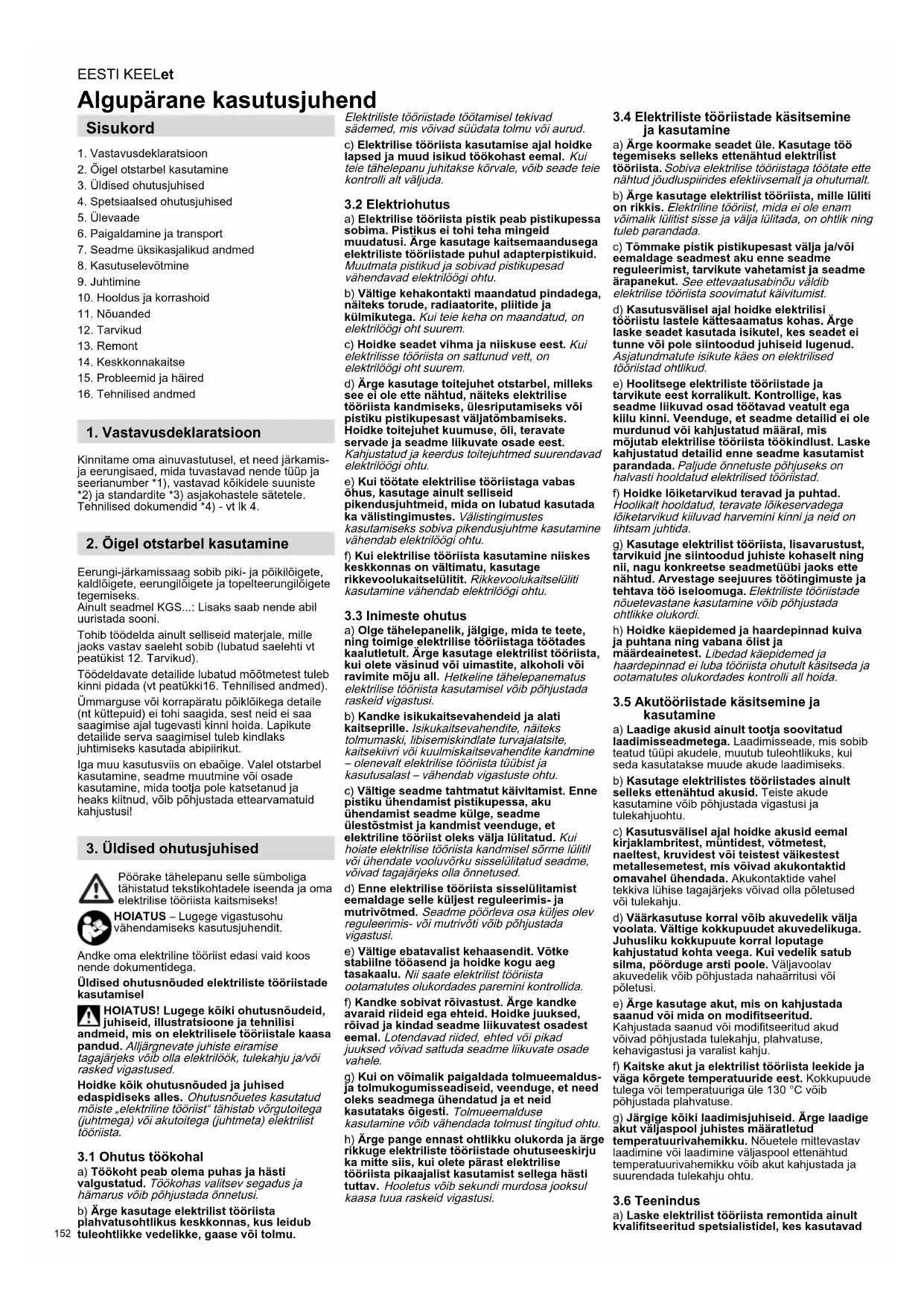 a) Laske elektrilist tööriista remontida ainult kvalifitseeritud spetsialistidel, kes kasutavad Sisukord