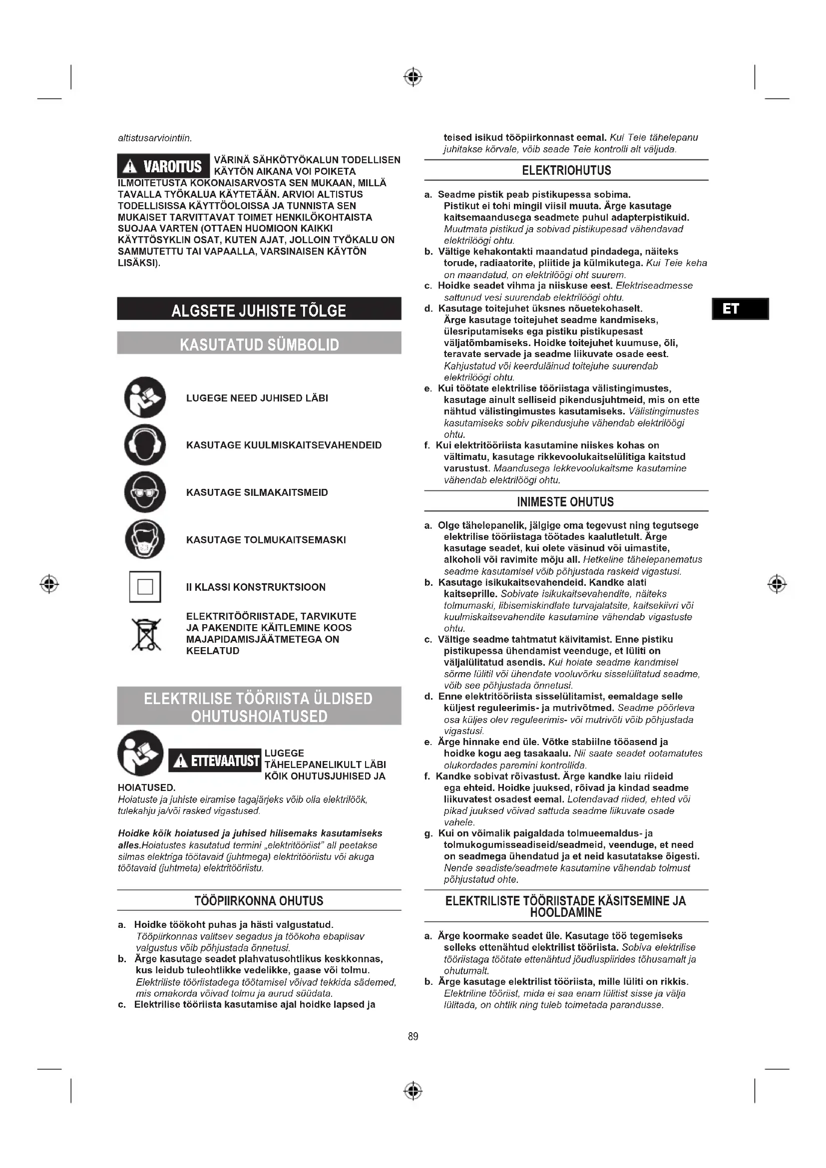 HOIATUSED. Hoiatuste ja juhiste eiramise tagajärjeks võib olla elektrilöök, tulekahju ja/või rasked vigastused. Hoidke kõik hoiatused ja juhised hilisemaks kasutamiseks alles.Hoiatustes kasutatud termini „elektritööriist” all peetakse silmas elektriga töötavaid (juhtmega) elektritööriistu või akuga töötavaid (juhtmeta) elektritööriistu.