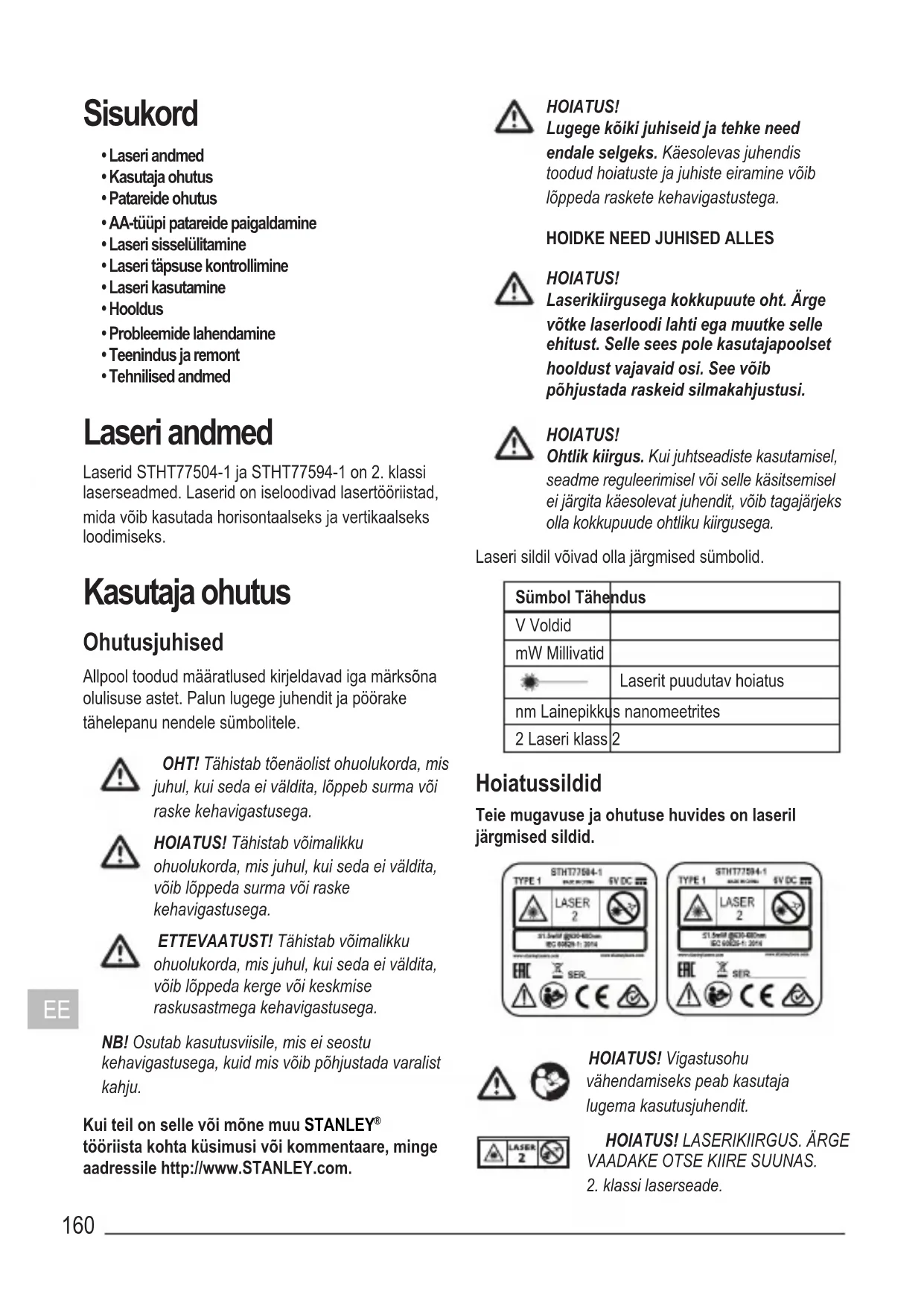 - Tehnilised andmed Laseri andmed Laserid STHT77504-1 ja STHT77594-1 on 2. klassi laserseadmed. Laserid on iseloodivad lasertööriistad, mida võib kasutada horisontaalseks ja vertikaalseks loodimiseks. Kasutaja ohutus Ohutusjuhised Allpool toodud määratlused kirjeldavad iga märksõna olulisuse astet. Palun lugege juhendit ja pöörake tähelepanu nendele sümbolitele. OHT! Tähistab tõenäolist ohuolukorda, mis juhul, kui seda ei väldita, lõppeb surma või raske kehavigastusega. HOIATUS! Tähistab võimalikku ohuolukorda, mis juhul, kui seda ei väldita, võib lõppeda surma või raske kehavigastusega. ETTEVAATUST! Tähistab võimalikku ohuolukorda, mis juhul, kui seda ei väldita, võib lõppeda kerge või keskmise raskusastmega kehavigastusega. NB! Osutab kasutusviisile, mis ei seostu kehavigastusega, kuid mis võib põhjustada varalist kahju. Kui teil on selle või mõne muu STANLEY
