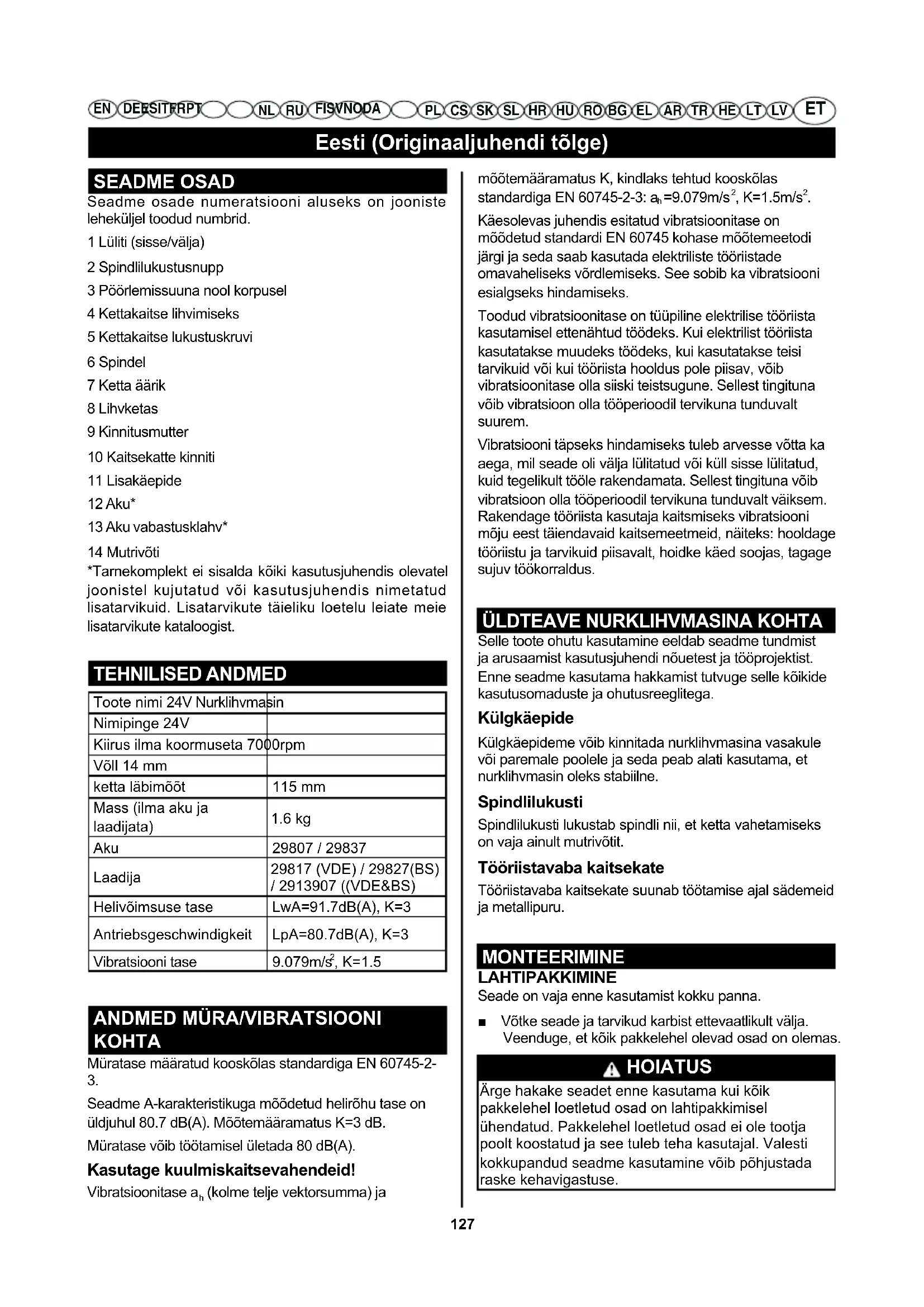 Selle toote ohutu kasutamine eeldab seadme tundmist ja arusaamist kasutusjuhendi nõuetest ja tööprojektist. Enne seadme kasutama hakkamist tutvuge selle kõikide kasutusomaduste ja ohutusreeglitega. Külgkäepide Külgkäepideme võib kinnitada nurklihvmasina vasakule või paremale poolele ja seda peab alati kasutama, et nurklihvmasin oleks stabiilne. Spindlilukusti Spindlilukusti lukustab spindli nii, et ketta vahetamiseks on vaja ainult mutrivõtit. Tööriistavaba kaitsekate Tööriistavaba kaitsekate suunab töötamise ajal sädemeid ja metallipuru. MONTEERIMINE LAHTIPAKKIMINE Seade on vaja enne kasutamist kokku panna. ■ Võtke seade ja tarvikud karbist ettevaatlikult välja. Veenduge, et kõik pakkelehel olevad osad on olemas. HOIATUS Ärge hakake seadet enne kasutama kui kõik pakkelehel loetletud osad on lahtipakkimisel ühendatud. Pakkelehel loetletud osad ei ole tootja poolt koostatud ja see tuleb teha kasutajal. Valesti kokkupandud seadme kasutamine võib põhjustada raske kehavigastuse.Eesti (Originaaljuhendi tõlge)