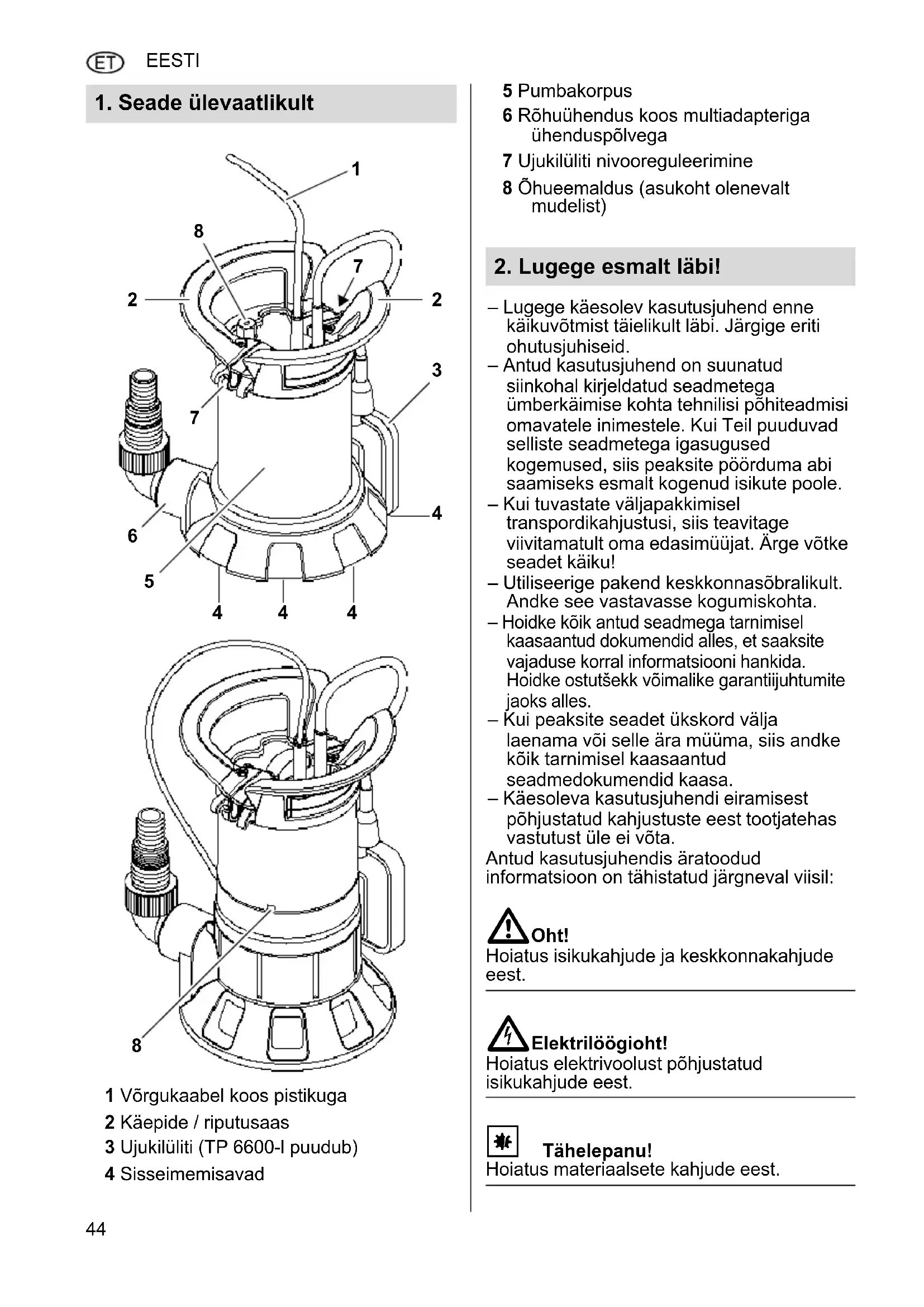 - Järgige sukelpumpade kohta kehtivaid seadusega sātestatud direktiive vōi onnetuste vältimise eeskirju.