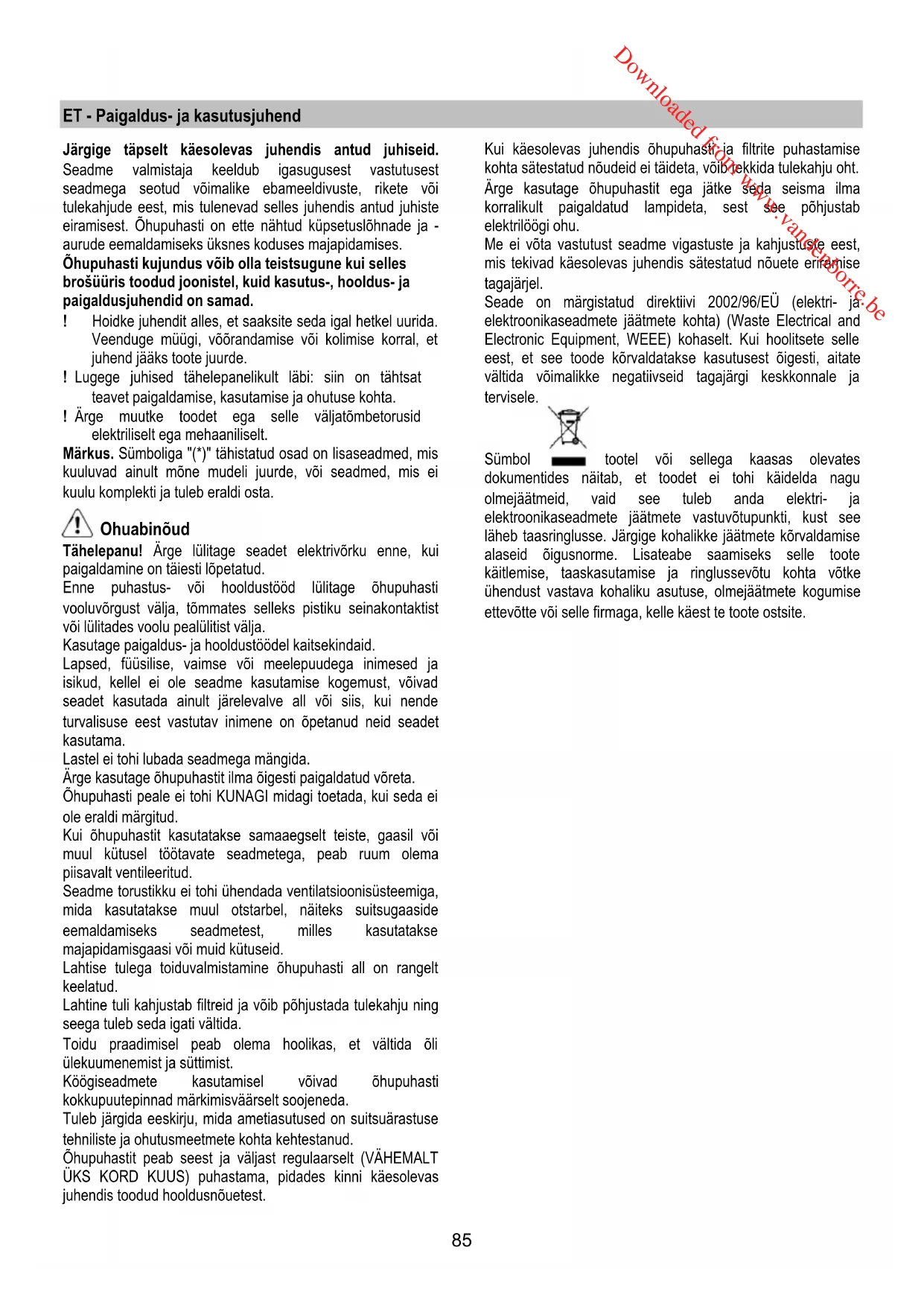 Downloaded from www.vandenborre.be85 ET - Paigaldus- ja kasutusjuhend Järgige täpselt käesolevas juhendis antud juhiseid. Seadme valmistaja keeldub igasugusest vastutusest seadmega seotud võimalike ebameeldivuste, rikete või tulekahjude eest, mis tulenevad selles juhendis antud juhiste eiramisest. Õhupuhasti on ette nähtud küpsetuslõhnade ja - aurude eemaldamiseks üksnes koduses majapidamises. Õhupuhasti kujundus võib olla teistsugune kui selles brošüüris toodud joonistel, kuid kasutus-, hooldus- ja paigaldusjuhendid on samad. ! Hoidke juhendit alles, et saaksite seda igal hetkel uurida. Veenduge müügi, võõrandamise või kolimise korral, et juhend jääks toote juurde. ! Lugege juhised tähelepanelikult läbi: siin on tähtsat teavet paigaldamise, kasutamise ja ohutuse kohta. ! Ärge muutke toodet ega selle väljatõmbetorusid elektriliselt ega mehaaniliselt. Märkus. Sümboliga "(*)" tähistatud osad on lisaseadmed, mis kuuluvad ainult mõne mudeli juurde, või seadmed, mis ei kuulu komplekti ja tuleb eraldi osta. Ohuabinõud Tähelepanu! Ärge lülitage seadet elektrivõrku enne, kui paigaldamine on täiesti lõpetatud. Enne puhastus- või hooldustööd lülitage õhupuhasti vooluvõrgust välja, tõmmates selleks pistiku seinakontaktist või lülitades voolu pealülitist välja. Kasutage paigaldus- ja hooldustöödel kaitsekindaid. Lapsed, füüsilise, vaimse või meelepuudega inimesed ja isikud, kellel ei ole seadme kasutamise kogemust, võivad seadet kasutada ainult järelevalve all või siis, kui nende turvalisuse eest vastutav inimene on õpetanud neid seadet kasutama. Lastel ei tohi lubada seadmega mängida. Ärge kasutage õhupuhastit ilma õigesti paigaldatud võreta. Õhupuhasti peale ei tohi KUNAGI midagi toetada, kui seda ei ole eraldi märgitud. Kui õhupuhastit kasutatakse samaaegselt teiste, gaasil või muul kütusel töötavate seadmetega, peab ruum olema piisavalt ventileeritud. Seadme torustikku ei tohi ühendada ventilatsioonisüsteemiga, mida kasutatakse muul otstarbel, näiteks suitsugaaside eemaldamiseks seadmetest, milles kasutatakse majapidamisgaasi või muid kütuseid. Lahtise tulega toiduvalmistamine õhupuhasti all on rangelt keelatud. Lahtine tuli kahjustab filtreid ja võib põhjustada tulekahju ning seega tuleb seda igati vältida. Toidu praadimisel peab olema hoolikas, et vältida õli ülekuumenemist ja süttimist. Köögiseadmete kasutamisel võivad õhupuhasti kokkupuutepinnad märkimisväärselt soojeneda. Tuleb järgida eeskirju, mida ametiasutused on suitsuärastuse tehniliste ja ohutusmeetmete kohta kehtestanud. Õhupuhastit peab seest ja väljast regulaarselt (VÄHEMALT ÜKS KORD KUUS) puhastama, pidades kinni käesolevas juhendis toodud hooldusnõuetest. Kui käesolevas juhendis õhupuhasti ja filtrite puhastamise kohta sätestatud nõudeid ei täideta, võib tekkida tulekahju oht. Ärge kasutage õhupuhastit ega jätke seda seisma ilma korralikult paigaldatud lampideta, sest see põhjustab elektrilöögi ohu. Me ei võta vastutust seadme vigastuste ja kahjustuste eest, mis tekivad käesolevas juhendis sätestatud nõuete eriramise tagajärjel. Seade on märgistatud direktiivi 2002/96/EÜ (elektri- ja elektroonikaseadmete jäätmete kohta) (Waste Electrical and Electronic Equipment, WEEE) kohaselt. Kui hoolitsete selle eest, et see toode kõrvaldatakse kasutusest õigesti, aitate vältida võimalikke negatiivseid tagajärgi keskkonnale ja tervisele. Sümbol tootel või sellega kaasas olevates dokumentides näitab, et toodet ei tohi käidelda nagu olmejäätmeid, vaid see tuleb anda elektri- ja elektroonikaseadmete jäätmete vastuvõtupunkti, kust see läheb taasringlusse. Järgige kohalikke jäätmete kõrvaldamise alaseid õigusnorme. Lisateabe saamiseks selle toote käitlemise, taaskasutamise ja ringlussevõtu kohta võtke ühendust vastava kohaliku asutuse, olmejäätmete kogumise ettevõtte või selle firmaga, kelle käest te toote ostsite. Downloaded from www.vandenborre.be86 Kasutamine Õhupuhasti on valmistatud nii, et seda saaks kasutada nii väljatõmberežiimis kui ka õhku filtreeriva toasisese tsirkulatsiooniga režiimis. Väljatõmberežiim Aur viiakse välja ühendusääriku külge kinnitatud väljatõmbetoru abil. Väljatõmbetoru diameeter peab olema sama suur kui ühendusvõru oma. Tähelepanu! Väljatõmbetoru ei kuulu komplekti ja tuleb ise osta. Toru horisontaalne lõik peab olema kergelt ülespoole kaldu (umbes 10°), et õhku kergemini väliskeskkonda viia. Kui õhupuhastil on söefiltrid, tuleb need eemaldada. Ühendage õhupuhasti väljatõmbetorude ja seinal asuvate väljalaskeavadega, mille diameeter on võrdne õhupuhasti väljalaskeava (ühendusäärikuga) omaga. Peenemate torude ja väiksemate seinal asuvate väljalaskeavade kasutamisel väheneb tõmme ja suureneb oluliselt müra. Seetõttu ei võta meie sellisel juhul endale mingit vastutust. ! Kasutage minimaalse vajaliku pikkusega toru. ! Kasutage võimalikult väheste põlvedega toru (torupõlve maksimaalne nurk: 90°). ! Vältige toru ristlõike olulist muutumist. ! Kasutage võimalikult sileda sisepinnaga toru. ! Toru materjal peab olema standarditega heaks kiidetud. Filtreeriv versioon Välja tõmmatud õhk puhastatakse rasvast ja lõhnatustatakse, enne kui see tagasi siseruumidesse juhitakse. Sellel režiimil kasutamiseks tuleb paigaldada täiendav aktiivsöega filtreerimissüsteem.