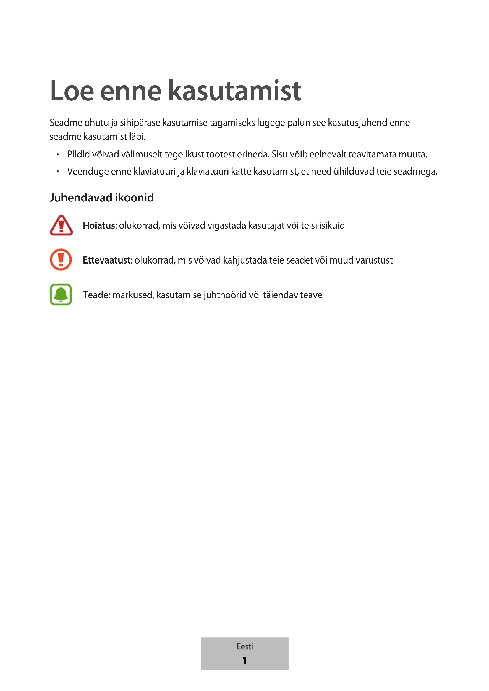 Loe enne kasutamist Seadme ohutu ja sihipärase kasutamise tagamiseks lugege palun see kasutusjuhend enne seadme kasutamist läbi.