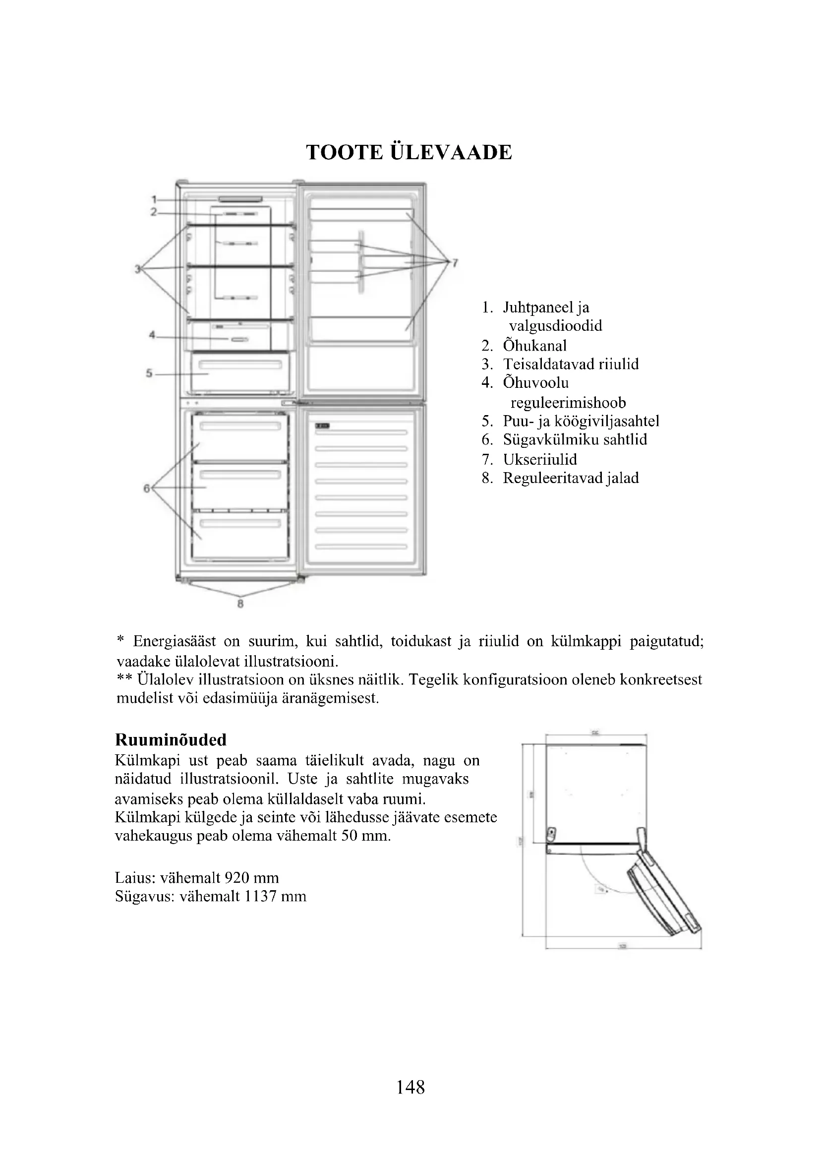 - Energiasääst on suurim, kui sahtlid, toidukast ja riiulid on külmkappi paigutatud; vaadake ülalolevat illustratsiooni. ** Ülalolev illustratsioon on üksnes näitlik. Tegelik konfiguratsioon oleneb konkreetsest mudelist või edasimüüja äranägemisest. Ruuminõuded Külmkapi ust peab saama täielikult avada, nagu on näidatud illustratsioonil. Uste ja sahtlite mugavaks avamiseks peab olema küllaldaselt vaba ruumi. Külmkapi külgede ja seinte või lähedusse jäävate esemete vahekaugus peab olema vähemalt 50 mm. Laius: vähemalt 920 mm Sügavus: vähemalt 1137 mm149 KASUTAMINE