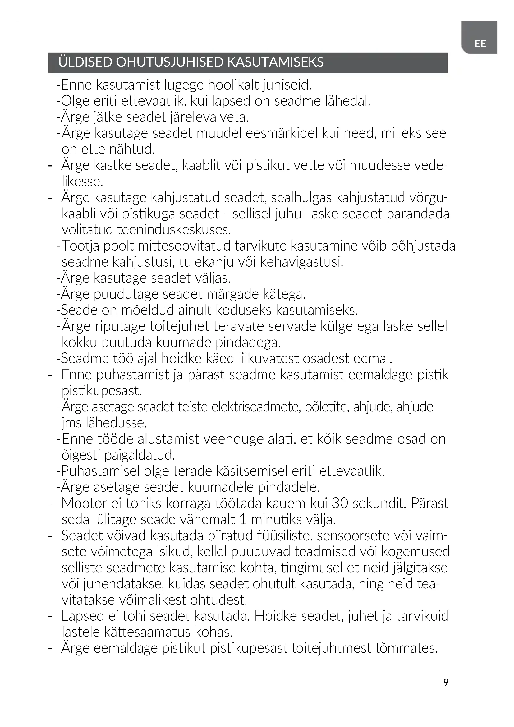 -Eemaldage seade vooluvorgust, kui see jaab jarevalveta, ja enne kokkupanekut, demonteerimist voi puhastamist.