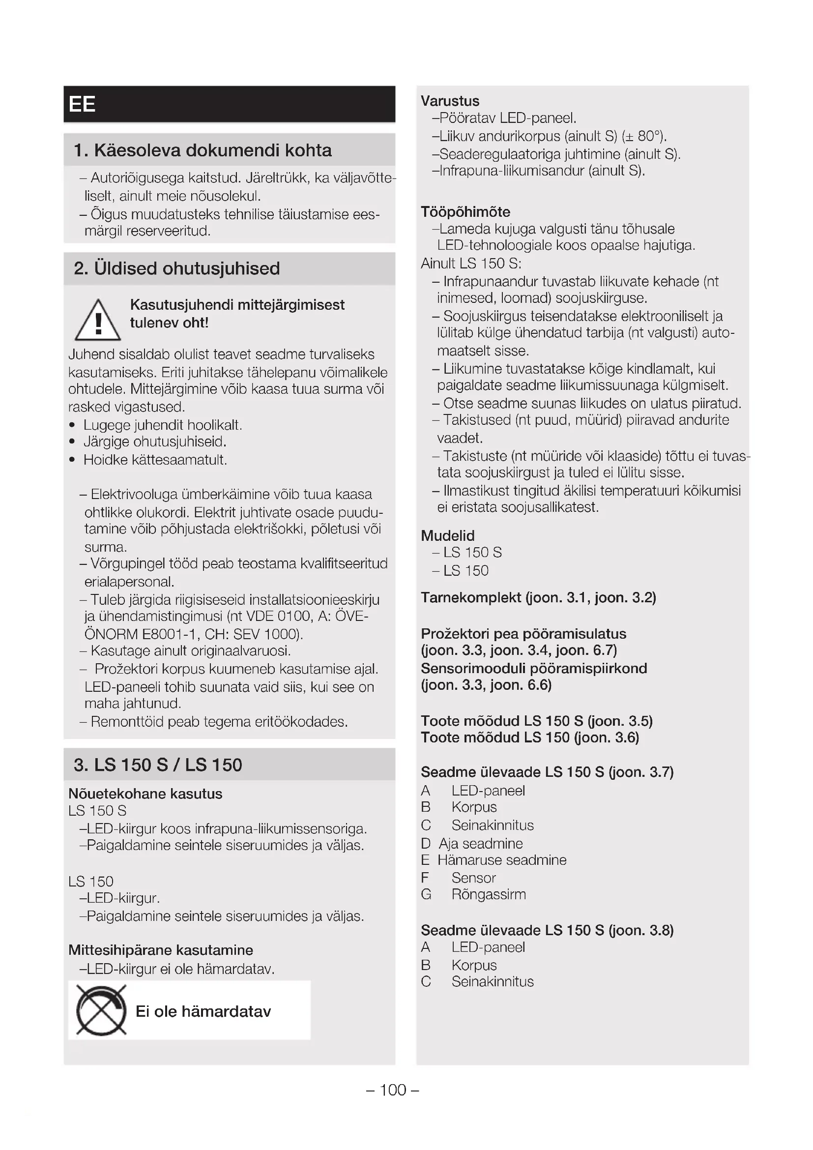 Nõuetekohane kasutus LS150S – LED-kiirgur koos infrapuna-liikumissensoriga. – Paigaldamine seintele siseruumides ja väljas. LS150 – LED-kiirgur. – Paigaldamine seintele siseruumides ja väljas. Mittesihipärane kasutamine – LED-kiirgur ei ole hämardatav. Ei ole hämardatav Varustus – Pööratav LED-paneel. – Liikuv andurikorpus (ainult S) (±80°). – Seaderegulaatoriga juhtimine (ainult S). – Infrapuna-liikumisandur (ainult S). Tööpõhimõte – Lameda kujuga valgusti tänu tõhusale LED-tehnoloogiale koos opaalse hajutiga. Ainult LS 150 S: – Infrapunaandur tuvastab liikuvate kehade (nt inimesed, loomad) soojuskiirguse. – Soojuskiirgus teisendatakse elektrooniliselt ja lülitab külge ühendatud tarbija (nt valgusti) auto- maatselt sisse. – Liikumine tuvastatakse kõige kindlamalt, kui paigaldate seadme liikumissuunaga külgmiselt. – Otse seadme suunas liikudes on ulatus piiratud. – Takistused (nt puud, müürid) piiravad andurite vaadet. – Takistuste (nt müüride või klaaside) tõttu ei tuvas- tata soojuskiirgust ja tuled ei lülitu sisse. – Ilmastikust tingitud äkilisi temperatuuri kõikumisi ei eristata soojusallikatest. Mudelid – LS150S – LS150 Tarnekomplekt (joon. 3.1, joon.3.2) Prožektori pea pööramisulatus (joon. 3.3, joon.3.4, joon.6.7) Sensorimooduli pööramispiirkond (joon. 3.3, joon.6.6) Toote mõõdud LS150S (joon. 3.5) Toote mõõdud LS150 (joon. 3.6) Seadme ülevaade LS 150 S (joon. 3.7) A LED-paneel B Korpus C Seinakinnitus D Aja seadmine E Hämaruse seadmine F Sensor G Rõngassirm Seadme ülevaade LS 150 S (joon. 3.8) A LED-paneel B Korpus C Seinakinnitus– 101 – Tehnilised andmed – Mõõtmed (K × L × S): LS 150 S: 210×155×176mm LS 150: 178×157×178mm – Võimsustarve (P