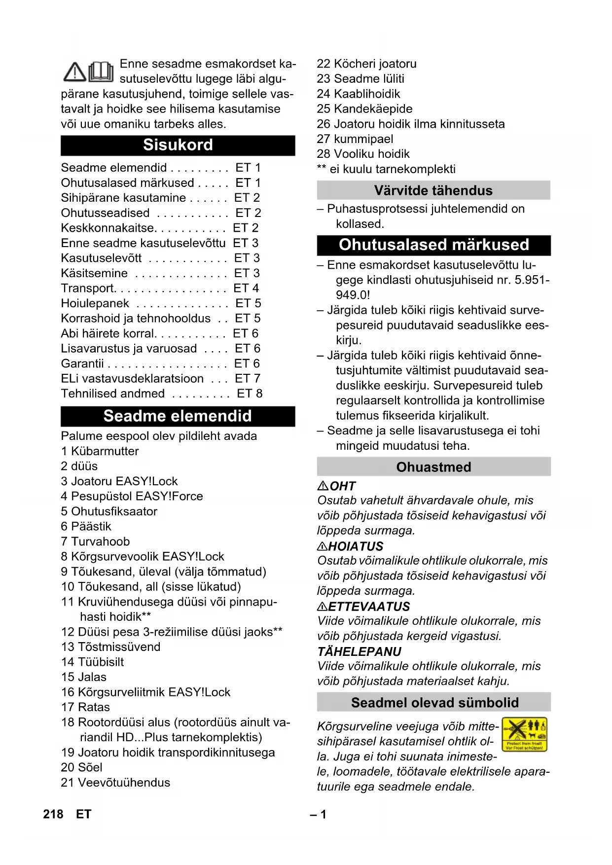 dB(A) 89 Мерки и тегла Дължина мм 351 Широчина мм 312 Височина мм 904 Типично собствено тегло кг 20,5 217BG– 1 Enne sesadme esmakordset ka- sutuselevõttu lugege läbi algu- pärane kasutusjuhend, toimige sellele vas- tavalt ja hoidke see hilisema kasutamise või uue omaniku tarbeks alles. Palume eespool olev pildileht avada 1 Kübarmutter 2 düüs 3 Joatoru EASY!Lock 4 Pesupüstol EASY!Force 5 Ohutusfiksaator 6 Päästik 7 Turvahoob 8 Kõrgsurvevoolik EASY!Lock 9 Tõukesand, üleval (välja tõmmatud) 10 Tõukesand, all (sisse lükatud) 11 Kruviühendusega düüsi või pinnapu- hasti hoidik** 12 Düüsi pesa 3-režiimilise düüsi jaoks** 13 Tõstmissüvend 14 Tüübisilt 15 Jalas 16 Kõrgsurveliitmik EASY!Lock 17 Ratas 18 Rootordüüsi alus (rootordüüs ainult va- riandil HD...Plus tarnekomplektis) 19 Joatoru hoidik transpordikinnitusega 20 Sõel 21 Veevõtuühendus 22 Köcheri joatoru 23 Seadme lüliti 24 Kaablihoidik 25 Kandekäepide 26 Joatoru hoidik ilma kinnitusseta 27 kummipael 28 Vooliku hoidik ** ei kuulu tarnekomplekti – Puhastusprotsessi juhtelemendid on kollased. – Enne esmakordset kasutuselevõttu lu- gege kindlasti ohutusjuhiseid nr. 5.951- 949.0! – Järgida tuleb kõiki riigis kehtivaid surve- pesureid puudutavaid seaduslikke ees- kirju. – Järgida tuleb kõiki riigis kehtivaid õnne- tusjuhtumite vältimist puudutavaid sea- duslikke eeskirju. Survepesureid tuleb regulaarselt kontrollida ja kontrollimise tulemus fikseerida kirjalikult. – Seadme ja selle lisavarustusega ei tohi mingeid muudatusi teha. OHT Osutab vahetult ähvardavale ohule, mis võib põhjustada tõsiseid kehavigastusi või lõppeda surmaga. 몇 HOIATUS Osutab võimalikule ohtlikule olukorrale, mis võib põhjustada tõsiseid kehavigastusi või lõppeda surmaga. 몇 ETTEVAATUS Viide võimalikule ohtlikule olukorrale, mis võib põhjustada kergeid vigastusi. TÄHELEPANU Viide võimalikule ohtlikule olukorrale, mis võib põhjustada materiaalset kahju. Kõrgsurveline veejuga võib mitte- sihipärasel kasutamisel ohtlik ol- la. Juga ei tohi suunata inimeste- le, loomadele, töötavale elektrilisele apara- tuurile ega seadmele endale. Sisukord Seadme elemendid . . . . . . . . . ET 1 Ohutusalased märkused . . . . . ET 1 Sihipärane kasutamine . . . . . . ET 2 Ohutusseadised . . . . . . . . . . . ET 2 Keskkonnakaitse. . . . . . . . . . . ET 2 Enne seadme kasutuselevõttu ET 3 Kasutuselevõtt . . . . . . . . . . . . ET 3 Käsitsemine . . . . . . . . . . . . . . ET 3 Transport. . . . . . . . . . . . . . . . . ET 4 Hoiulepanek . . . . . . . . . . . . . . ET 5 Korrashoid ja tehnohooldus . . ET 5 Abi häirete korral. . . . . . . . . . . ET 6 Lisavarustus ja varuosad . . . . ET 6 Garantii . . . . . . . . . . . . . . . . . . ET 6 ELi vastavusdeklaratsioon . . . ET 7 Tehnilised andmed . . . . . . . . . ET 8 Seadme elemendid Värvitde tähendus Ohutusalased märkused Ohuastmed Seadmel olevad sümbolid 218 ET– 2 Vastavalt kehtivatele eeskirjadele ei tohi seadet kunagi kasutada ilma joogiveevõrgu juurde paigal- datud süsteemieraldajata. Kasuta- da tuleb firma KÄRCHER sobivat süstee- mieraldajat või alternatiivina standardile EN 12729 tüüp BA vastavat süsteemieraldajat. Läbi süsteemieraldaja voolanud vesi ei ole joogikõlbulik. Kasutage ainult seda kõrgsurvepesurit – kõrgsurvejaga puhastamiseks (nt fas- saadide, terrasside, aiatööriistade pu- hastamiseks). Lisavarustusse kuuluvate tarvikutega saab lisada puhastusvahendit. Raskesti eemaldatava mustuse jaoks soo- vitame rootordüüsi (ainult variandil HD...Plus tarnekomplektis) Nõuded vee kvaliteedile: TÄHELEPANU Kõrgsurvevedelikuna tohib kasutada ainult puhast vett. Mustus põhjustab seadme enne- aegset kulumist või ladestub seadmesse. Kui kasutatakse tarbevett, ei tohi üleatada järgmisi piirväärtusi. Ohutusseadised on mõeldud kasutaja kaitsmiseks vigastuste eest ning neid ei tohi deaktiveerida ega nende funktsiooni muuta. Kui pihustipüstolil asuv päästik lastakse lahti, lülitub välja pumba rõhuhoidja ning kõrgsurve juga seiskub. Päästikule vajuta- misel lülitub pump jälle sisse. Elektrilistes ja elektroonilistes seadmetes sisaldub tihti komponente, mis võivad va- lesti ümber käies või vale jäätmekäitluse korral olla ohuks inimeste tervisele ja kesk- konnale. Neid komponente on aga seadme nõuetekohaseks tööks hädasti vaja. Selle sümboliga tähistatud seadmeid ei tohi pan- na olmeprügi hulka. Märkusi koostisainete kohta (REACH) Aktuaalse info koostisainete kohta leiate aadressilt: www.kaercher.com/REACH Sihipärane kasutamine pH-väärtus 6,5...9,5 elektrijuhtivus * Magevee elektrijuhtivus +1200 μS/cm mahaarvutatavad ained ** < 0,5 mg/l filtreeritavad ained *** < 50 mg/l süsivesikuid < 20 mg/l kloriid < 300 mg/l sulfaat < 240 mg/l Kaltsium < 200 mg/l üldine karedus < 28 °dH < 50 °TH < 500 ppm (mg CaCO
