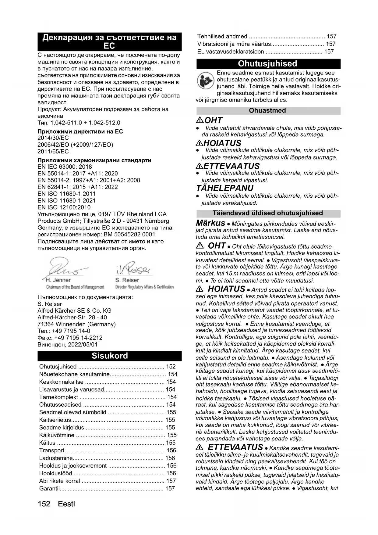 - EN ISO 12100:2010 Упълномощено лице, 0197 TÜV Rheinland LGA Products GmbH; Tillystraße 2 D - 90431 Nürnberg, Germany, е извършило ЕО изследването на типа, регистрационен номер: BM 50545282 0001 Подписващите лица действат от името и като пълномощници на управителния орган. Пълномощник по документацията: S. Reiser Alfred Kärcher SE & Co. KG Alfred-Kärcher-Str. 28 - 40 71364 Winnenden (Germany) Тел.: +49 7195 14-0 Факс: +49 7195 14-2212 Виненден, 2022/05/01 Sisukord Ohutusjuhised Enne seadme esmast kasutamist lugege see ohutusalane peatükk ja antud originaalkasutus- juhend läbi. Toimige neile vastavalt. Hoidke ori- ginaalkasutusjuhend hilisemaks kasutamiseks või järgmise omaniku tarbeks alles. Ohuastmed OHT ● Viide vahetult ähvardavale ohule, mis võib põhjusta- da raskeid kehavigastusi või lõppeda surmaga. 몇 HOIATUS ● Viide võimalikule ohtlikule olukorrale, mis võib põh- justada raskeid kehavigastusi või lõppeda surmaga. 몇 ETTEVAATUS ● Viide võimalikule ohtlikule olukorrale, mis võib põh- justada kergeid vigastusi. TÄHELEPANU ● Viide võimalikule ohtlikule olukorrale, mis võib põh- justada varakahjusid. Täiendavad üldised ohutusjuhised Märkus ● Mõningates piirkondades võivad eeskir- jad piirata antud seadme kasutamist. Laske end nõus- tada oma kohalikul ametiasutusel. OHT ● Oht elule lõikevigastuste tõttu seadme kontrollimatust liikumisest tingitult. Hoidke kehaosad lii- kuvatest detailidest eemal. ● Vigastusoht ülespaiskuva- te või kukkuvate objektide tõttu. Ärge kunagi kasutage seadet, kui 15 m raadiuses on inimesi, eriti lapsi või loo- mi. ● Te ei tohi seadmel ette võtta muudatusi. 몇 HOIATUS ● Antud seadet ei tohi käitada lap- sed ega inimesed, kes pole käesoleva juhendiga tutvu- nud. Kohalikud sätted võivad piirata operaatori vanust. ● Teil on vaja takistamatut vaadet tööpiirkonnale, et tu- vastada võimalikke ohte. Kasutage seadet ainult hea valgustuse korral. ● Enne kasutamist veenduge, et seade, kõik juhtseadised ja turvaseadmed tööt aksid kor ralikult. Kontrollige, ega sulgurid pole lahti, veendu- ge, et kõik kaitsekatted ja käepidemed oleksid korrali- kult ja kindlalt kinnitatud. Ärge kasutage seadet, kui selle seisund ei ole laitmatu. ● Asendage kulunud või kahjustatud detailid enne seadme käikuvõtmist. ● Ärge käitage seadet kunagi, kui käepidemel asuv seadmelü- liti ei lülita nõuetekohaselt sisse või välja. ● Tagasilöögi oht tasakaalu kaotuse tõttu. Vältige ebanormaalset ke- hahoidu, hoolitsege tugeva, kindla seisuasendi eest ja hoidke tasakaalu. ● Tõsised vigastused hooletuse pä- rast, kui sagedase kasutamise tõttu seadmega ära har- jutakse. ● Seisake seade viivitamatult ja kontrollige võimalikke kahjustusi või tuvastage vibratsiooni põhjus, kui seade on maha kukkunud, löögi saanud või vibree- rib ebaharilikult. Laske kahjustused volitatud teenindu- ses parandada või vahetage seade välja. 몇 ETTEVAATUS ● Kandke seadme kasutami- sel täielikku silma- ja kuulmiskaitsevahendit, tugevaid ja robustseid kindaid ning peakaitsevahendit. Kui töö on tolmune, kandke näomaski. ● Kandke seadmega tööta- misel pikki raskeid pükse, tugevaid jalatseid ja hästiistu- vaid kindaid. Ärge töötage paljajalu. Ärge kandke ehteid, sandaale ega lühikesi pükse. ● Vigastusoht, kui Ohutusjuhised p. 152