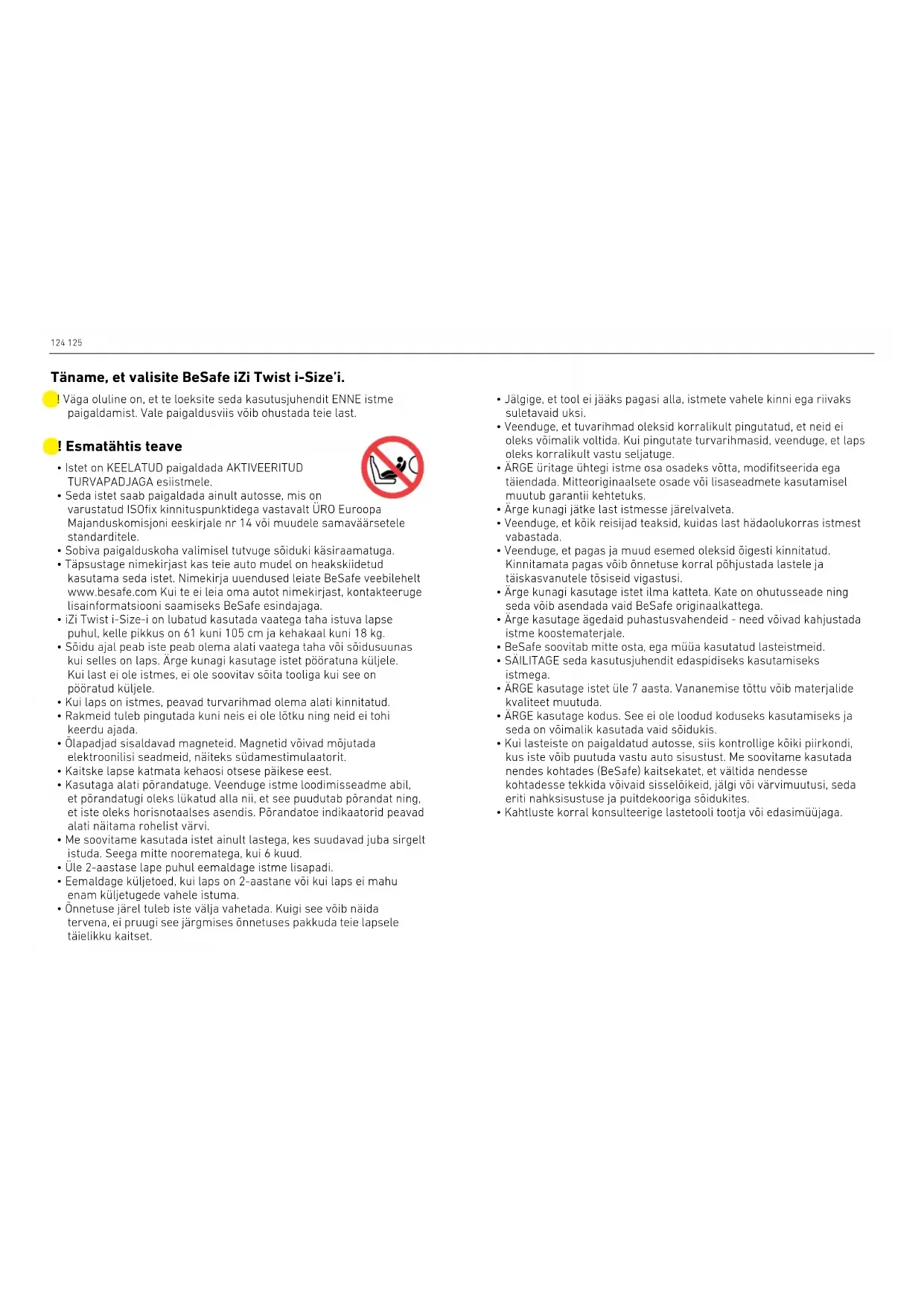 - Kahtluste korral konsulteerige lastetooli tootja või edasimüüjaga. ! Väga oluline on, et te loeksite seda kasutusjuhendit ENNE istme paigaldamist. Vale paigaldusviis võib ohustada teie last. Täname, et valisite BeSafe iZi Twist i-Size’i.126 127