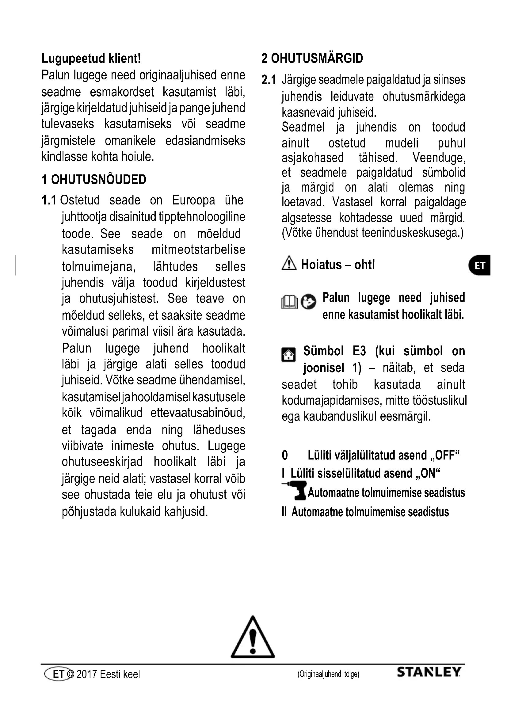 2.1 Järgigeeadmele paigaldatud ja siinses juhendis leiduvate ohutusmärkidega kaasnevaid juhiseid.