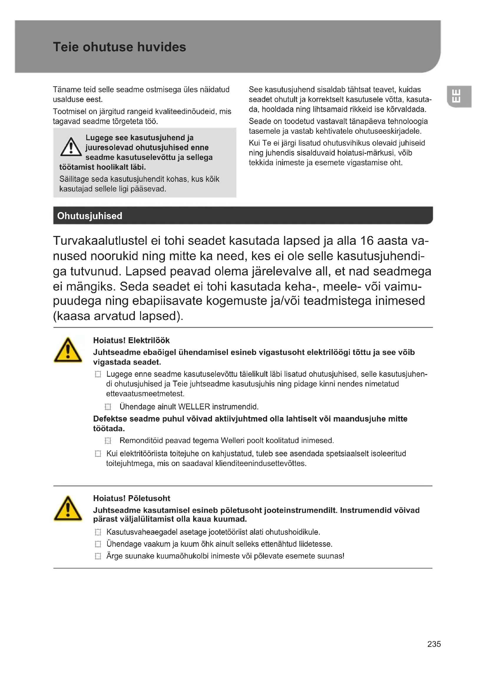 Teie ohutuse huvides Täname teid selle seadme ostmisega üles näidatud usalduse eest. Tootmisel on järgitud rangeid kvaliteedinõudeid, mis tagavad seadme tõrgeteta töö. Lugege see kasutusjuhend ja juuresolevad ohutusjuhised enne seadme kasutuselevõttu ja sellega töötamist hoolikalt läbi. Säilitage seda kasutusjuhendit kohas, kus kõik kasutajad sellele ligi pääsevad. See kasutusjuhend sisaldab tähtsat teavet, kuidas seadet ohutult ja korrektselt kasutusele võtta, kasuta- da, hooldada ning lihtsamaid rikkeid ise kõrvaldada. Seade on toodetud vastavalt tänapäeva tehnoloogia tasemele ja vastab kehtivatele ohutuseeskirjadele. Kui Te ei järgi lisatud ohutusvihikus olevaid juhiseid ning juhendis sisalduvaid hoiatusi-märkusi, võib tekkida inimeste ja esemete vigastamise oht. Ohutusjuhised Turvakaalutlustel ei tohi seadet kasutada lapsed ja alla 16 aasta va- nused noorukid ning mitte ka need, kes ei ole selle kasutusjuhendi- ga tutvunud. Lapsed peavad olema järelevalve all, et nad seadmega ei mängiks. Seda seadet ei tohi kasutada keha-, meele- või vaimu- puudega ning ebapiisavate kogemuste ja/või teadmistega inimesed (kaasa arvatud lapsed). Hoiatus! Elektrilöök Juhtseadme ebaõigel ühendamisel esineb vigastusoht elektrilöögi tõttu ja see võib vigastada seadet. Lugege enne seadme kasutuselevõttu täielikult läbi lisatud ohutusjuhised, selle kasutusjuhen- di ohutusjuhised ja Teie juhtseadme kasutusjuhis ning pidage kinni nendes nimetatud ettevaatusmeetmetest. Ühendage ainult WELLER instrumendid. Defektse seadme puhul võivad aktiivjuhtmed olla lahtiselt või maandusjuhe mitte töötada. Remonditöid peavad tegema Welleri poolt koolitatud inimesed. Kui elektritööriista toitejuhe on kahjustatud, tuleb see asendada spetsiaalselt isoleeritud toitejuhtmega, mis on saadaval klienditeenindusettevõttes. Hoiatus! Põletusoht Juhtseadme kasutamisel esineb põletusoht jooteinstrumendilt. Instrumendid võivad pärast väljalülitamist olla kaua kuumad. Kasutusvaheaegadel asetage jootetööriist alati ohutushoidikule. Ühendage vaakum ja kuum õhk ainult selleks ettenähtud liidetesse. Ärgesuunakekuumaõhukolbiinimestevõipõlevateesemetesuunas! EE236