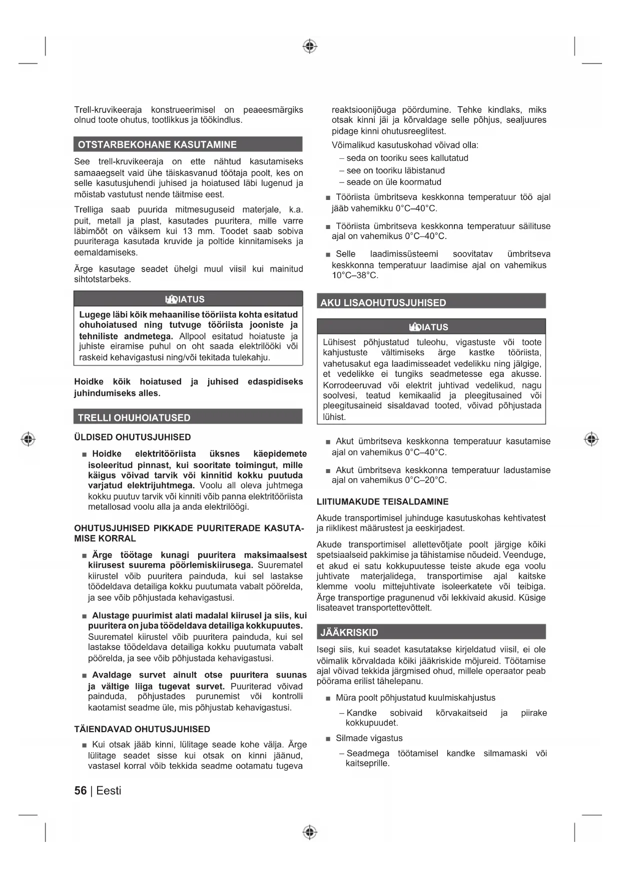 ■ Kui otsak jääb kinni, lülitage seade kohe välja. Ärge lülitage seadet sisse kui otsak on kinni jäänud, vastasel korral võib tekkida seadme ootamatu tugeva reaktsioonijõuga pöördumine. Tehke kindlaks, miks otsak kinni jäi ja kõrvaldage selle põhjus, sealjuures pidage kinni ohutusreeglitest. Võimalikud kasutuskohad võivad olla: – seda on tooriku sees kallutatud – see on tooriku läbistanud – seade on üle koormatud ■ Tööriista ümbritseva keskkonna temperatuur töö ajal jääb vahemikku 0°C‒40°C. ■ Tööriista ümbritseva keskkonna temperatuur säilituse ajal on vahemikus 0°C‒40°C. ■ Selle laadimissüsteemi soovitatav ümbritseva keskkonna temperatuur laadimise ajal on vahemikus 10°C‒38°C. AKU LISAOHUTUSJUHISED HOIATUS Lühisest põhjustatud tuleohu, vigastuste või toote kahjustuste vältimiseks ärge kastke tööriista, vahetusakut ega laadimisseadet vedelikku ning jälgige, et vedelikke ei tungiks seadmetesse ega akusse. Korrodeeruvad või elektrit juhtivad vedelikud, nagu soolvesi, teatud kemikaalid ja pleegitusained või pleegitusaineid sisaldavad tooted, võivad põhjustada lühist. ■ Akut ümbritseva keskkonna temperatuur kasutamise ajal on vahemikus 0°C‒40°C. ■ Akut ümbritseva keskkonna temperatuur ladustamise ajal on vahemikus 0°C‒20°C. LIITIUMAKUDE TEISALDAMINE Akude transportimisel juhinduge kasutuskohas kehtivatest ja riiklikest määrustest ja eeskirjadest. Akude transportimisel allettevõtjate poolt järgige kõiki spetsiaalseid pakkimise ja tähistamise nõudeid. Veenduge, et akud ei satu kokkupuutesse teiste akude ega voolu juhtivate materjalidega, transportimise ajal kaitske klemme voolu mittejuhtivate isoleerkatete või teibiga. Ärge transportige pragunenud või lekkivaid akusid. Küsige lisateavet transportettevõttelt. JÄÄKRISKID Isegi siis, kui seadet kasutatakse kirjeldatud viisil, ei ole võimalik kõrvaldada kõiki jääkriskide mõjureid. Töötamise ajal võivad tekkida järgmised ohud, millele operaator peab pöörama erilist tähelepanu. ■ Müra poolt põhjustatud kuulmiskahjustus – Kandke sobivaid kõrvakaitseid ja piirake kokkupuudet. ■ Silmade vigastus – Seadmega töötamisel kandke silmamaski või kaitseprille.57 Eesti |