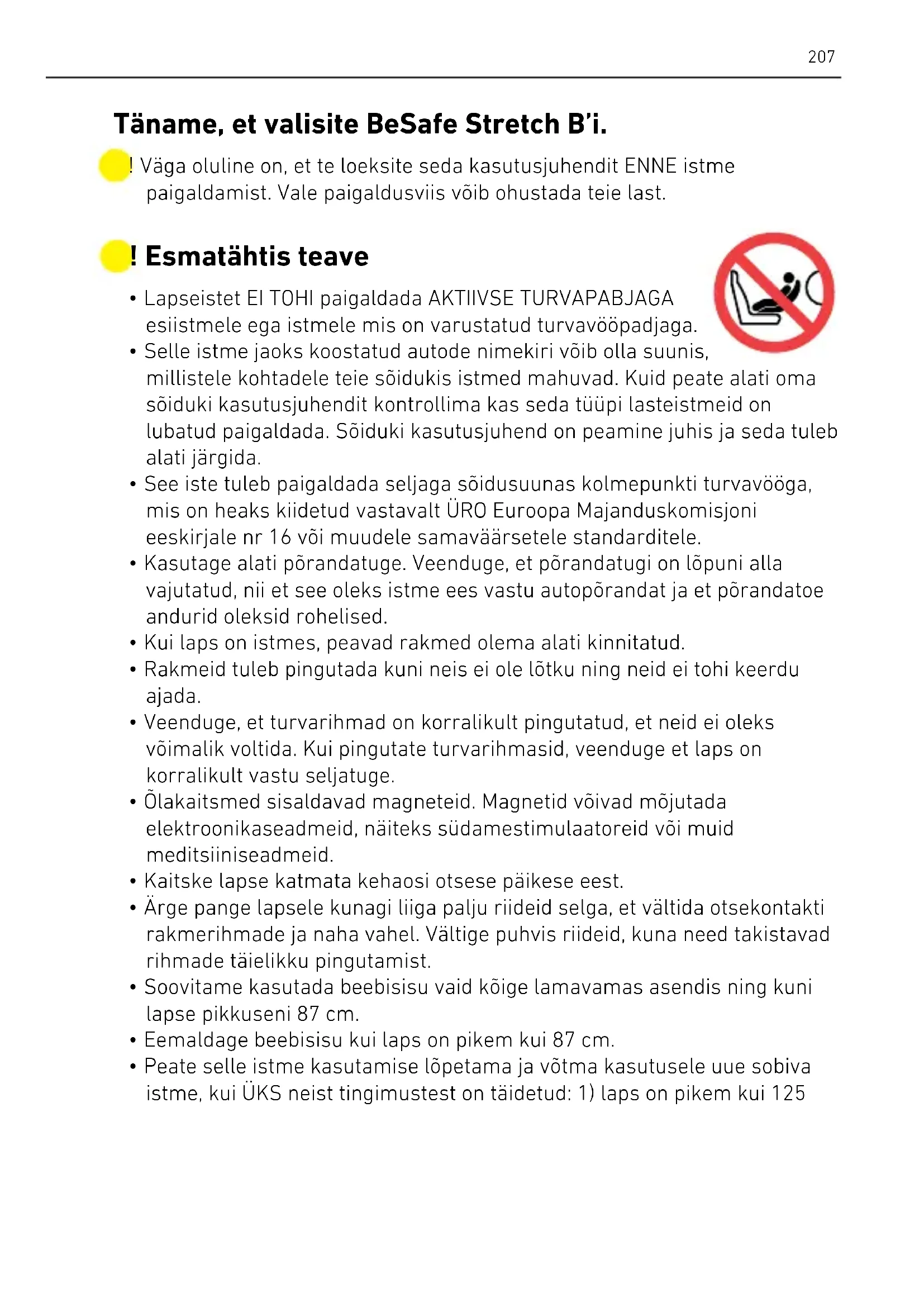 - Peate selle istme kasutamise lõpetama ja võtma kasutusele uue sobiva istme, kui ÜKS neist tingimustest on täidetud: 1) laps on pikem kui 125 ! Väga oluline on, et te loeksite seda kasutusjuhendit ENNE istme paigaldamist. Vale paigaldusviis võib ohustada teie last. Täname, et valisite BeSafe Stretch B’i.208 cm; 2) Laps sh. riided kaaluvad üle 36 kg; 3) õla kõrgus ületab õlavööde kõrgeima asendi; 4) Kõrvade ülaosa asub peatoe kõrgeimast asendist ülevalpool.