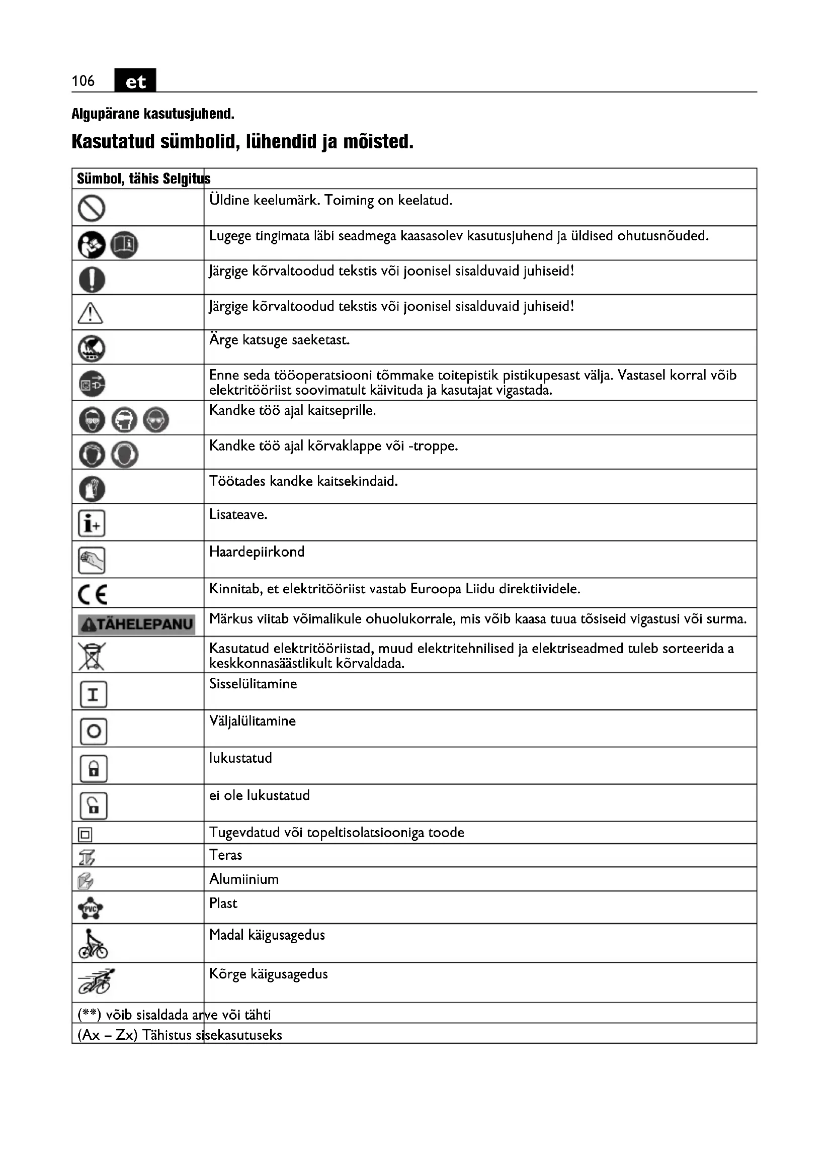 Algupärane kasutusjuhend. Kasutatud sümbolid, lühendid ja mõisted. Sümbol, tähis Selgitus Üldine keelumärk. Toiming on keelatud. Lugege tingimata läbi seadmega kaasasolev kasutusjuhend ja üldised ohutusnõuded. Järgige kõrvaltoodud tekstis või joonisel sisalduvaid juhiseid! Järgige kõrvaltoodud tekstis või joonisel sisalduvaid juhiseid! Ärge katsuge saeketast. Enne seda tööoperatsiooni tõmmake toitepistik pistikupesast välja. Vastasel korral võib elektritööriist soovimatult käivituda ja kasutajat vigastada. Kandke töö ajal kaitseprille. Kandke töö ajal kõrvaklappe või -troppe. Töötades kandke kaitsekindaid. Lisateave. Haardepiirkond Kinnitab, et elektritööriist vastab Euroopa Liidu direktiividele. Märkus viitab võimalikule ohuolukorrale, mis võib kaasa tuua tõsiseid vigastusi või surma. Kasutatud elektritööriistad, muud elektritehnilised ja elektriseadmed tuleb sorteerida a keskkonnasäästlikult kõrvaldada. Sisselülitamine Väljalülitamine lukustatud ei ole lukustatud Tugevdatud või topeltisolatsiooniga toode Teras Alumiinium Plast Madal käigusagedus Kõrge käigusagedus (**) võib sisaldada arve või tähti (Ax – Zx) Tähistus sisekasutuseks OBJ_DOKU-0000010832-001.fm Page 106 Friday, February 28, 2020 9:17 AM107
