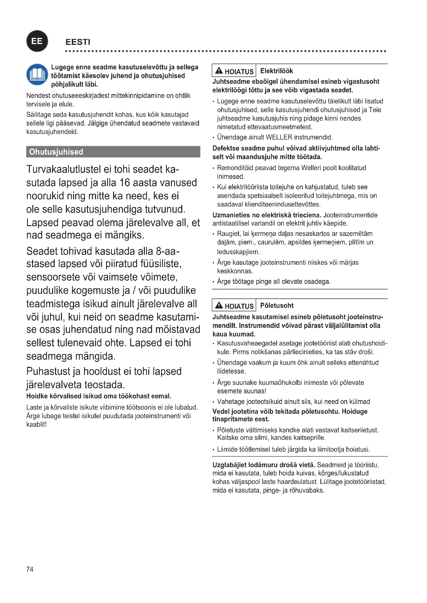 - rge viige süttivaid esemeid, vedelikke või gaase kuuma jooteinstrumendi lähedusse. Võrgukaablit tohib ühendada ainult selleks lubatud võrgupistikupesa või adapteriga. Kontrollige, kas võrgupinge vastab tüübisildil nõutavale. Ühendage seade pistikupessa ainult väljalülitatud olekus. Neizmantojiet kabeli tādiem mērķiem, kuriem tas nav paredzēts. Ärge tõstke seadet juhtmest. Neraujiet kabeli, lai izvilktu kontaktdakšu no kontaktligzdas. Sargājiet kabeli no karstuma, eļļas un asām malām Esiet uzmanīgs. Olge tähelepanelik. Olge töötamisel mõist- lik. Nelietojiet lodāmuru, ja nevarat koncentrēties. Centieties neieņemt neparastas ķermeņa pozas. Savu darba vietu iekārtojiet ergonomiski pareizi. Vältige töötamisel halba rühti, sest sellega võivad kaasneda rühiprobleemid. Jooteinstrumenti tohib kasutusele võtta ainult siis, kui see on tehniliselt laitmatus seisukorras. Kaitseseadmeid ei tohi välja lülitada. Tõrked ja defektid tuleb kõrvaldada kohe. Pärast seadme/ tööriista iga kasutuskorda tuleb kaitseseadmeid põhjalikult kontrollida laitmatu ja nõuetekohase toimimise suhtes. Veenduge, et liikuvad osad töötaksid laitmatult ega jääks kinni ning et osad ei oleks kahjustatud. Seadme laitmatu töö tagamiseks peavad kõik osad olema õigesti paigaldatud ja kõik tingimused täidetud. Kasutage õiget tööriista. Kasutage üksnes neid tarvikuid ja lisaseadmeid, mis on tarvikuloendis või millel on tootja kasutusluba. Kasutage WELLERi tarvikuid ja lisaseadmeid üksnes originaalsete WELLERi seadmetega. Teiste tootjate tööriistade ja tarvikute kasutamisega võib kaasneda vigas- tusoht. Fikseerige tööriist. Kasutage detaili kinnihoidmiseks kinni- tusseadmeid. Kasutage jooteaurude äratõmbeseadet. Kui saab ühenda- da jooteaurude äratõmbeseadmeid, veenduge, et need ühendataks ja et neid õigesti kasutataks. Kasutusotstarbele vastav käitamine WELLER WX jooteinstrumentide toiteplokk. Kasutage joote- jaama / lahtijootejaama / kuuma õhu jaama ainult kasutus- juhendis nimetatud otstarbel ehk siin kirjeldatud tingimustel jootmiseks ja lahtijootmiseks. HOIATUS Süttivaid gaase ega vedelikke ei tohi ltrida. Seadet tohib kasutada ainult ettenähtud ja korrektselt paigal- datud ltrikassettidega. Vahetage täis ltrikassetid. Seda seadet tohib kasutada üksnes toatemperatuuril ja siseruumides. Kaitske seadet niiskuse ja otsese päikeseki- irguse eest. WXSi kaugjuhtimine: Niipea, kui olete oma mobiilseadmesse installinud Weller WXSi rakenduse ja ühendanud selle Weller WXSi jaamaga, aktiveeritakse rakenduse kaudu kaugjuhtimine. Nüüd saate seadme kirjeldatud funktsioone kasutada oma mobiilseadmes oleva RAKENDUSE kaudu. Suunis: WXSi jaama vahetu juhtimine töötaja poolt ei ole prioriteetne rakenduse kaudu juhtimise suhtes. Mõlemad juhtimisvõimalused on samaväärsed. Seetõttu tuleb tagada, et võimaliku tahtmatu kaugjuurdepääsuga ra- kendusest ei ohustataks töötajat ega kahjustataks sisustust. Seetõttu soovitab Weller enne tööriista või otsiku vahetamist jaama välja lülitada, kasutades lülitit ON/OFF. Kui jooteinstrumente parajasti ei kasutata, tuleb need üldju- hul asetada selleks ette nähtud ohutushoidikusse. Sellega tagatakse, et ohtu pole. Kasutajarühmad Varieeruva riskitaseme ja ohupotentsiaali tõttu võivad mõnin- gaid töid teha vaid koolitatud spetsialistid. Töösamm Kasutajarühmad Jooteparameetrite spetsi- katsioon Tehnilise väljaõppega spet- sialistid Elektriliste varuosade paigaldamine Elektrikud Hooldusvälpade spetsi- katsioon Ohutustehnikud Käsitsemine Filtri vahetamine Tavainimesed Käsitsemine Filtri vahetamine Elektriliste varuosade paigaldamine Tehnilise koolitusega töötajad koolitatud spetsialisti juhenda- misel ja järelevalvel