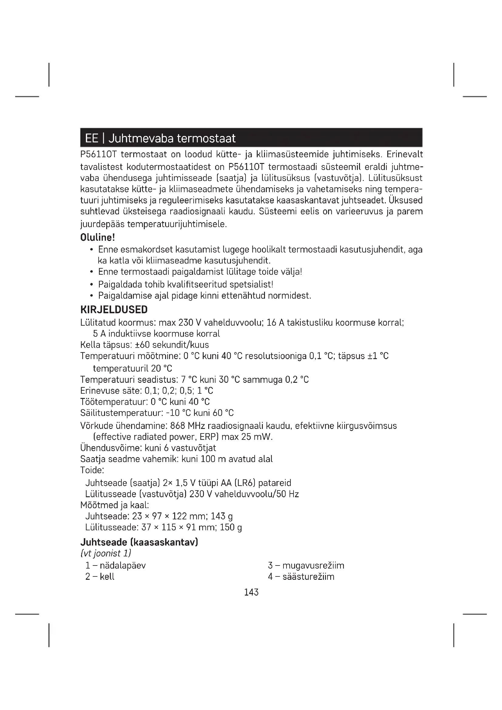 - Paigaldamise ajal pidage kinni ettenähtud normidest. KIRJELDUSED Lülitatud koormus: max 230 V vahelduvvoolu; 16 A takistusliku koormuse korral; 5 A induktiivse koormuse korral Kella täpsus: ±60 sekundit/kuus Temperatuuri mõõtmine: 0 °C kuni 40 °C resolutsiooniga 0,1 °C; täpsus ±1 °C temperatuuril 20 °C Temperatuuri seadistus: 7 °C kuni 30 °C sammuga 0,2 °C Erinevuse säte: 0,1; 0,2; 0,5; 1 °C Töötemperatuur: 0 °C kuni 40 °C Säilitustemperatuur: -10 °C kuni 60 °C Võrkude ühendamine: 868 MHz raadiosignaali kaudu, efektiivne kiirgusvõimsus (eective radiated power, ERP) max 25 mW. Ühendusvõime: kuni 6 vastuvõtjat Saatja seadme vahemik: kuni 100 m avatud alal Toide: Juhtseade (saatja) 2× 1,5 V tüüpi AA (LR6) patareid Lülitusseade (vastuvõtja) 230 V vahelduvvoolu/50 Hz Mõõtmed ja kaal: Juhtseade: 23 × 97 × 122 mm; 143 g Lülitusseade: 37 × 115 × 91 mm; 150 g Juhtseade (kaasaskantav) (vt joonist 1) 1 – nädalapäev 2 – kell 3 – mugavusrežiim 4 – säästurežiim144 5 – käsitsi juhtimine 6 – programmi eelsäte 7 – mugavus-/säästurežiimi lüliti 8 – nupp UP 9 – kellaaja muutmine 10 – programmi muutmine 11 – juhtmevaba side ikoon 12 – määratud temperatuur 13 – külmumise näidik 14 – tööoleku ikoon 15 – akuoleku näidik 16 – praegune toatemperatuur 17 – päevaproil 18 – nupp DOWN 19 – temperatuuri muutmine 20 – ekraani valgustus 21 – LÄHTESTAMINE Juhtseadme tagumise katte eemaldamine (vt joonist 2)