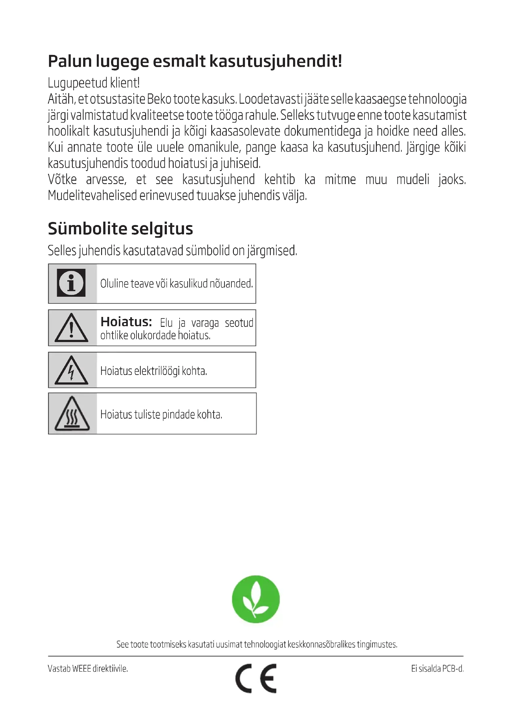 - Pakendage seade nii, et see ei saa transportimi- sel kahjustusi.Tai atitinka EEĮĄ direktyvą.Šis gaminys pagamintas naudojant naujausią technologiją aplinkai nekenksmingomis sąlygomis. Pirmiausia perskaitykite šią naudojimo instrukciją! Gerb. Pirkėjau, Ačiū, kad pasirinkote „Beko" gaminį. Tikimės, kad šiuo gaminiu, kuris buvo pagamintas naudojant aukščiausios kokybės moderniausią technologiją, liksite patenkinti. Prieš pradėdami naudoti šį prietaisą, perskaitykite visą šią naudojimo instrukciją bei prie jos pridedamus dokumentus ir juos pasilikite, jei prireiktų ateityje. Jeigu atiduotumėte šį gaminį kam nors kitam, kartu atiduokite ir šią naudojimo instrukciją. Vadovaukitės visais šiose naudojimo instrukcijose pateikiamais įspėjimais ir informacija. Atsiminkite, kad ši naudojimo instrukcija taip pat gali būti taikytina keletui kitų modelių. Šioje instrukcijoje nurodyta, kuo skiriasi įvairūs modeliai. Simbolių paaiškinimas Šioje naudojimo instrukcijoje naudojami šie simboliai: