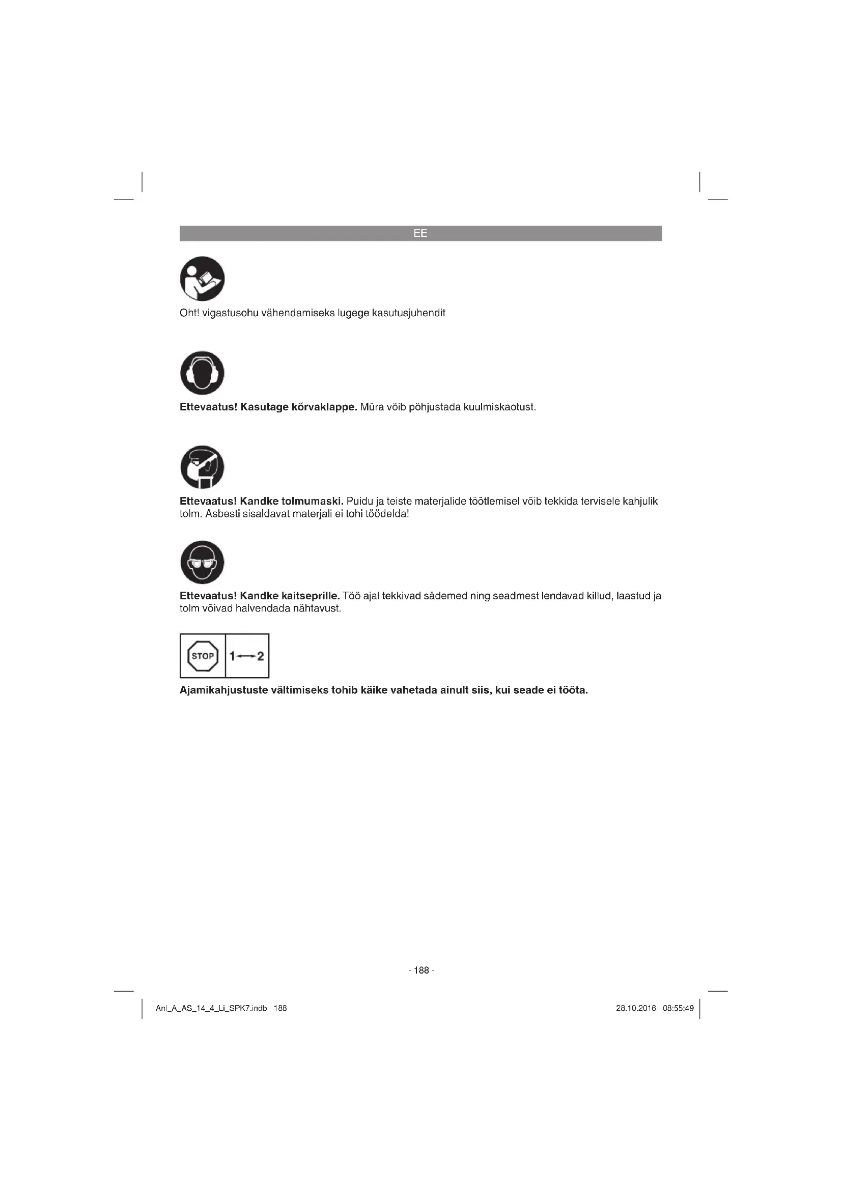 Oht! vigastusohu vähendamiseks lugege kasutusjuhendit Ettevaatus! Kasutage kõrvaklappe. Müra võib põhjustada kuulmiskaotust. Ettevaatus! Kandke kaitseprille. Töö ajal tekkivad sädemed ning seadmest lendavad killud, laastud ja tolm võivad halvendada nähtavust. Ettevaatus! Kandke tolmumaski. Puidu ja teiste materjalide töötlemisel võib tekkida tervisele kahjulik tolm. Asbesti sisaldavat materjali ei tohi töödelda! Ajamikahjustuste vältimiseks tohib käike vahetada ainult siis, kui seade ei tööta. Anl_A_AS_14_4_Li_SPK7.indb 188Anl_A_AS_14_4_Li_SPK7.indb 188 28.10.2016 08:55:4928.10.2016 08:55:49EE