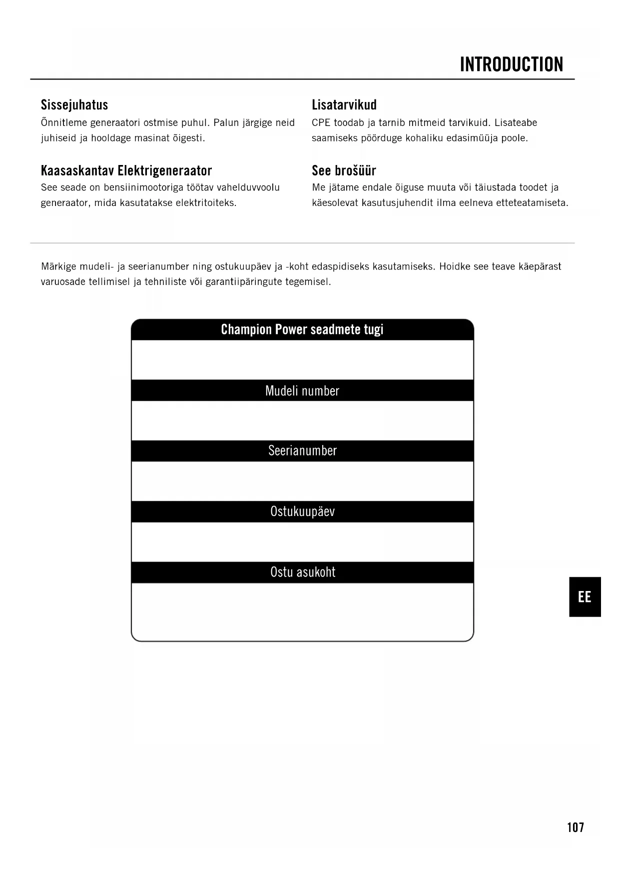 CPE garanteerib esialgsele ostjale, et mehaanilised ja elektrilised komponendid ei sisalda materjali- ja töödefekte kolme (3) aasta või 1000 tunni jooksul koduseks kasutamiseks, vastavalt sellele mis tuleb esimesena; või üks (1) aasta kaubanduslikuks ja tööstuslikuks kasutamiseks või 1000 tundi, vastavalt sellele mis tuleb esimesena. Selle garantii alusel remondiks või asendamiseks esitatud toote transpordikulud on ostja ainuvastutusel. See garantii kehtib ainult esialgse ostja kohta ja ei ole ülekantav. Täielike Garantiitingimuste vaatamiseks palun külastage www.championpowerequipment.co.uk.