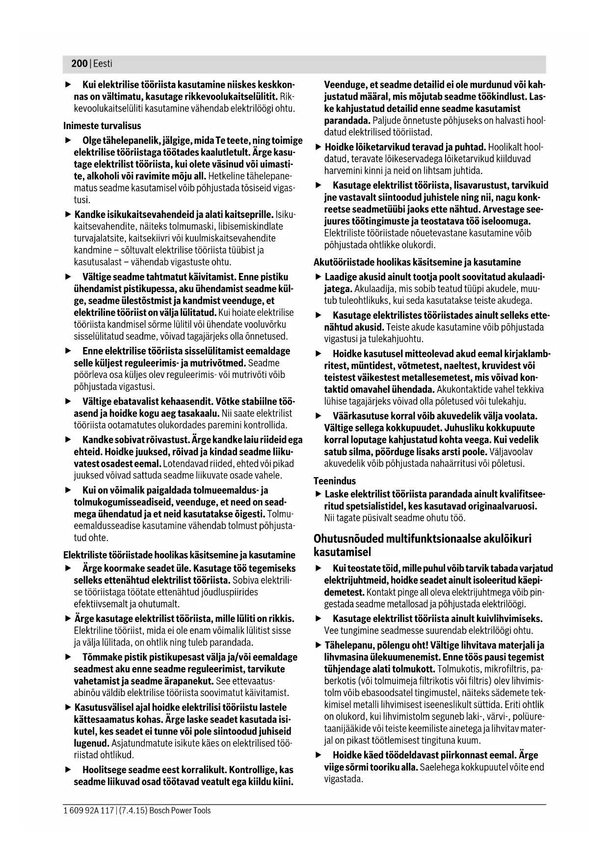 OBJ_BUCH-1808-002.book Page 203 Tuesday, April 7, 2015 4:33 PM204 | Eesti 1 609 92A 117 | (7.4.15) Bosch Power Tools Tolmu/saepuru äratõmme Pliisisaldusega värvide, teatud puiduliikide, mineraalide ja metalli tolm võib kahjustada tervist. Tolmuga kokkupuude ja tolmu sissehingamine võib põhjustada seadme kasutajal või läheduses viibivatel inimestel allergilisi reaktsioone ja/ või hingamisteede haigusi. Teatud tolm, näiteks tamme- ja pöögitolm, on vähkitekita- va toimega, iseäranis kombinatsioonis puidutöötlemisel kasutatavate lisaainetega (kromaadid, puidukaitsevahen- did). Asbesti sisaldavat materjali tohivad töödelda üksnes vastava ala asjatundjad. – Kasutage konkreetse materjali eemaldamiseks sobivat tolmuimejat. – Tagage töökohas hea ventilatsioon. – Soovitav on kasutada hingamisteede kaitsemaski filtriga P2. Pidage kinni töödeldavate materjalide suhtes Teie riigis kehtivatest eeskirjadest. Vältige tolmu kogunemist töökohta. Tolm võib kergesti süttida. Tolmuimeja ühendamine (vt joonist A) Lihvimisel ühendage seadmega alati tolmuimeja. Tolmueemaldusseadise 17 (lisatarvik) paigaldamiseks ee- maldage tarvik. Monteerige tolmueemaldusseadise 17 osad joonisel näidatud viisil kokku. Asetage kokkumonteeritud tolmueemaldussea- dis tarvikukinnitusel 9 seadmele. Keerake tolmueemaldus- seadist nii, et tolmueemaldusseadise nukid fikseeruvad kor- puse vastavatesse avadesse. Kinnitage tolmueemaldusseadis joonisel näidatud viisil kinnitusklambriga 15 seadme külge. Veenduge, et viltrõngas 14 on terve ja tihedalt vastu lihvtalda