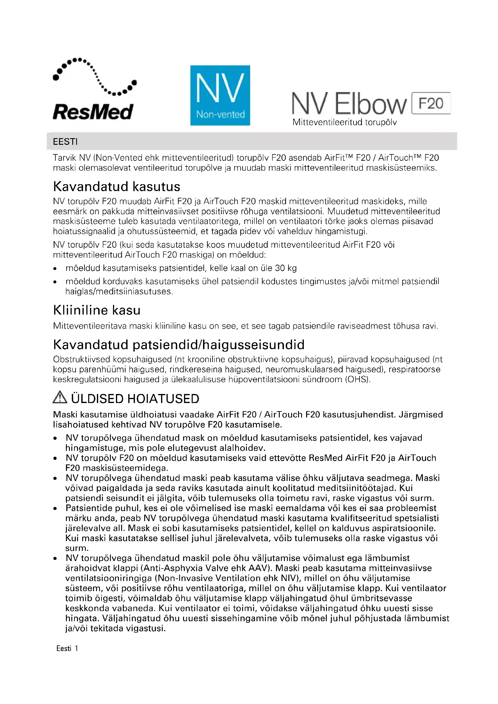 - mõeldud korduvaks kasutamiseks ühel patsiendil kodustes tingimustes ja/või mitmel patsiendil haiglas/meditsiiniasutuses. Kliiniline kasu Mitteventileeritava maski kliiniline kasu on see, et see tagab patsiendile raviseadmest tõhusa ravi. Kavandatud patsiendid/haigusseisundid Obstruktiivsed kopsuhaigused (nt krooniline obstruktiivne kopsuhaigus), piiravad kopsuhaigused (nt kopsu parenhüümi haigused, rindkereseina haigused, neuromuskulaarsed haigused), respiratoorse keskregulatsiooni haigused ja ülekaalulisuse hüpoventilatsiooni sündroom (OHS). ÜLDISED HOIATUSED Maski kasutamise üldhoiatusi vaadake AirFit F20 / AirTouch F20 kasutusjuhendist. Järgmised lisahoiatused kehtivad NV torupõlve F20 kasutamisele.
