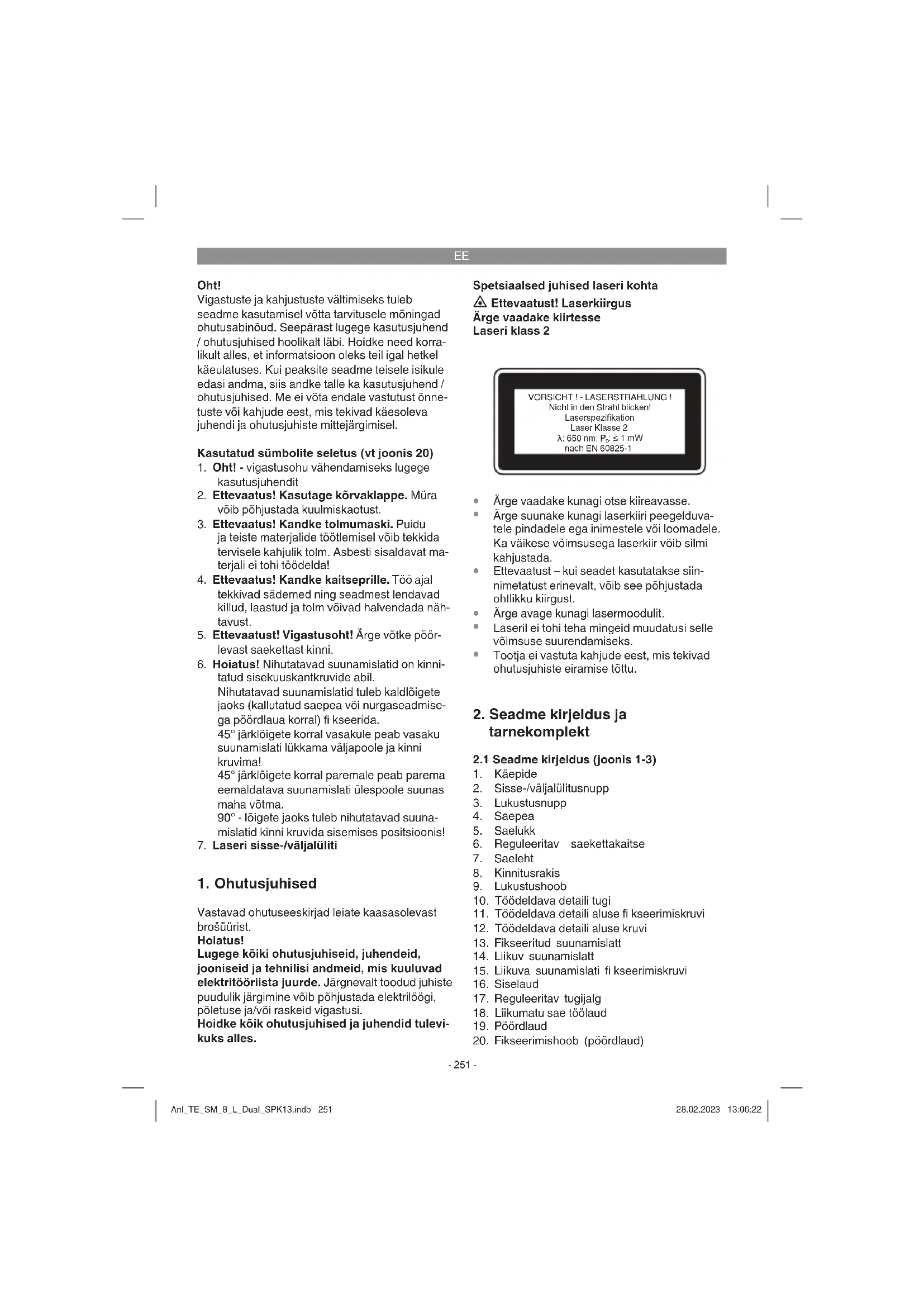 Vastavad ohutuseeskirjad leiate kaasasolevast brošüürist. Hoiatus! Lugege kõiki ohutusjuhiseid, juhendeid, jooniseid ja tehnilisi andmeid, mis kuuluvad elektritööriista juurde. Järgnevalt toodud juhiste puudulik järgimine võib põhjustada elektrilöögi, põletuse ja/või raskeid vigastusi. Hoidke kõik ohutusjuhised ja juhendid tulevi- kuks alles. Spetsiaalsed juhised laseri kohta Ettevaatust! Laserkiirgus Ärge vaadake kiirtesse Laseri klass 2 VORSICHT ! - LASERSTRAHLUNG ! Nicht in den Strahl blicken! Laserspezifikation Laser Klasse 2 Ǹ: 650 nm; P