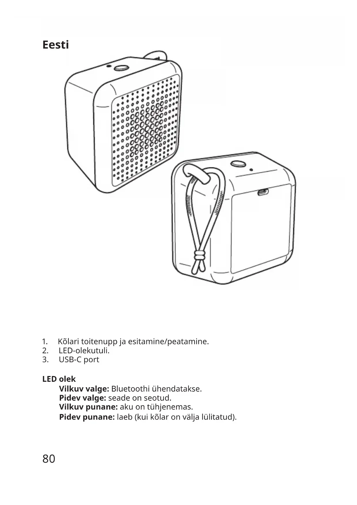 LED olek Vilkuv valge:Bluetoothiühendatakse. Pidev valge:seadeonseotud. Vilkuv punane:akuontühjenemas. Pidev punane:laeb(kuikõlaronväljalülitatud). Eesti81 Alustamine ÜhendaUSB-C-kaabelsisendportijateineotstoiteallikaga(arvutivõi toiteplokiga),etlaadidatoodetenneesimestkasutamistjaalati,kuiLED vilgubpunaselt,misnäitabtühjenevatakut.LaadimiseajaljääbLED-tuli punaseltpõlema,kuikõlaronväljalülitatud,jalülitubvälja,kuiakuon täielikultlaetud. Soovitatav toiteplokk: 5.0VDC,1.0A(eikuulukomplekti) Kõlari funktsioonid Sisse-/väljalülitamine Kõlarisisse-javäljalülitamiseksvajutaninghoiaalltoitenuppu(1). Esitamine/peatamine Lühiketoitenupuvajutusesitabvõipeatabmuusika. Automaatneväljalülitamine Kuikõlareioleühegiseadmegaseotud,lülitubsee5minutipärast automaatseltvälja.Kuikõlaronseotud,kuidmuusikateiesitata, lülitubsee20minutipärastautomaatseltvälja. Bluetoothi sidumine KõlarisidumiseksallikaseadmegapeabkõlarolemaBluetoothi sidumisrežiimis.SidumiseksavaomalähteseadmesBluetoothisätejaloo ühendusseadmega„VAPPEBYPortable“. KõlarlülitubautomaatseltBluetoothisidumisrežiimi,kuiseeesimest kordasisselülitatakse,jaigakord,kuivaremseotudseadeteileita. Tehasesätete taastamine EelmisteBluetoothisidumisteeemaldamisekslähtestakõlar,vajutadesja hoidesallnuppu(1)rohkemkui5sekundit.Tehaselähtestamistkinnitab punaseltvilkuvLED-tulijakostubheli. TeisevõimalusenaavalähteseadmeBluetoothimenüüjakatkesta sidumine.82 Stereo sidumine: KahteVAPPEBYkaasaskantavatsaabstereosiduda: 1.Veendu,etmõlemadkõlaridoleksidBluetoothiotsingurežiimis. 2.Vajutatopeltühekõlaritoitenuppu.Stereosidumisekinnitabheli. 3.Looühenduslähteseadmega,järgidesBluetoothisidumisjuhiseid. Tasubteada