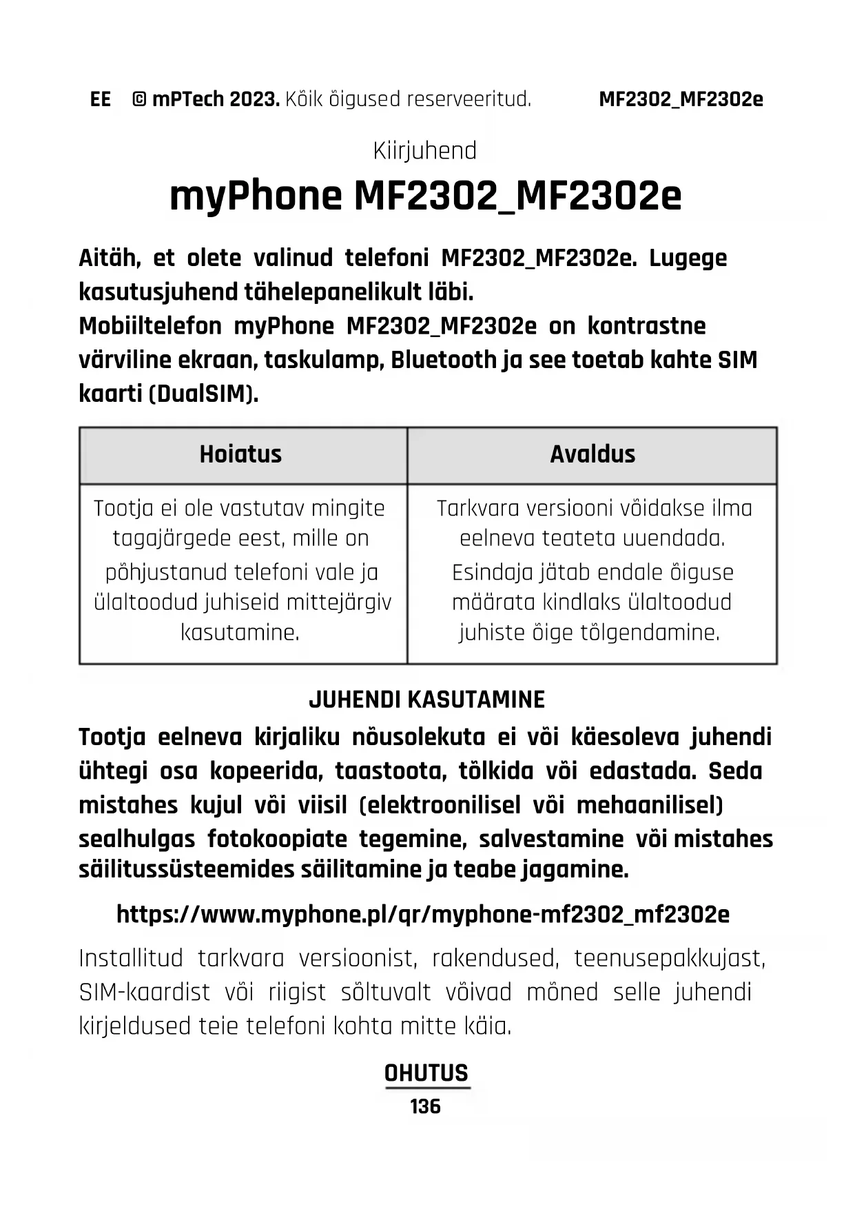 Aitäh, et olete valinud Telefoni MF2302_MF2302e. Lugege kasutusjuhend tahelepanelikult läbi.
