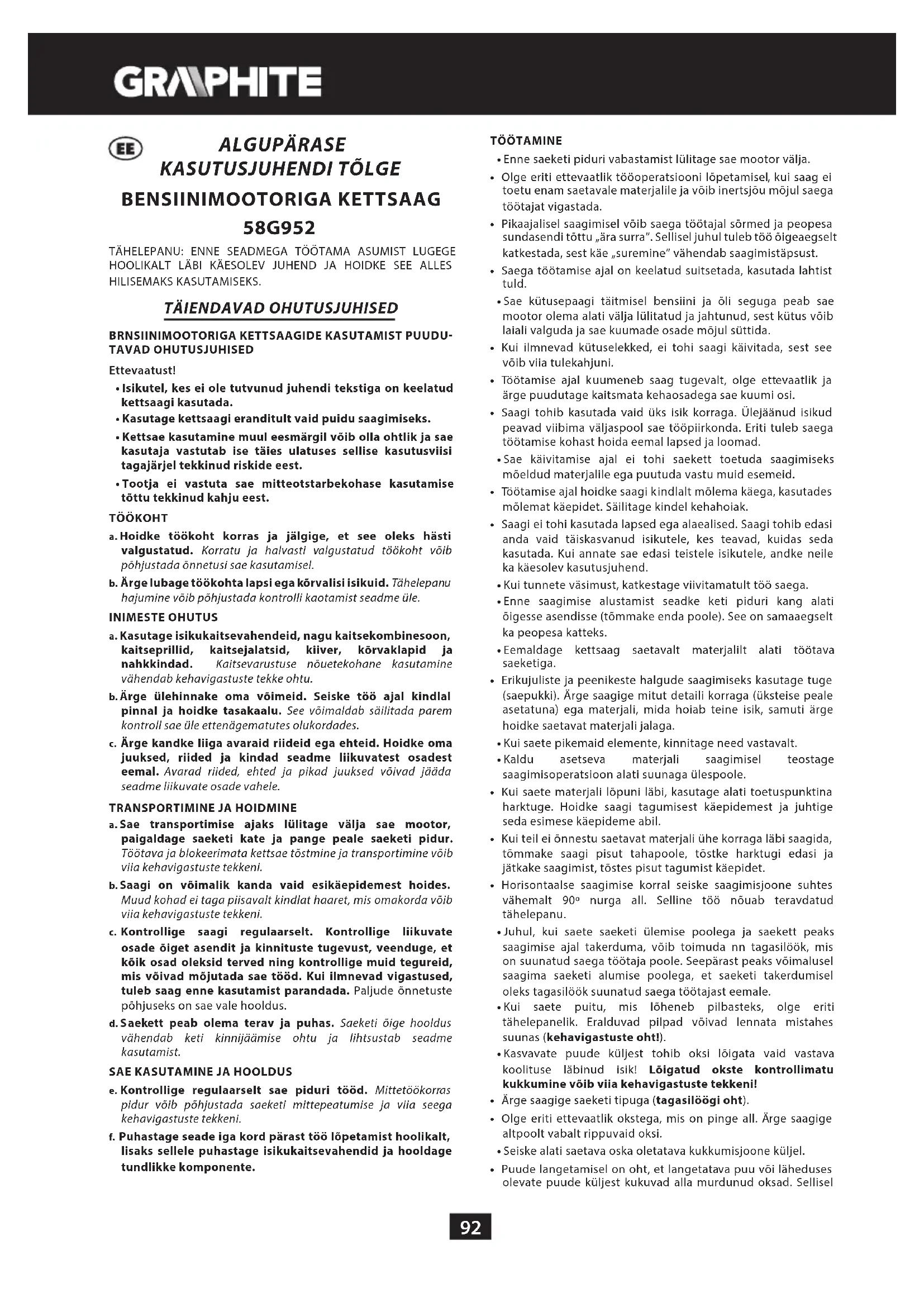 - Pidage saega töötamisel alati kinni ohutusjuhistest.