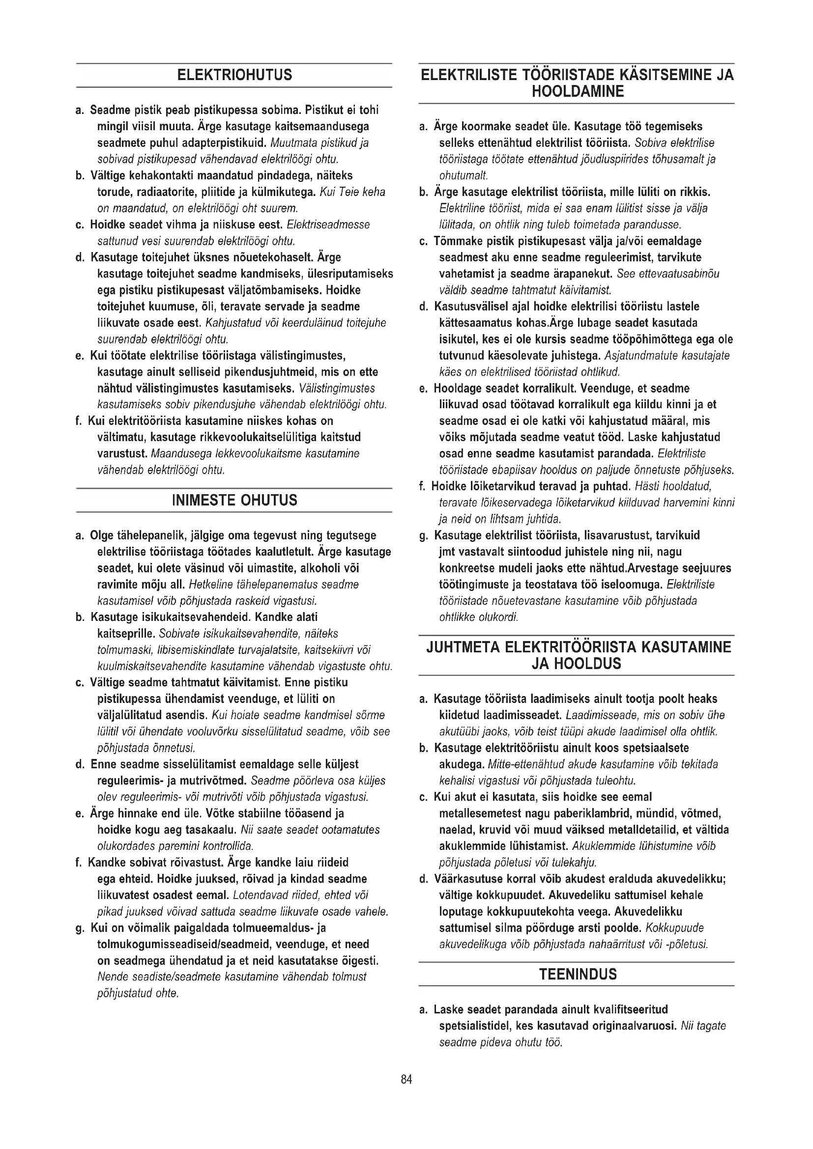 HOOLDAMINE a. Ärge koormake seadet üle. Kasutage töö tegemiseks selleks ettenähtud elektrilist tööriista. Sobiva elektrilise tööriistaga töötate ettenähtud jõudluspiirides tõhusamalt ja ohutumalt. b. Ärge kasutage elektrilist tööriista, mille lüliti on rikkis. Elektriline tööriist, mida ei saa enam lülitist sisse ja välja lülitada, on ohtlik ning tuleb toimetada parandusse. c. Tõmmake pistik pistikupesast välja ja/või eemaldage seadmest aku enne seadme reguleerimist, tarvikute vahetamist ja seadme ärapanekut. See ettevaatusabinõu väldib seadme tahtmatut käivitamist. d. Kasutusvälisel ajal hoidke elektrilisi tööriistu lastele kättesaamatus kohas.Ärge lubage seadet kasutada isikutel, kes ei ole kursis seadme tööpõhimõttega ega ole tutvunud käesolevate juhistega. Asjatundmatute kasutajate käes on elektrilised tööriistad ohtlikud. e. Hooldage seadet korralikult. Veenduge, et seadme liikuvad osad töötavad korralikult ega kiildu kinni ja et seadme osad ei ole katki või kahjustatud määral, mis võiks mõjutada seadme veatut tööd. Laske kahjustatud osad enne seadme kasutamist parandada. Elektriliste tööriistade ebapiisav hooldus on paljude õnnetuste põhjuseks. f. Hoidke lõiketarvikud teravad ja puhtad. Hästi hooldatud, teravate lõikeservadega lõiketarvikud kiilduvad harvemini kinni ja neid on lihtsam juhtida. g. Kasutage elektrilist tööriista, lisavarustust, tarvikuid jmt vastavalt siintoodud juhistele ning nii, nagu konkreetse mudeli jaoks ette nähtud.Arvestage seejuures töötingimuste ja teostatava töö iseloomuga. Elektriliste tööriistade nõuetevastane kasutamine võib põhjustada ohtlikke olukordi.